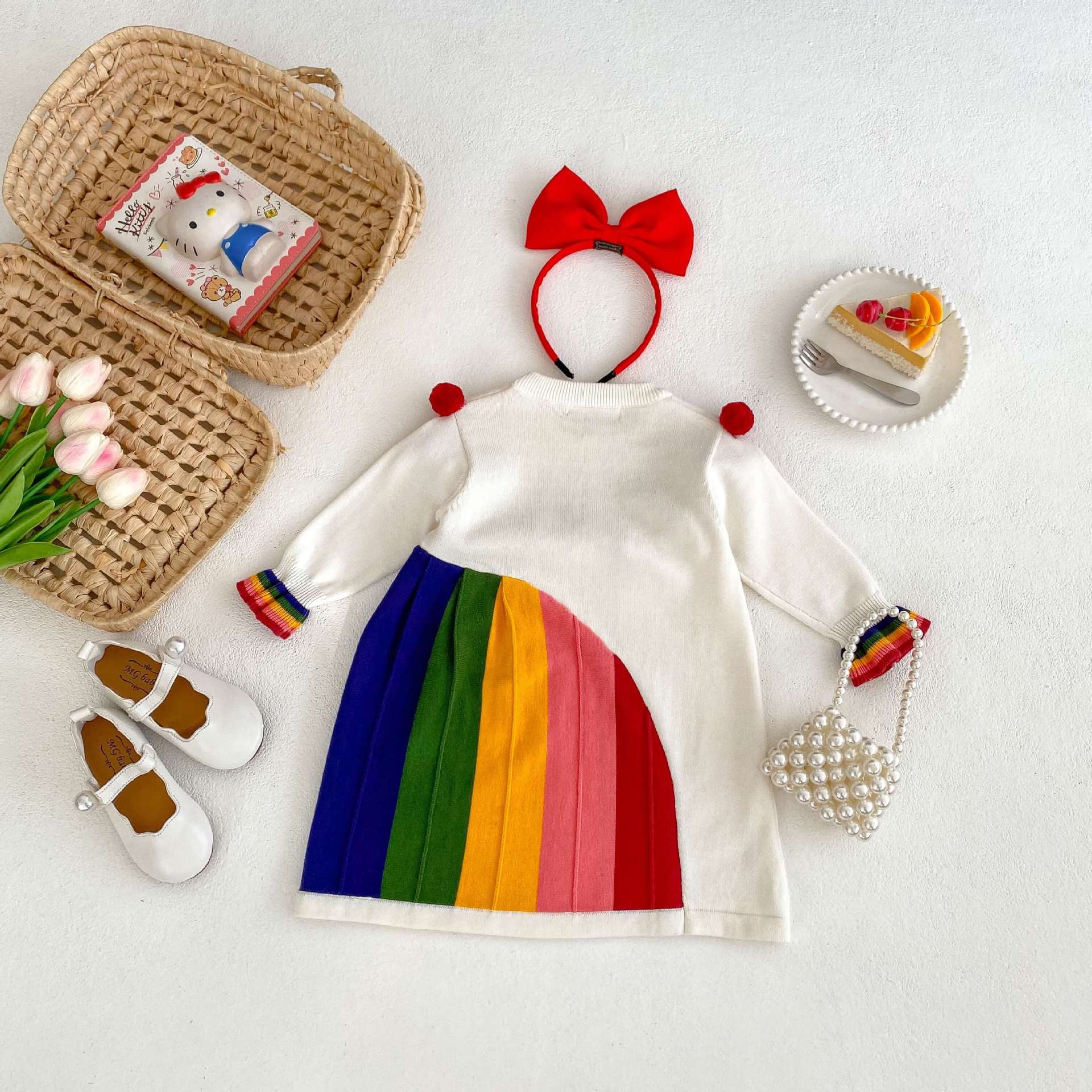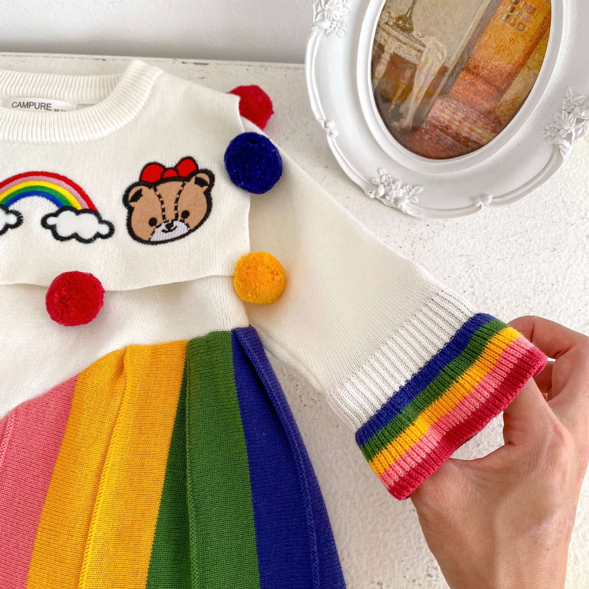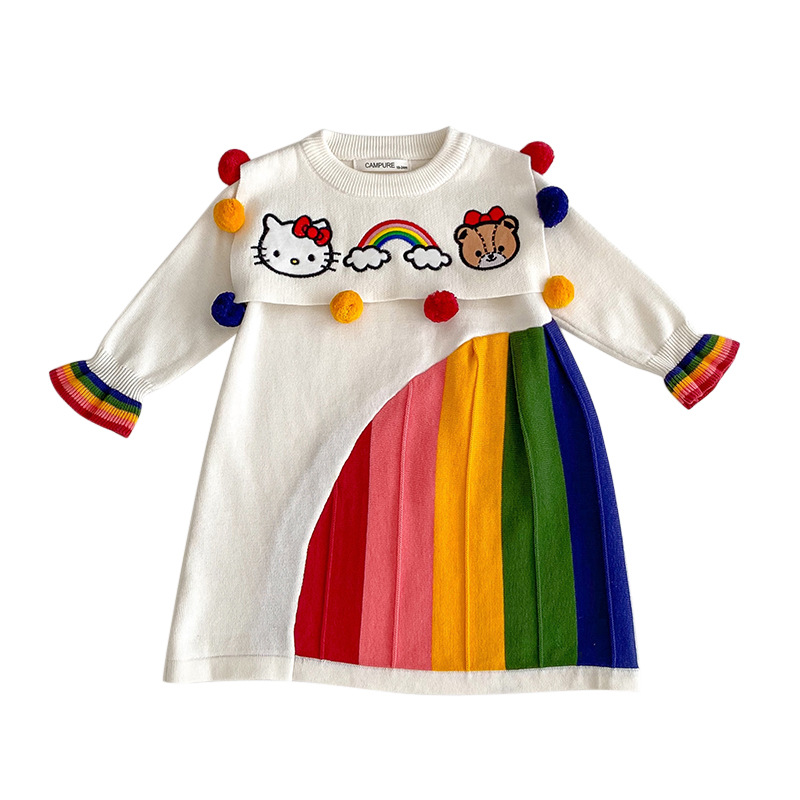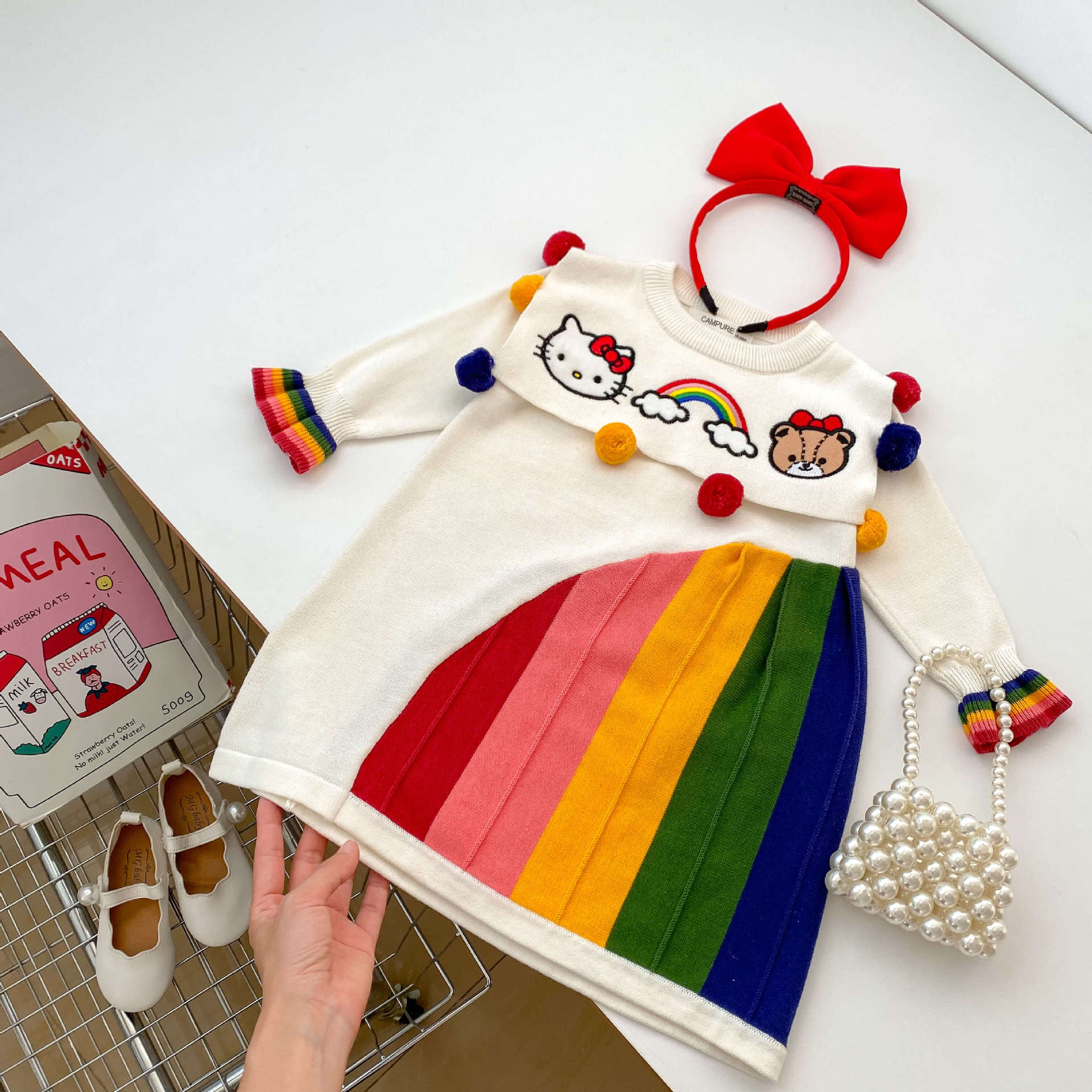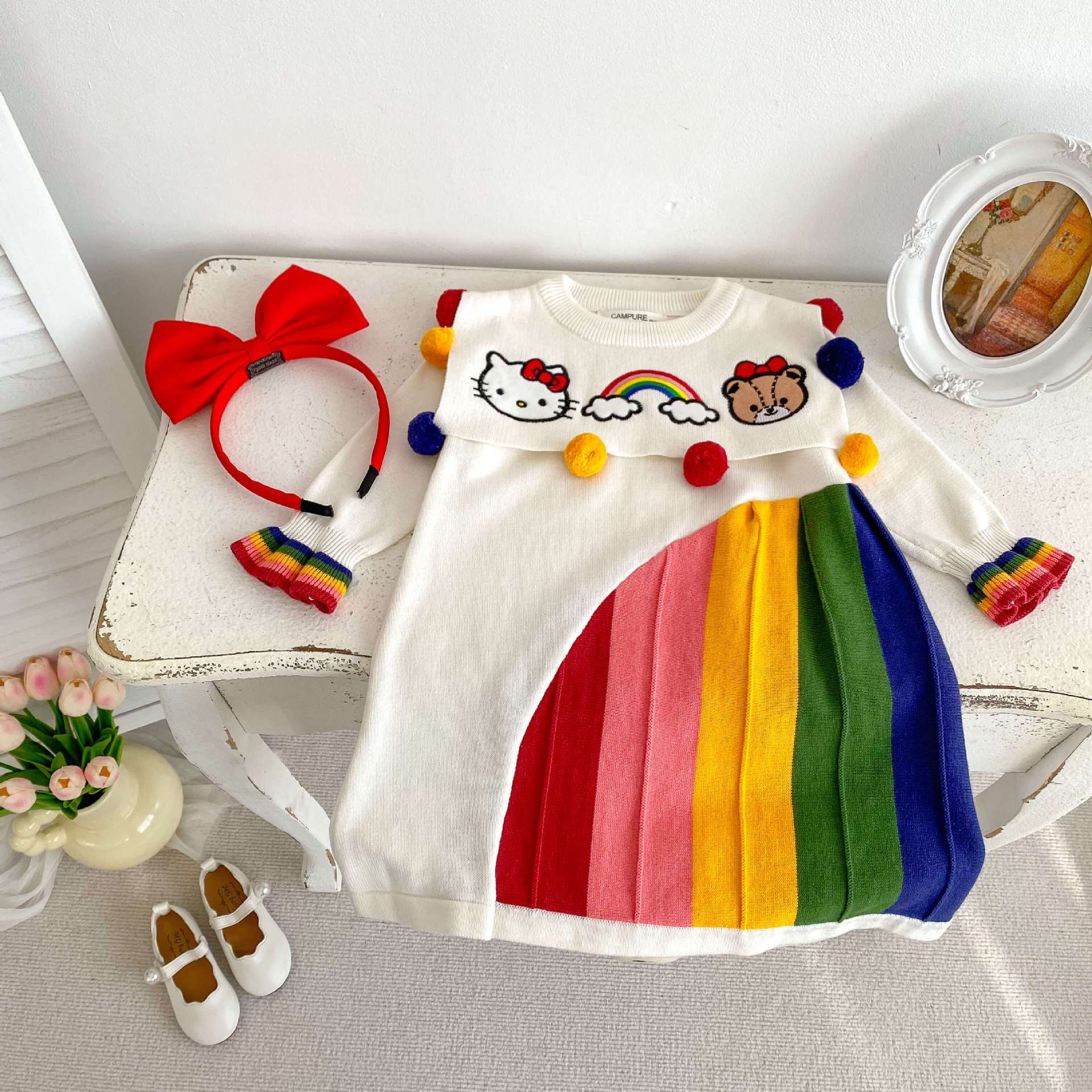 2024 소녀 가을 겨울 원피스 도파민 컬러 KT 고양이 스웨터 원피스 옷깃 모피 공 긴 소매 니트 스커트스토어 가기
