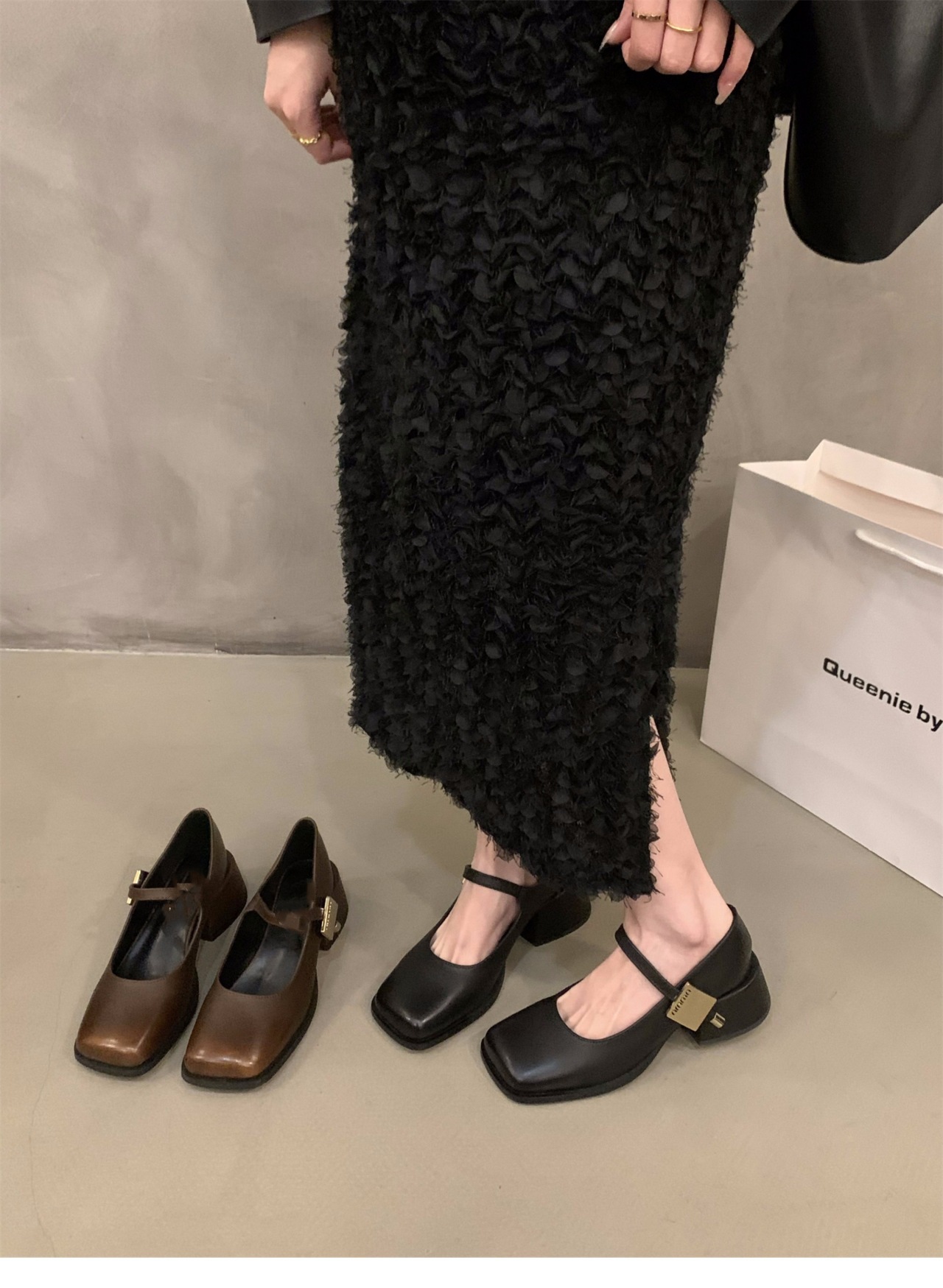 프랑스 스타일의 작은 골드 버클 스퀘어 토 메리 제인 작은 가죽 신발 여성 2024 봄 새로운 매칭 스커트 블랙 청키 힐 싱글 레이어 신발스토어 가기