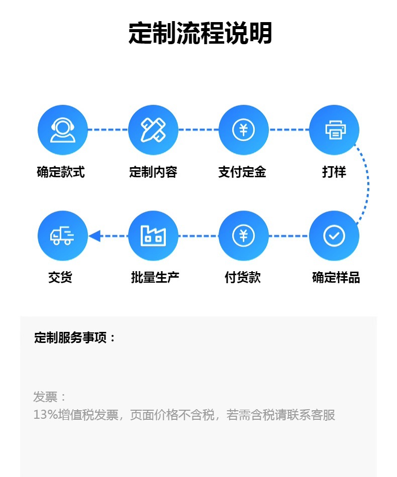 4.定制流程:咨询—报价—制图—送样(或工厂打样)—确认样品—下单生产