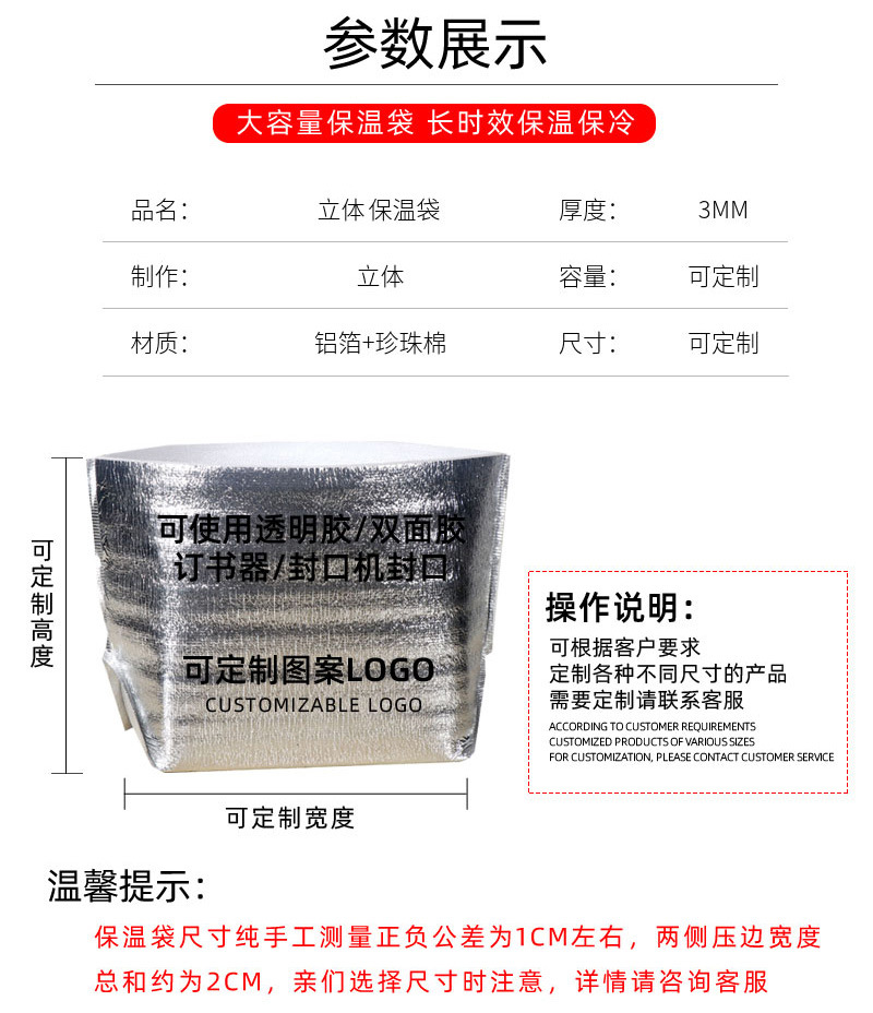 두꺼운 일회용 테이크아웃 알루미늄 호일 단열 가방 접이식 대형 신선 식품 특급 포장 냉장 아이스백