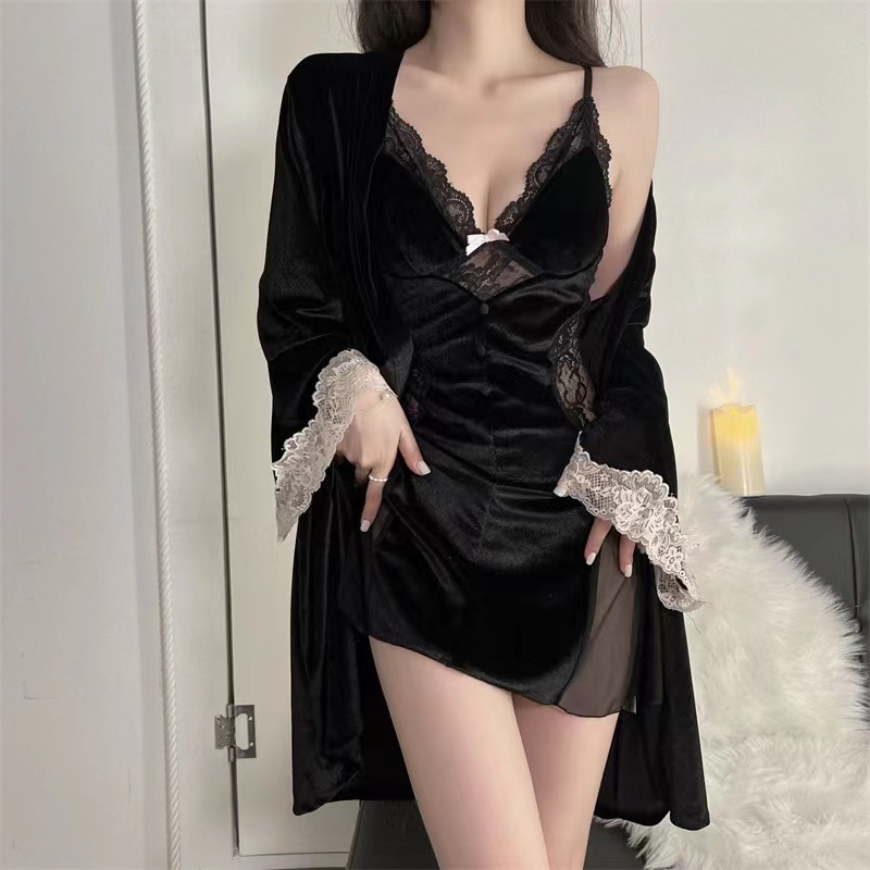 가슴 패드 여성의 섹시한 레이스 할로우 슬링 Nightdress 가운 황금 벨벳 홈 옷을 입은 고급 순수한 욕망 24 개