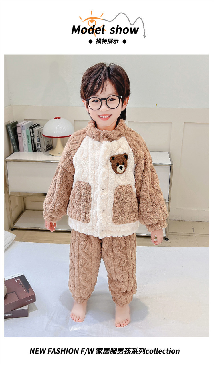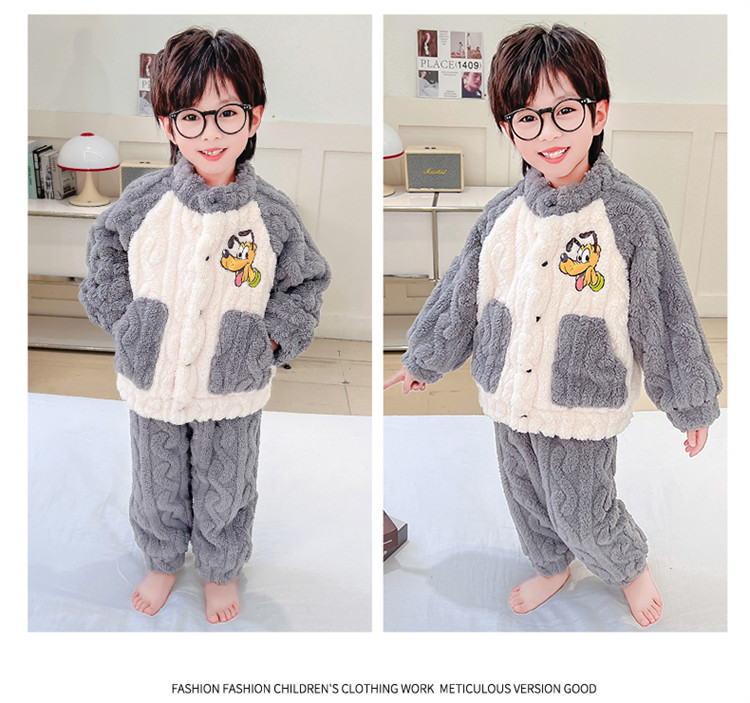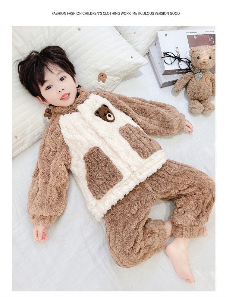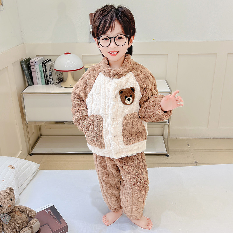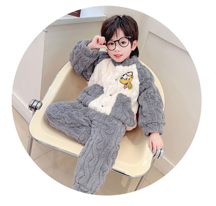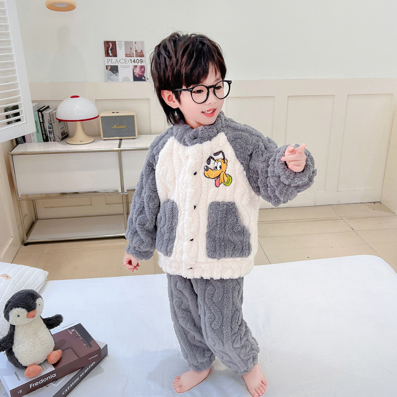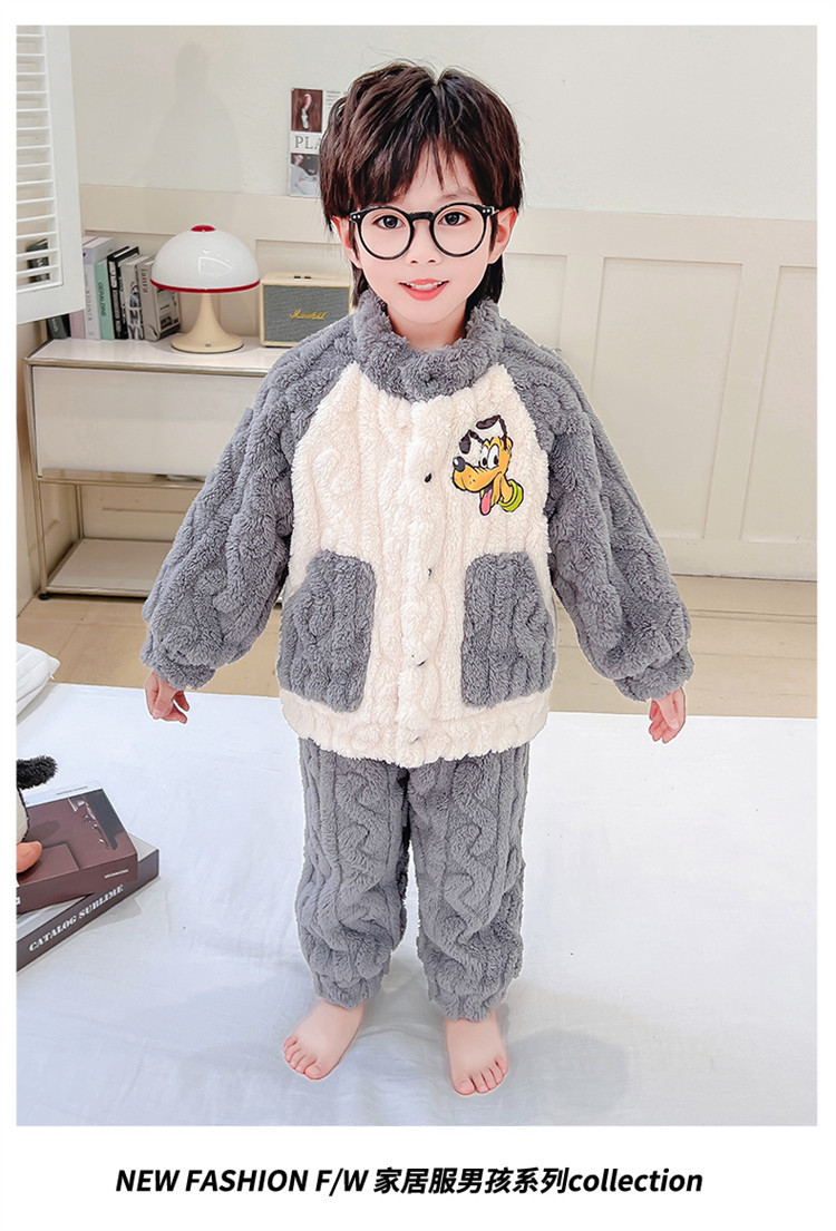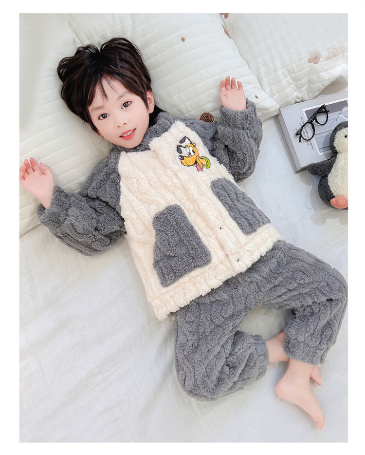 소년의 잠옷 산호 양털 카디건 가을과 겨울 소년 만화 더블 레이어 홈 웨어는 아이들의 두꺼운 플란넬 겨울을 세트