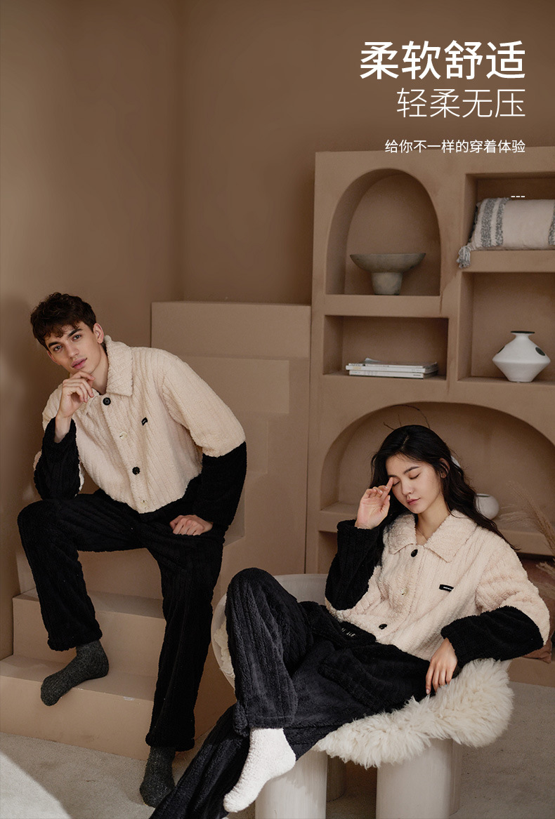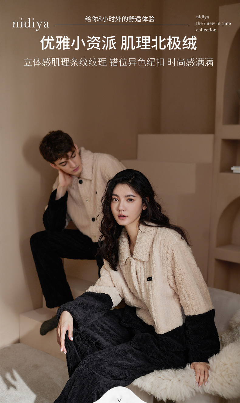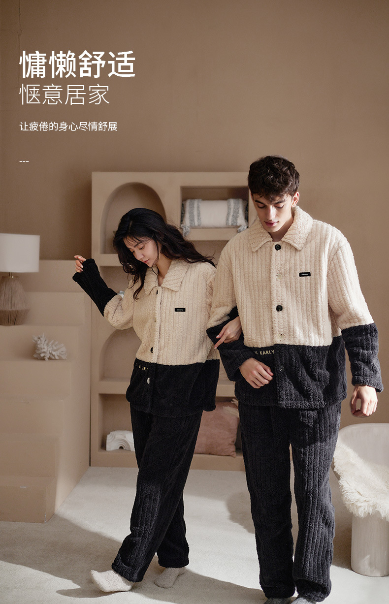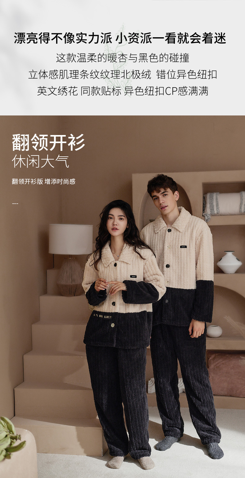 Nidiya 새로운 커플 잠옷 여성의 가을과 겨울 산호 양털 옷깃 카디건 남성용 간단한 줄무늬 홈웨어 세트스토어 가기