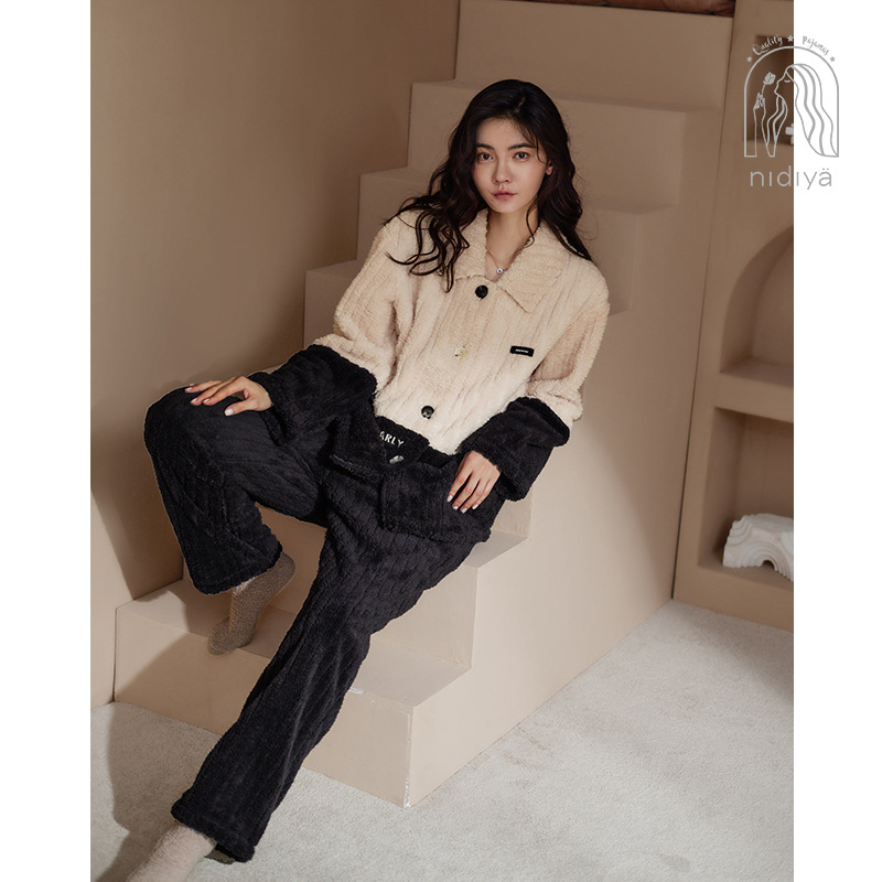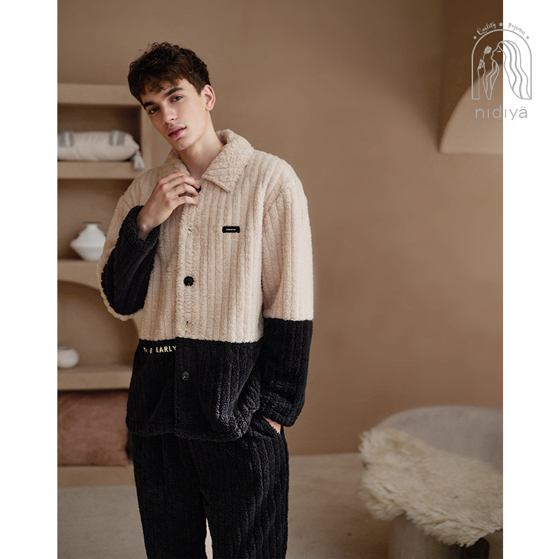 Nidiya 새로운 커플 잠옷 여성의 가을과 겨울 산호 양털 옷깃 카디건 남성용 간단한 줄무늬 홈웨어 세트