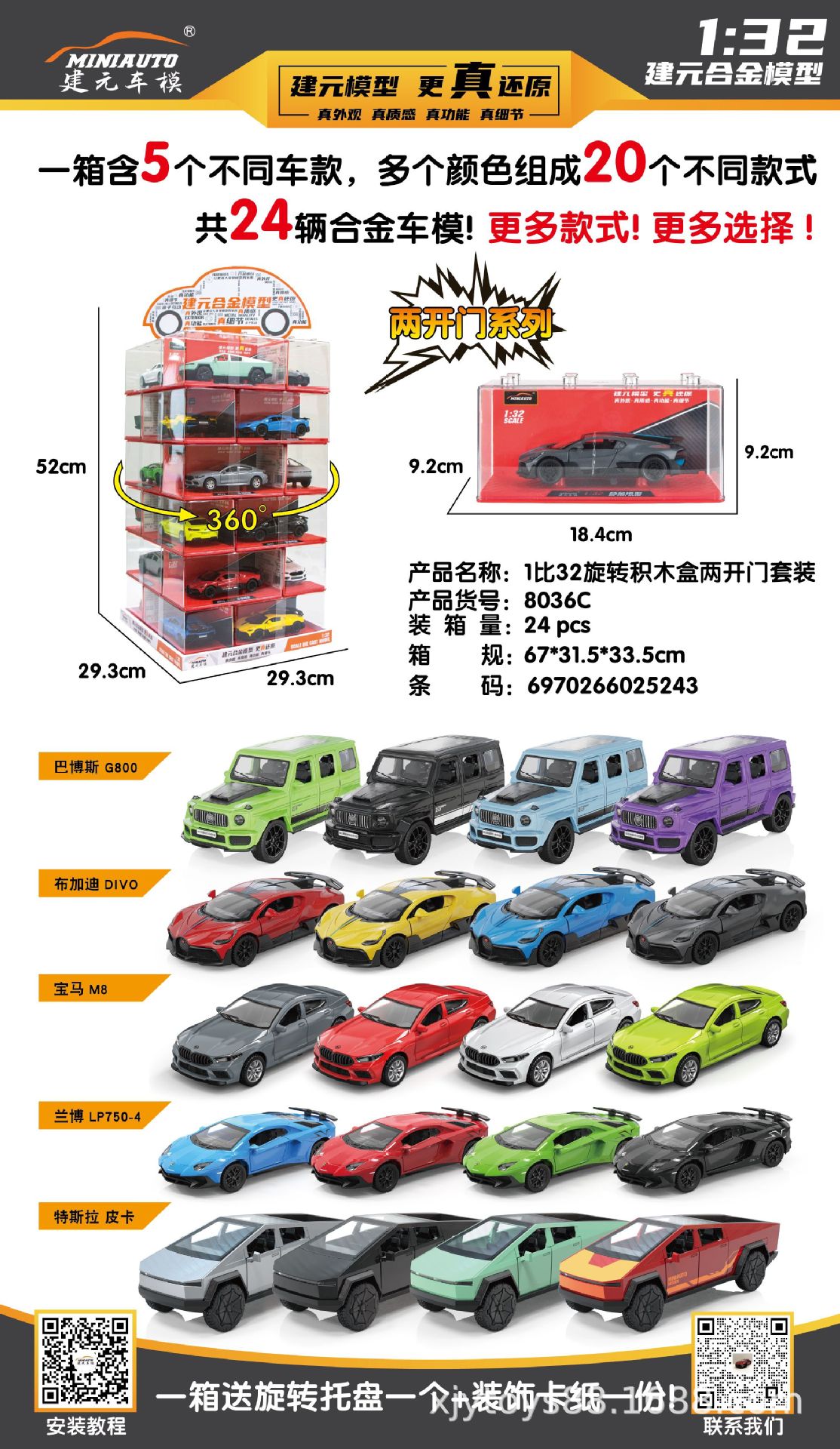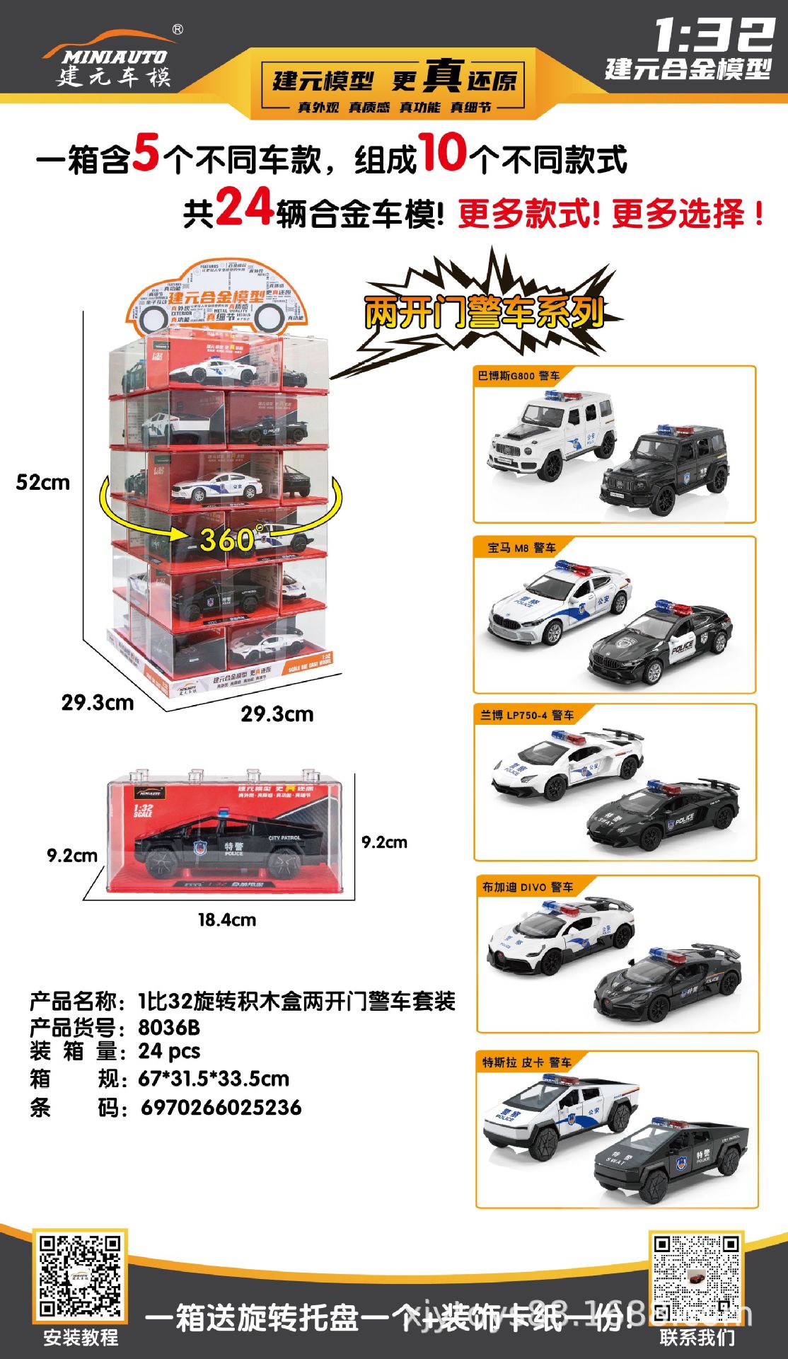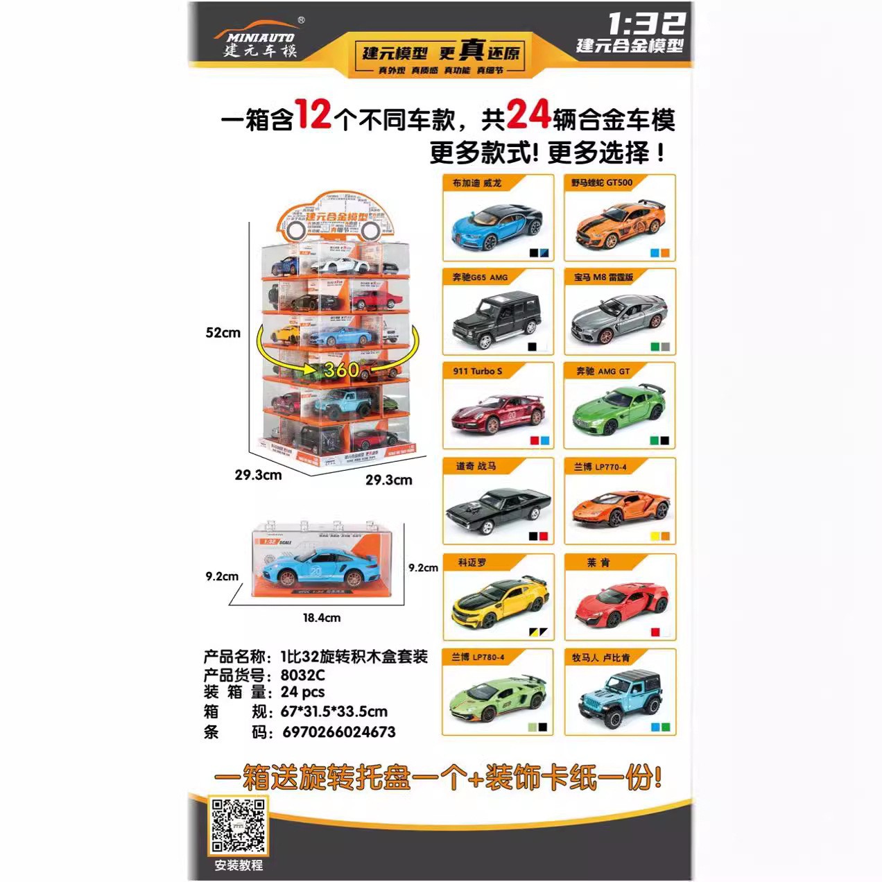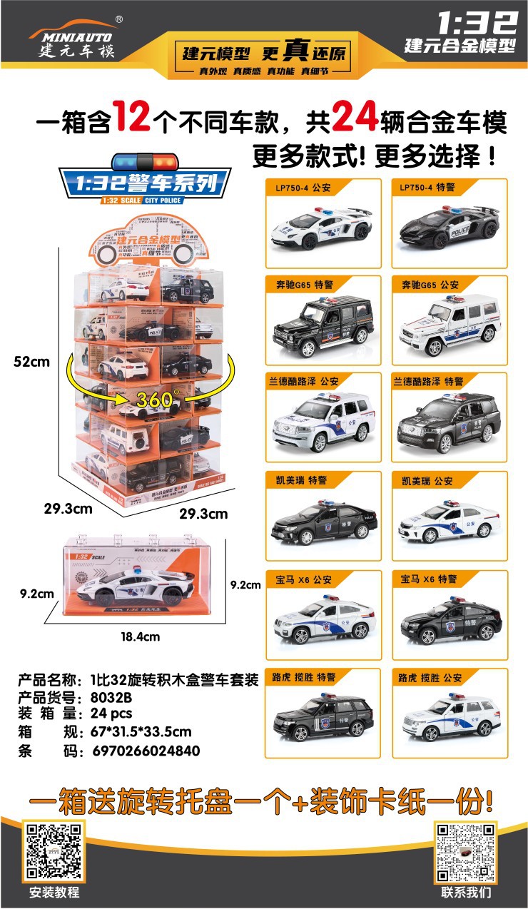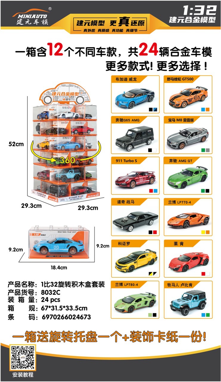 说明:此车模为正版建元合金车模型,比列大小分别为1:24 1:36 1:32,一套为24辆,12个车型,每款车型2个颜色,具体车型见详图,每辆都有独力的压克力盒包装。下单数量满12台可发12个车型,颜色随机,不赠送旋转底盘 (特殊要求请先咨询旺旺0K后再下单)