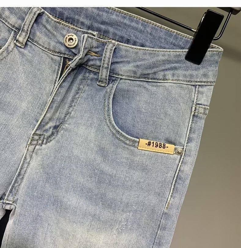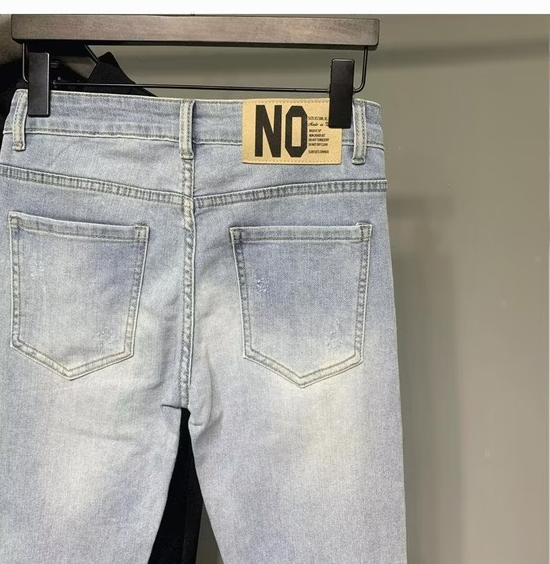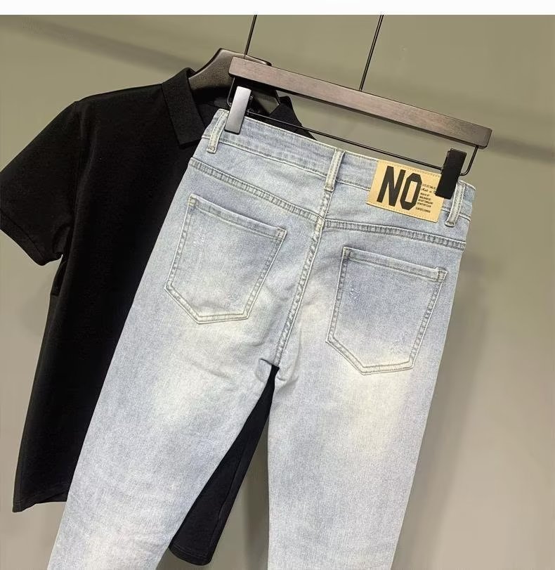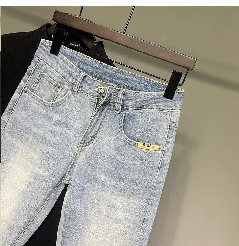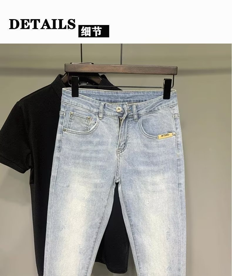 라이트 블루 씻은 청바지 남자 한국 스타일 슬림 핏 스트레치 스키니 팬츠 2024 봄과 가을 남자 하렘 바지스토어 가기