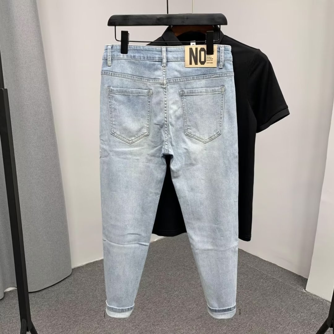 라이트 블루 씻은 청바지 남자 한국 스타일 슬림 핏 스트레치 스키니 팬츠 2024 봄과 가을 남자 하렘 바지