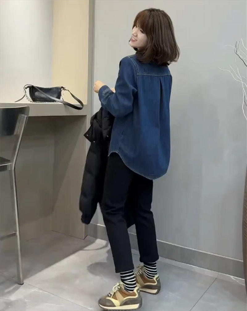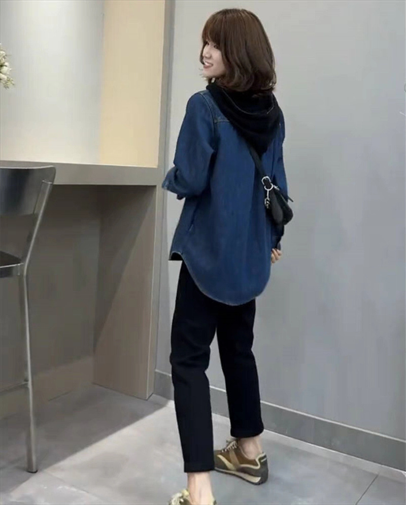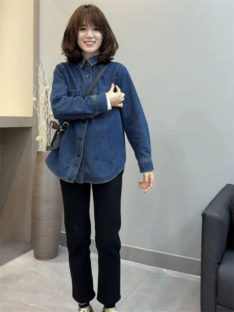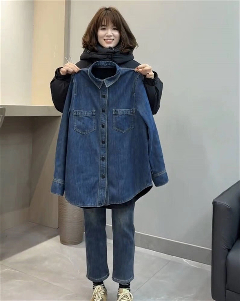 기모 두꺼운 데님 셔츠 코트 여성의 긴 소매 2023 가을과 겨울 새로운 느슨한 캐주얼 셔츠 다목적 슬리밍 탑