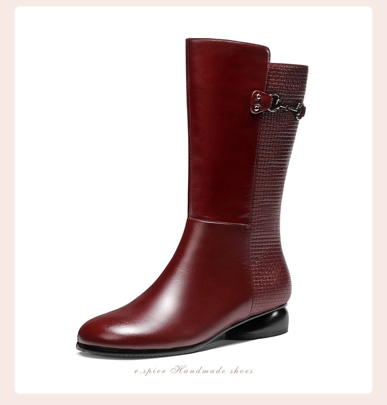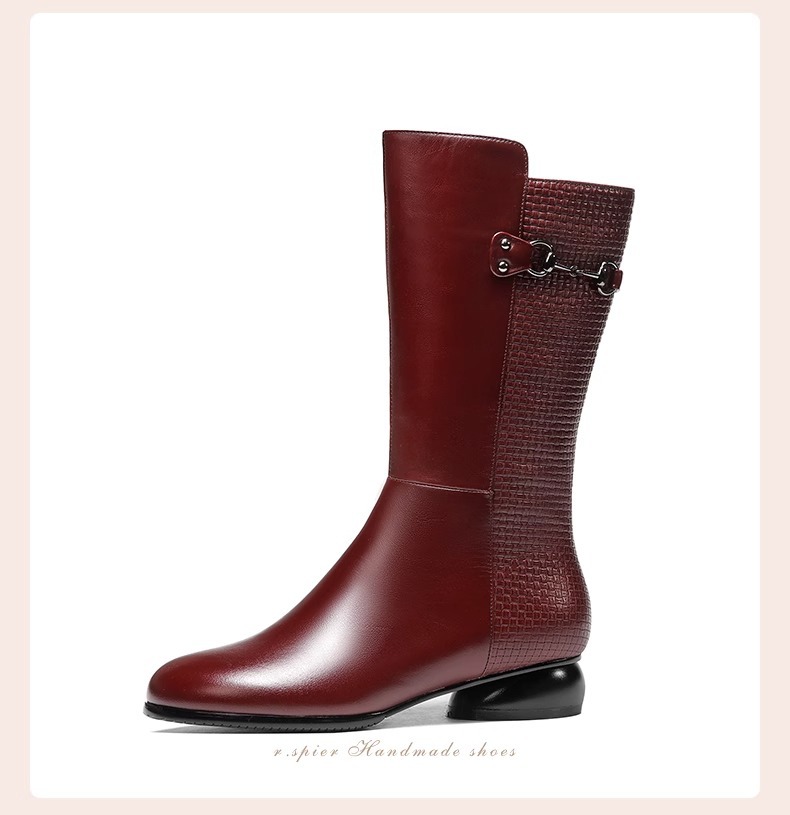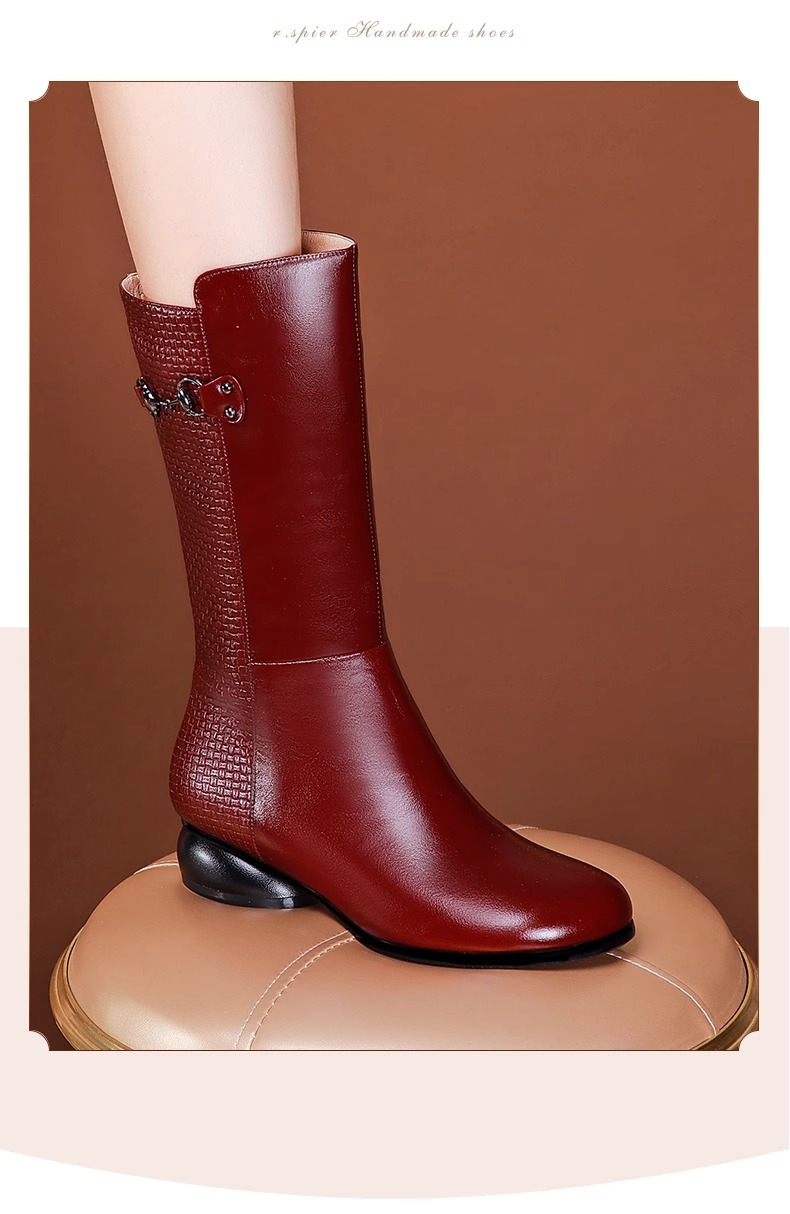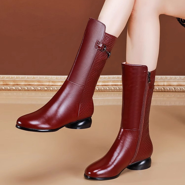 겨울 기모 버건디 부츠 여성용 소 가죽 둥근 발가락 중간 송아지 부츠 두꺼운 바닥 기사 부츠 로우 힐 마틴 부츠 여성스토어 가기
