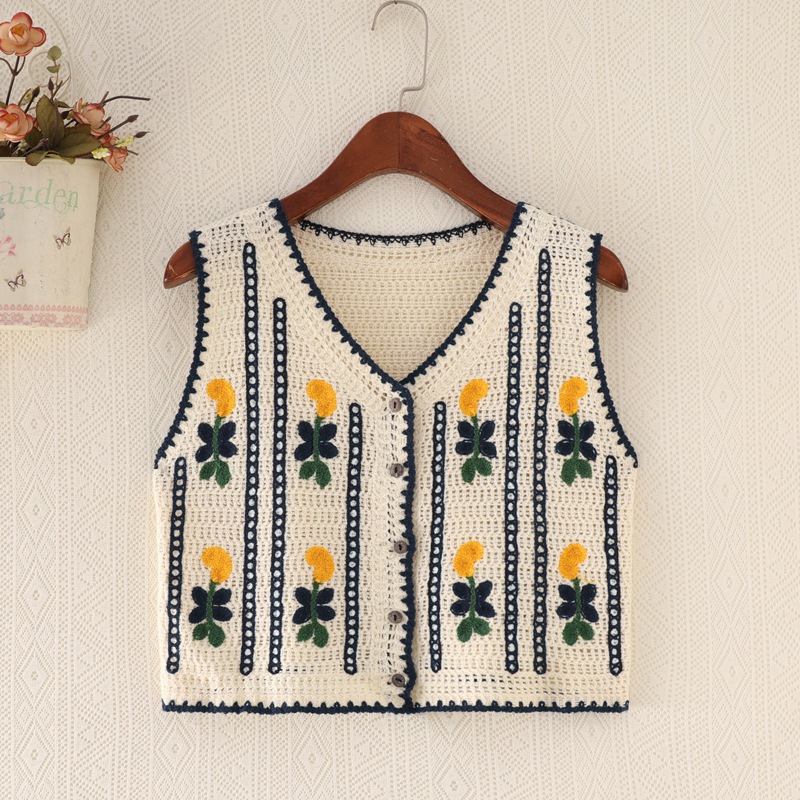 새로운 한국식 니트 조끼 여성용 빈티지 자수 뜨개질 스웨터 웨이스트 코트 베스트 민소매 코트 봄과 여름