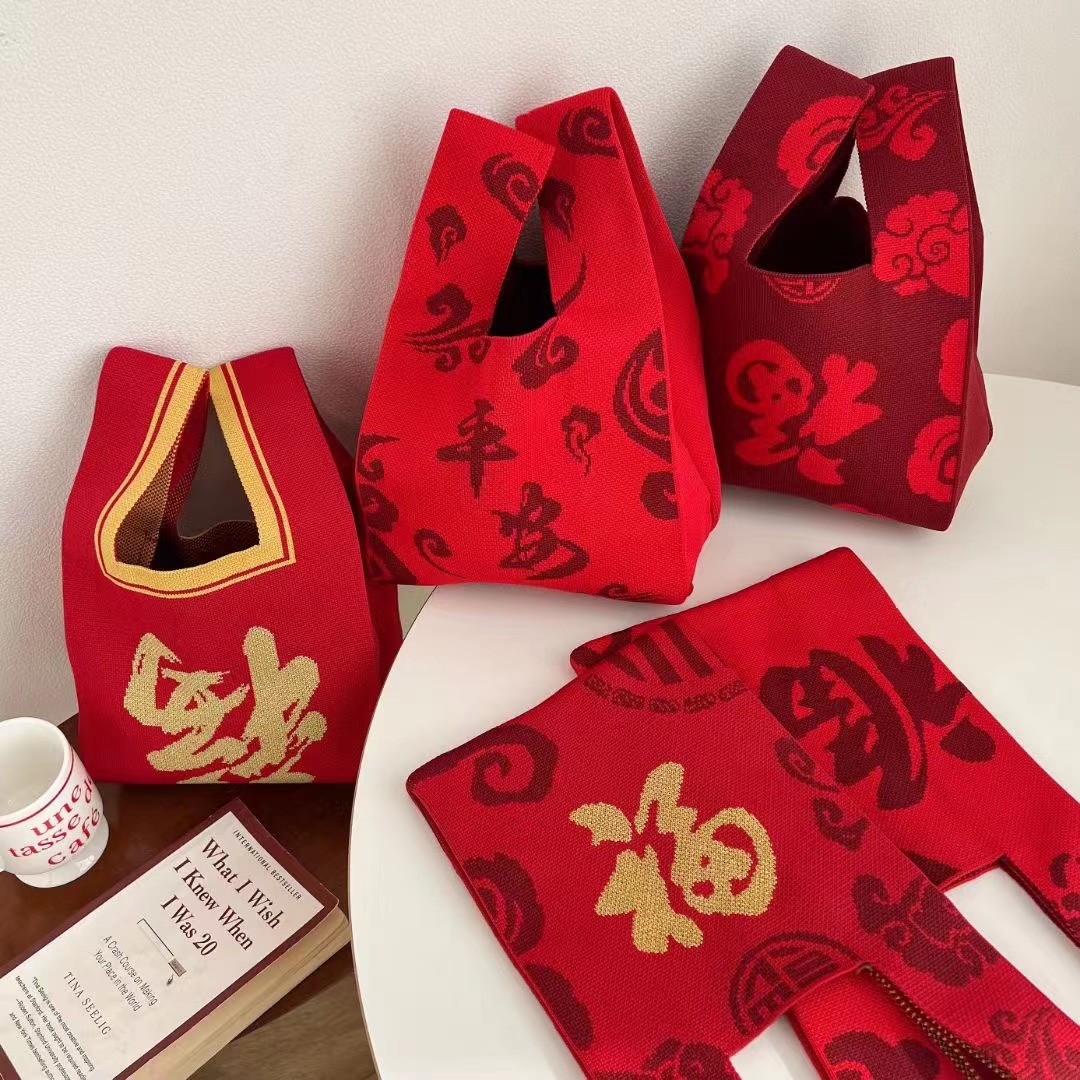 2024 새해 축복 가방 회사 연례 회의 축하 손 선물 가방 로고 니트 핸드백을 만들 수 있습니다스토어 가기