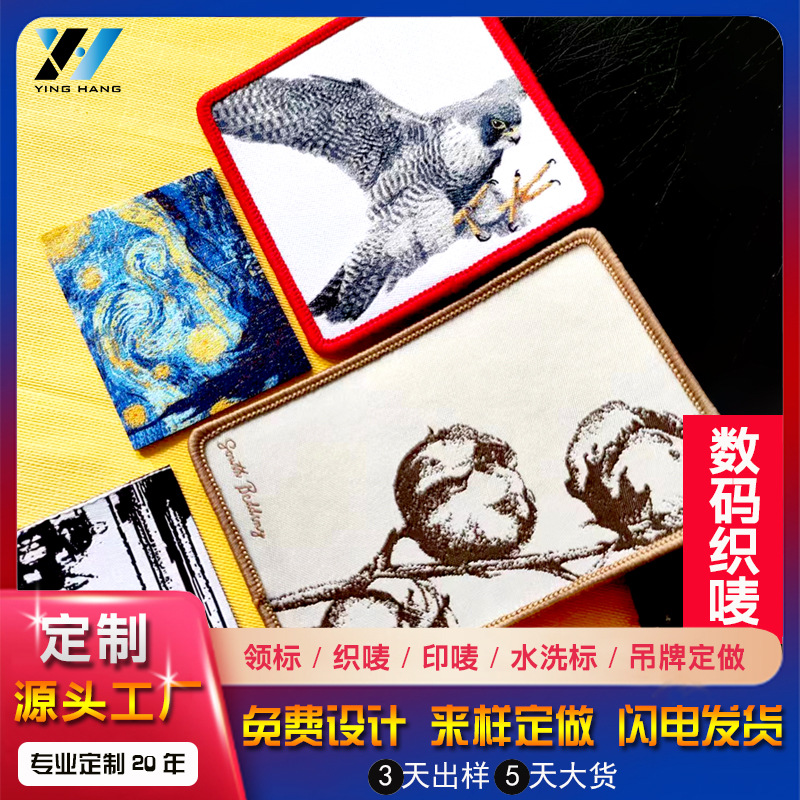 상표 로고 디지털 직조 라벨, 올인원 그라데이션 컬러 천 스티커, 고밀도 매트리스 천 라벨, 핫멜트 접착제 직조 라벨 공장