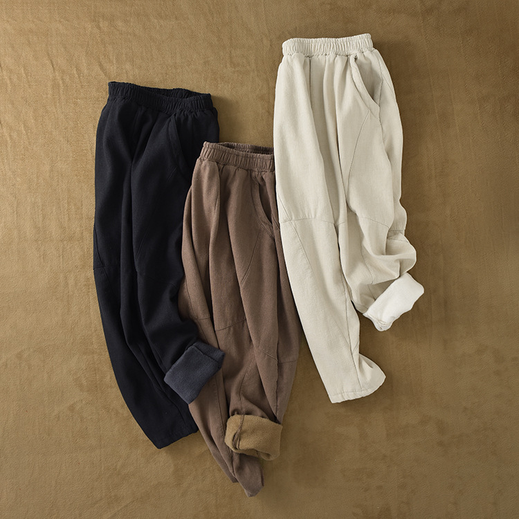 2023 겨울 면화 및 린넨 여성 의류 새로운 라미 샌드 워시 기모 두꺼운 따뜻한 여성 블루머 캐주얼 팬츠 코튼 팬츠스토어 가기