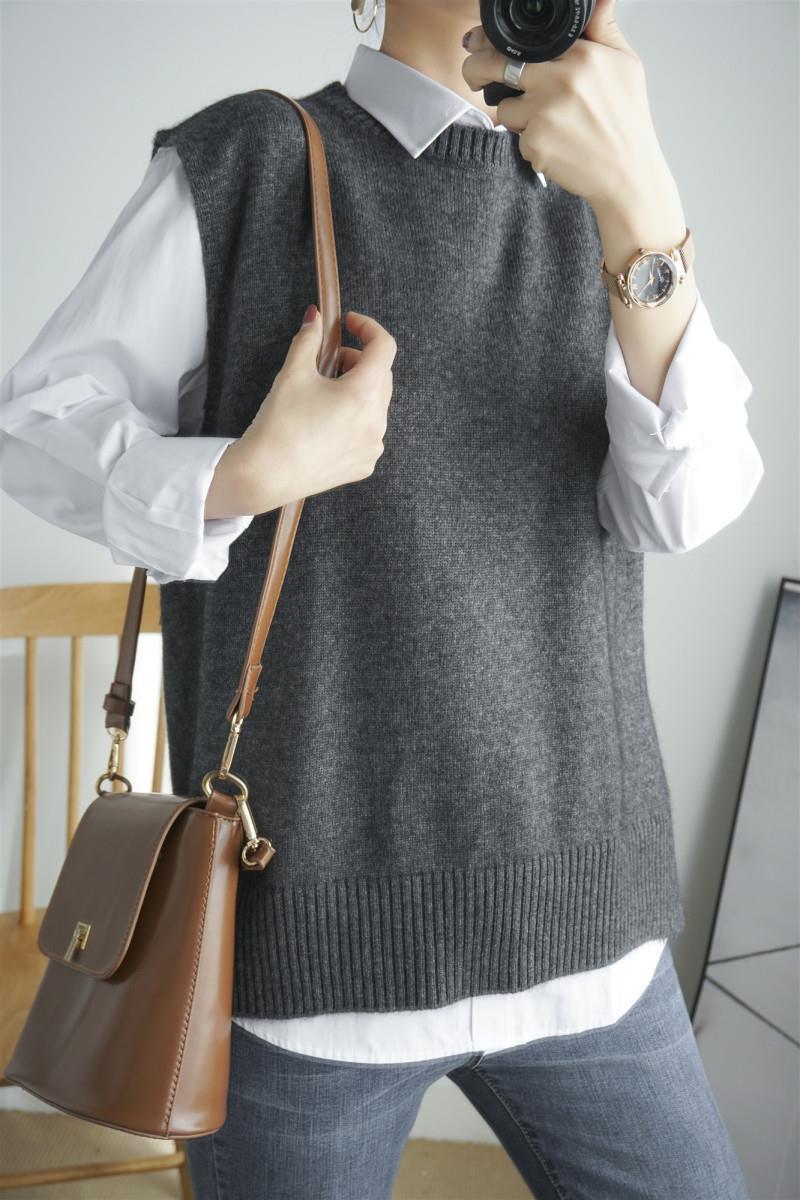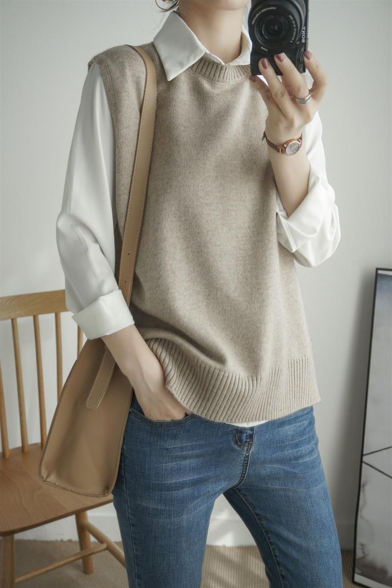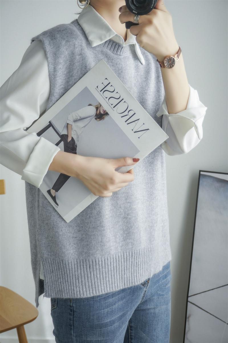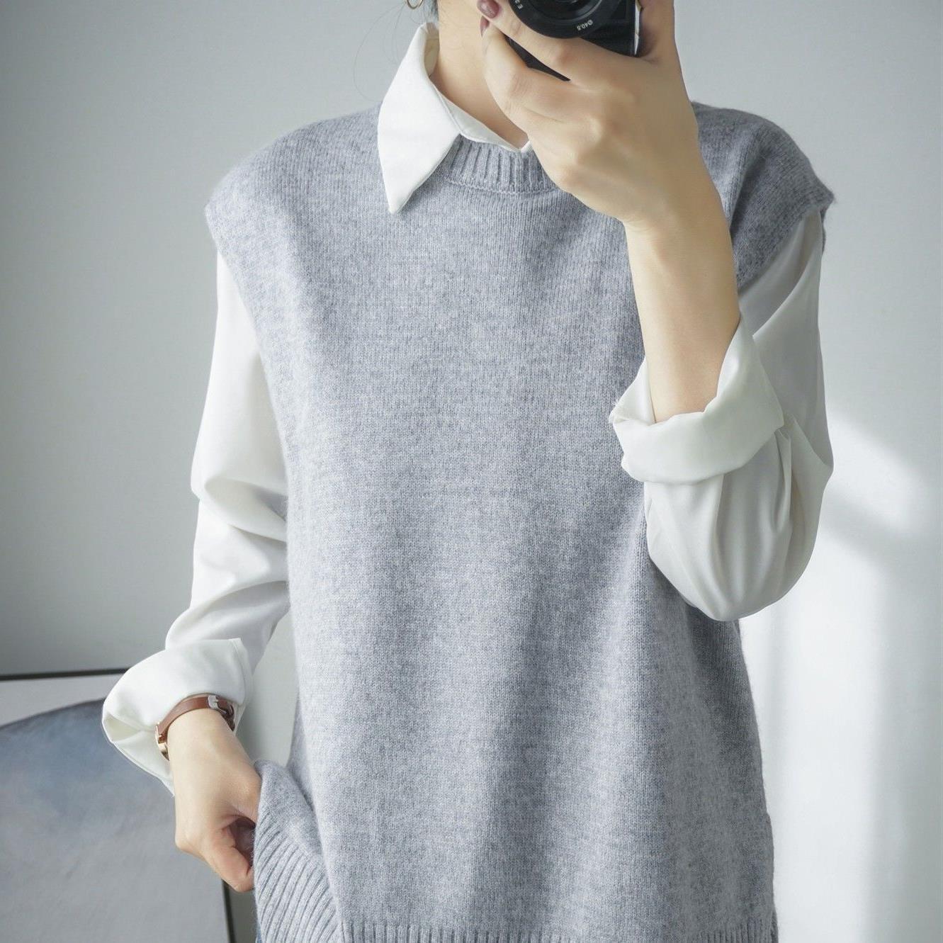 조끼 가을과 겨울 단색 조끼 여성의 한국식 게으른 스타일 분할 올 매치 니트 민소매 라운드 넥 양복 조끼 스웨터