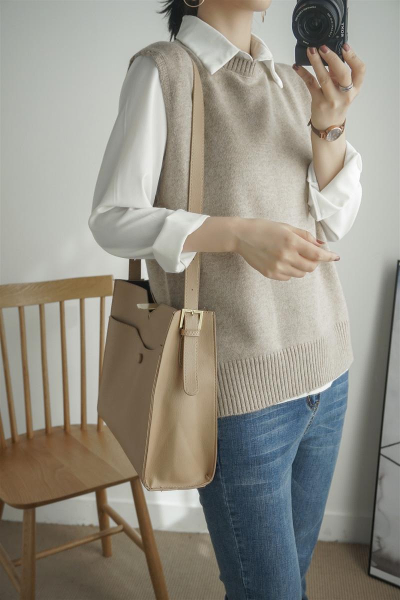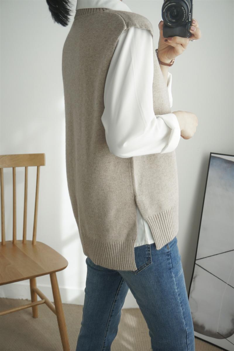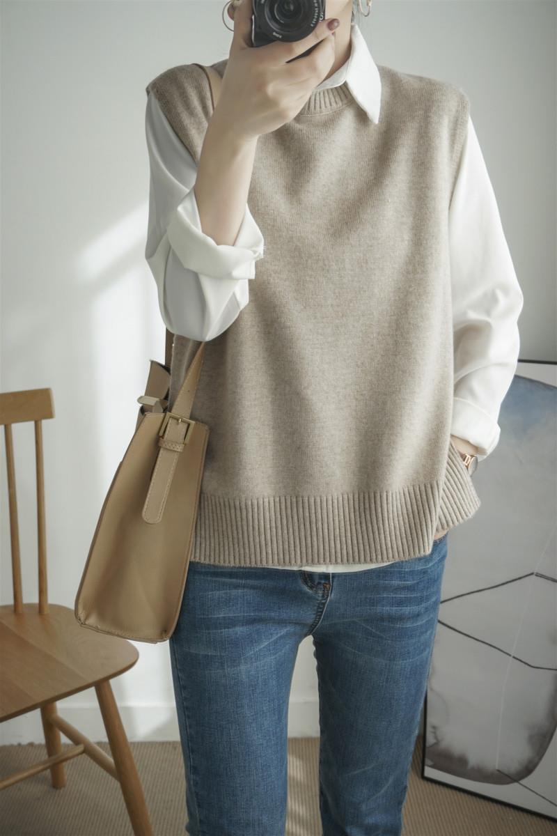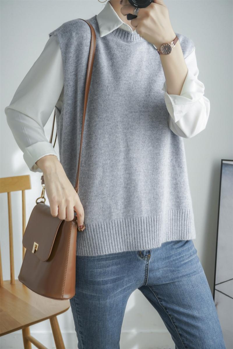 조끼 가을과 겨울 단색 조끼 여성의 한국식 게으른 스타일 분할 올 매치 니트 민소매 라운드 넥 양복 조끼 스웨터