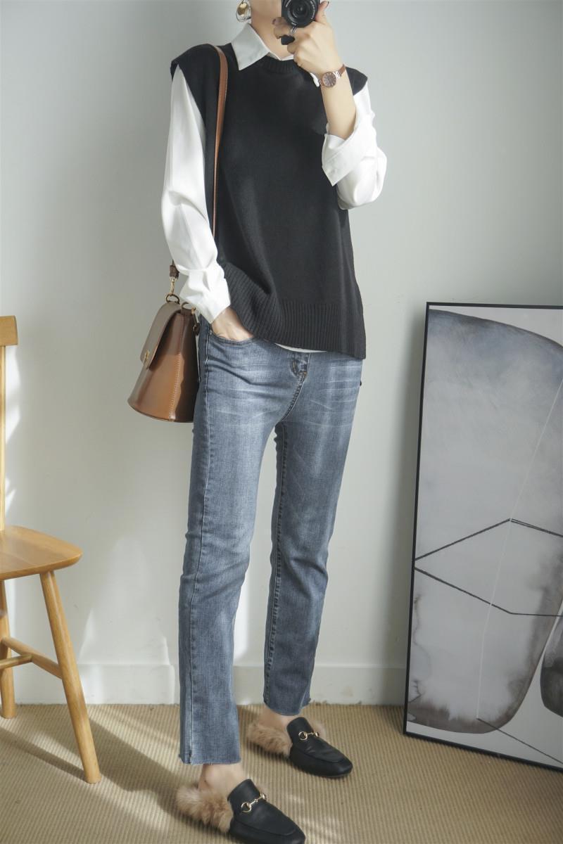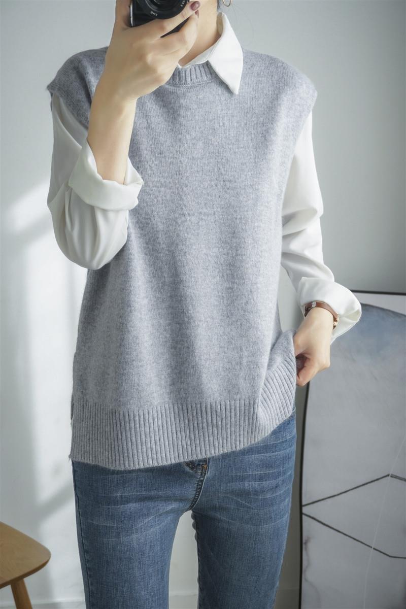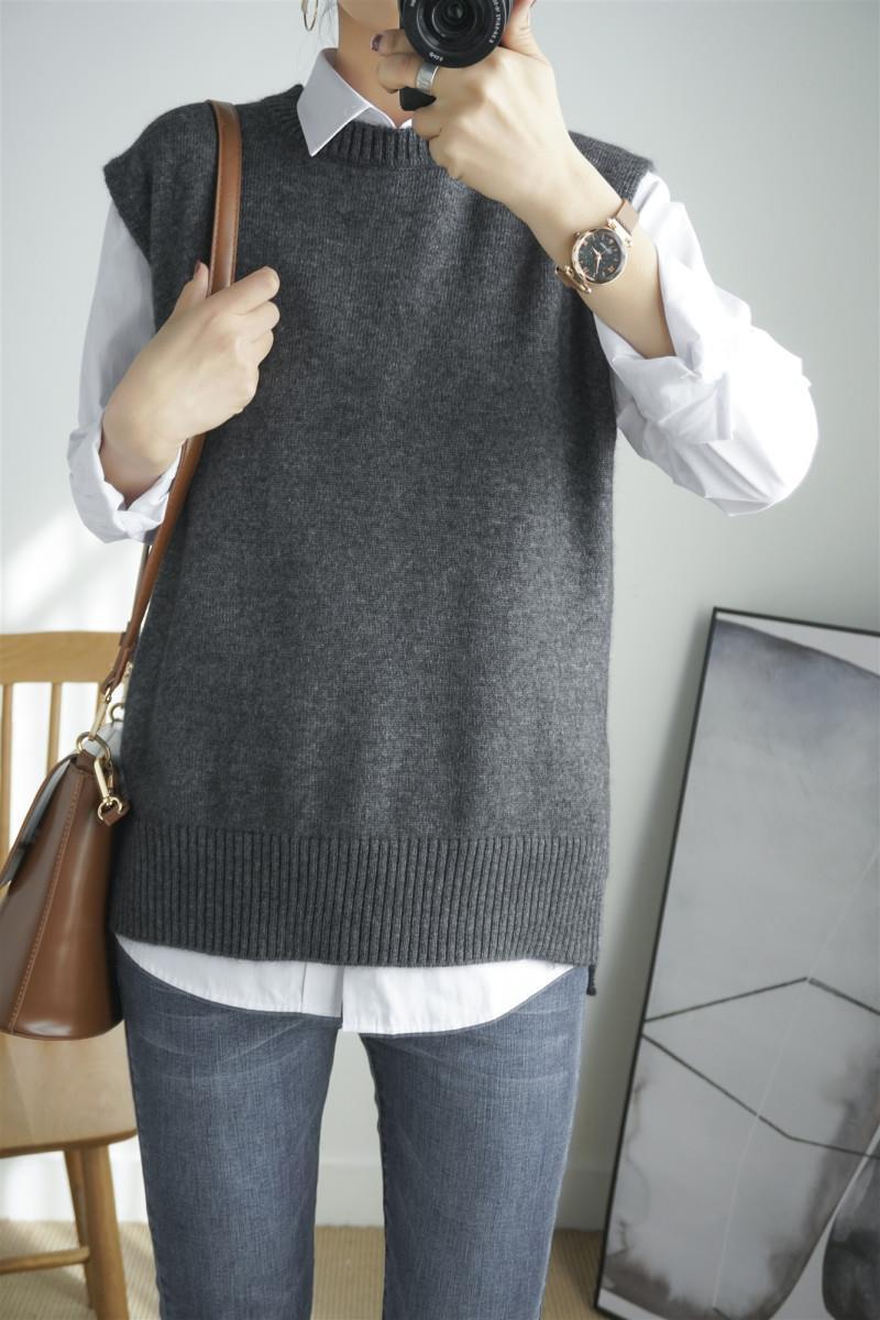 조끼 가을과 겨울 단색 조끼 여성의 한국식 게으른 스타일 분할 올 매치 니트 민소매 라운드 넥 양복 조끼 스웨터스토어 가기