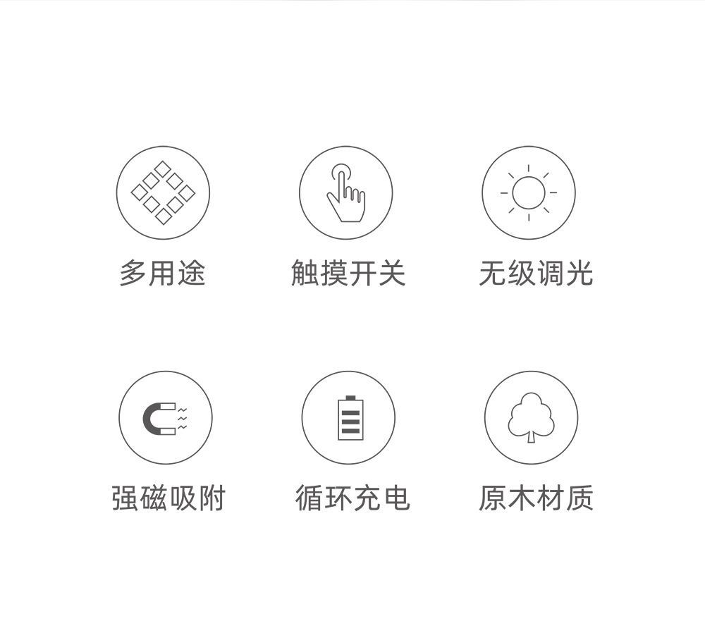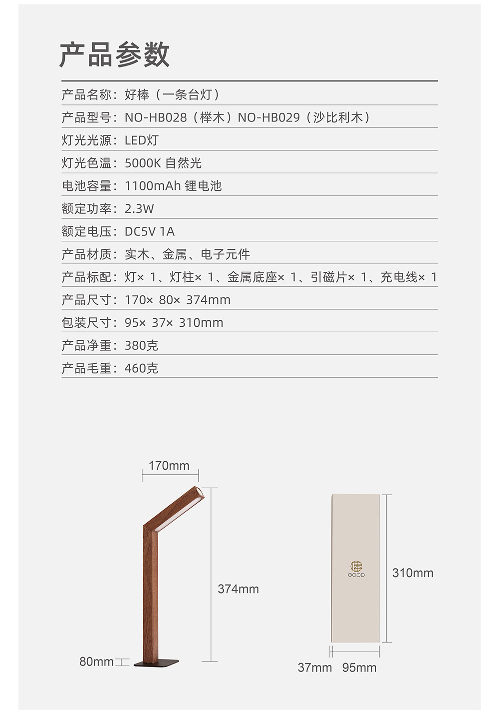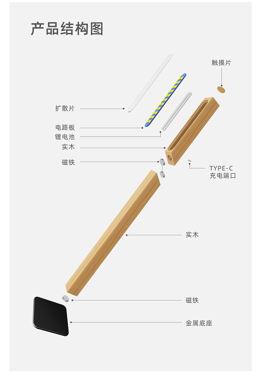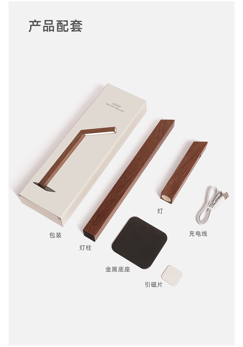 产品标配:灯×1、灯柱×1、金属底座×1、引磁片×1、充电线×1
