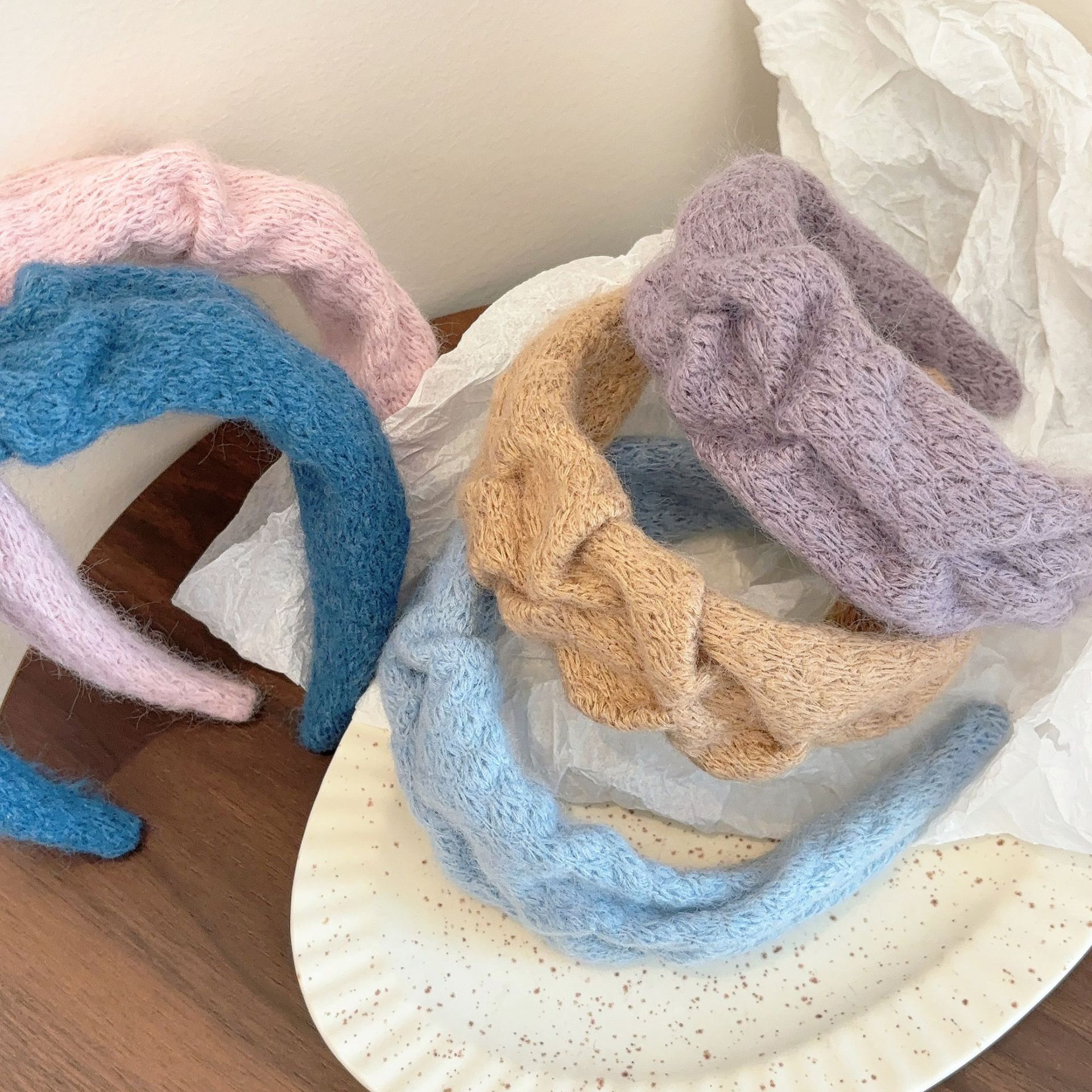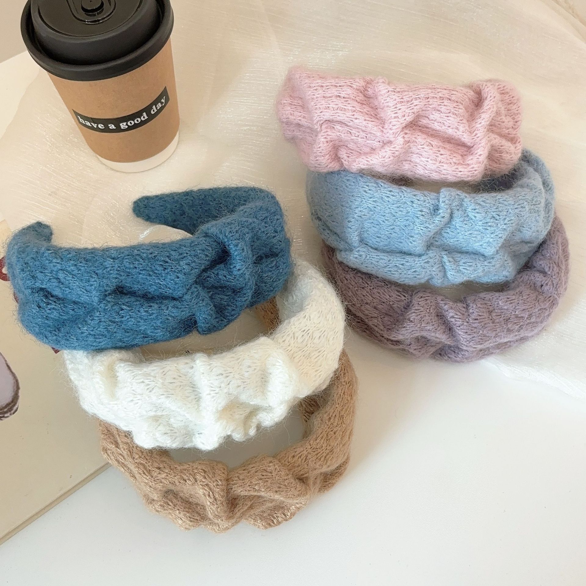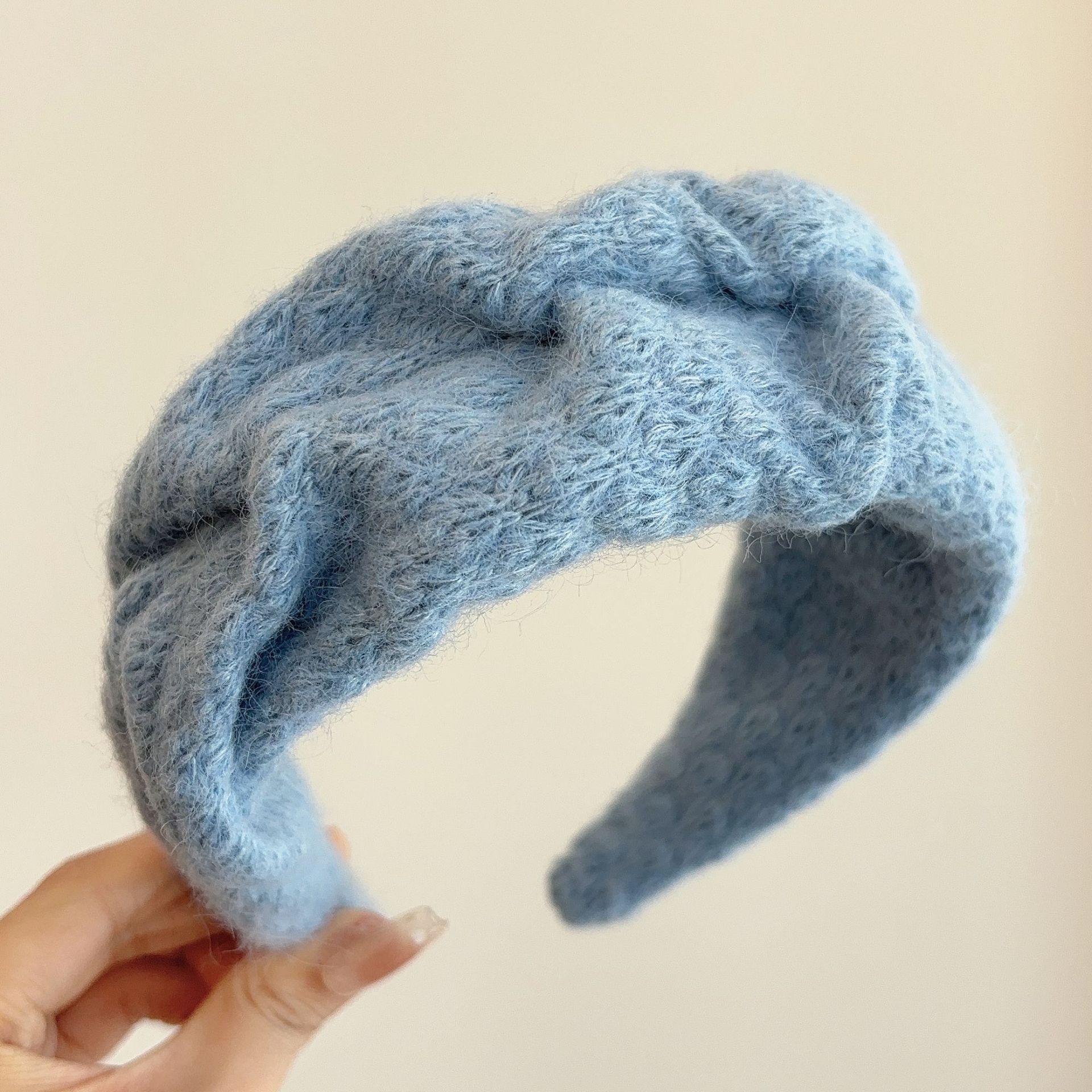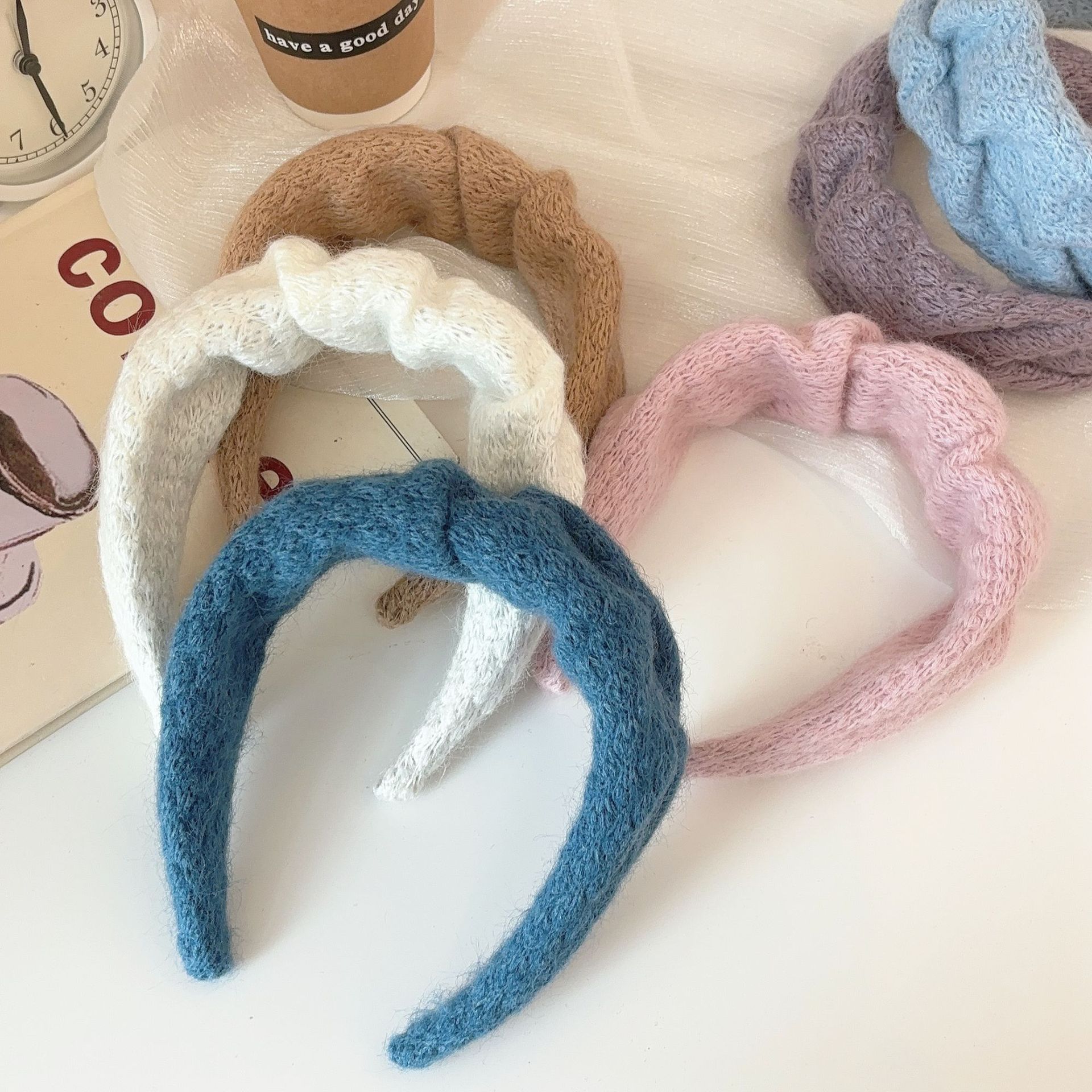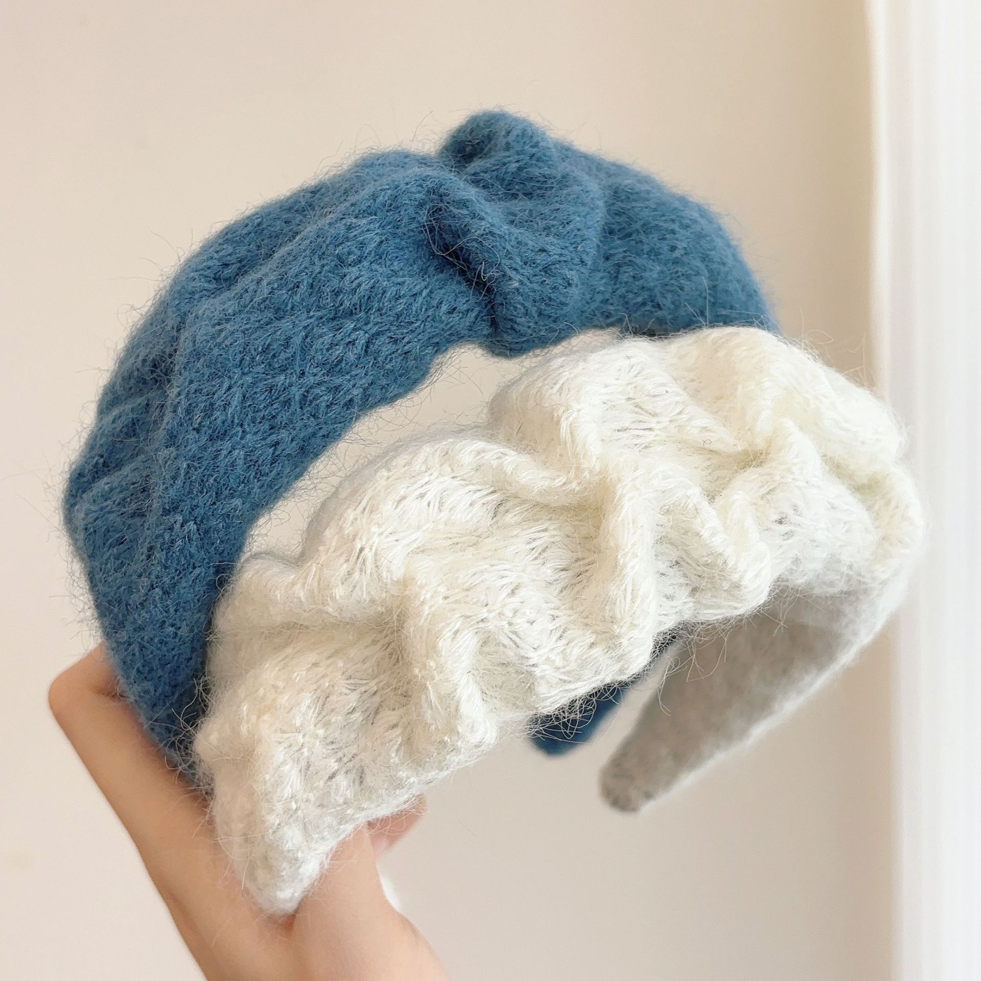 밀크 블루 시리즈 ~ 부드러운 찹쌀 주름 흰색 울 머리띠 여성 와이드 에지 하이 스컬 탑 고급 부드러운 머리핀 머리띠스토어 가기