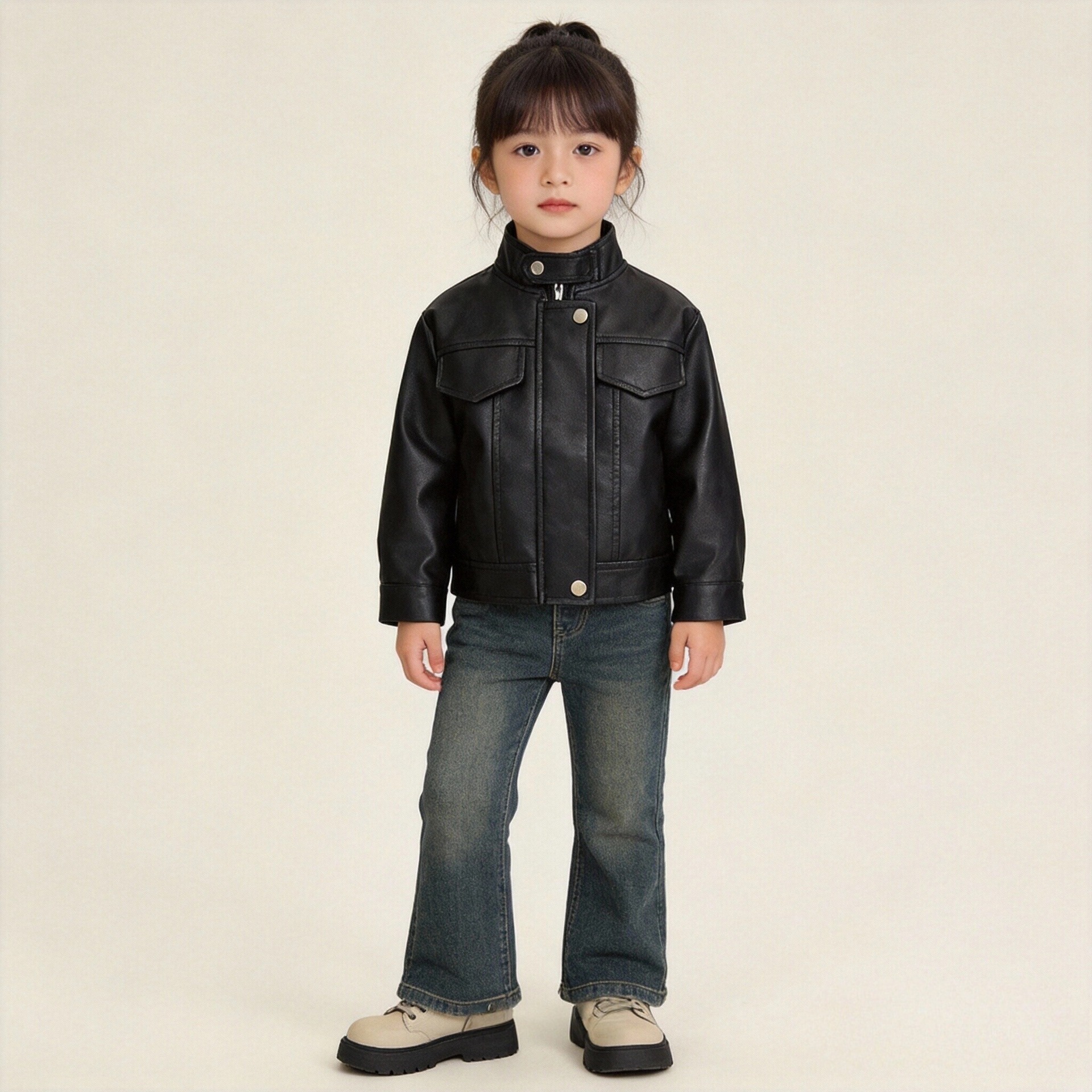 2025 가을 새 여자 가죽 자켓 어린이 한국 스타일 짧은 스탠드 칼라 자켓 탑 오토바이 의류 세대 1