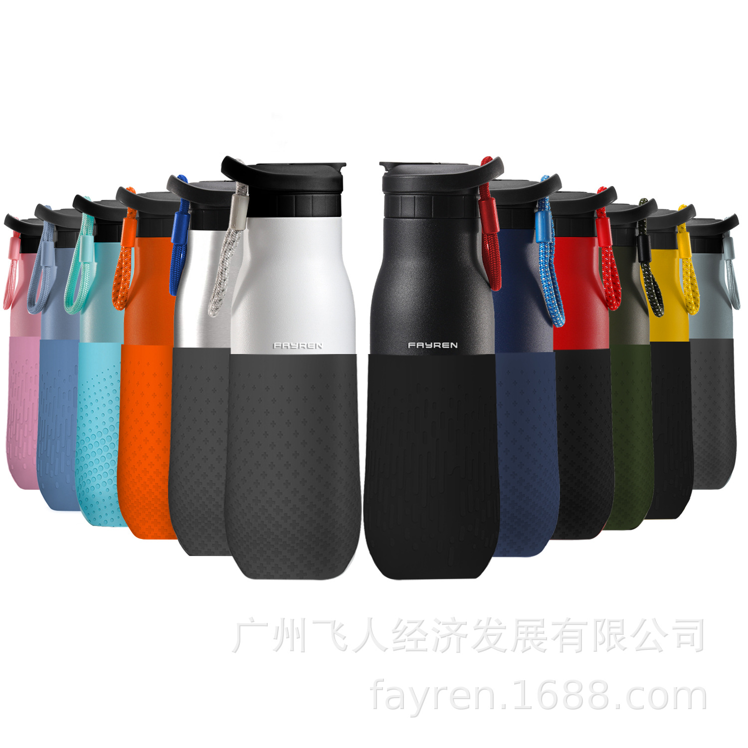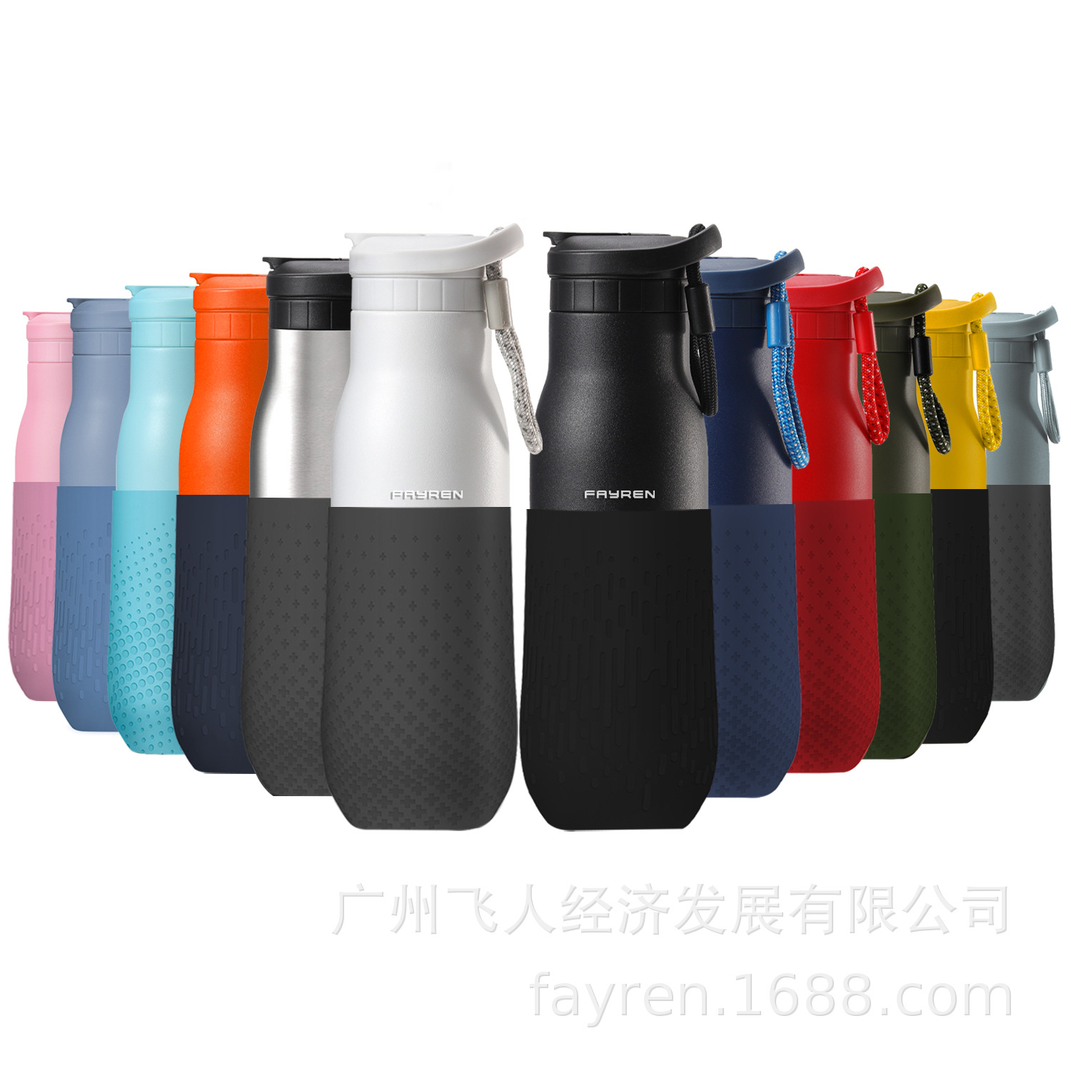 스테인레스 스틸 스포츠 주전자 야외 등산 냄비 피트니스 워터 컵 더블 레이어 진공 보온병 컵 미끄럼 방지 실리콘 컵 커버