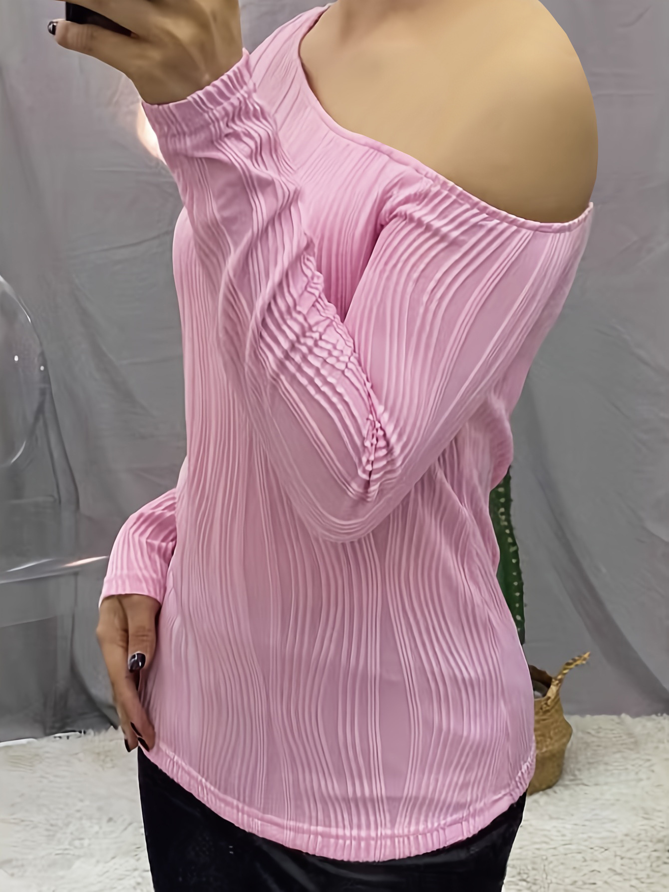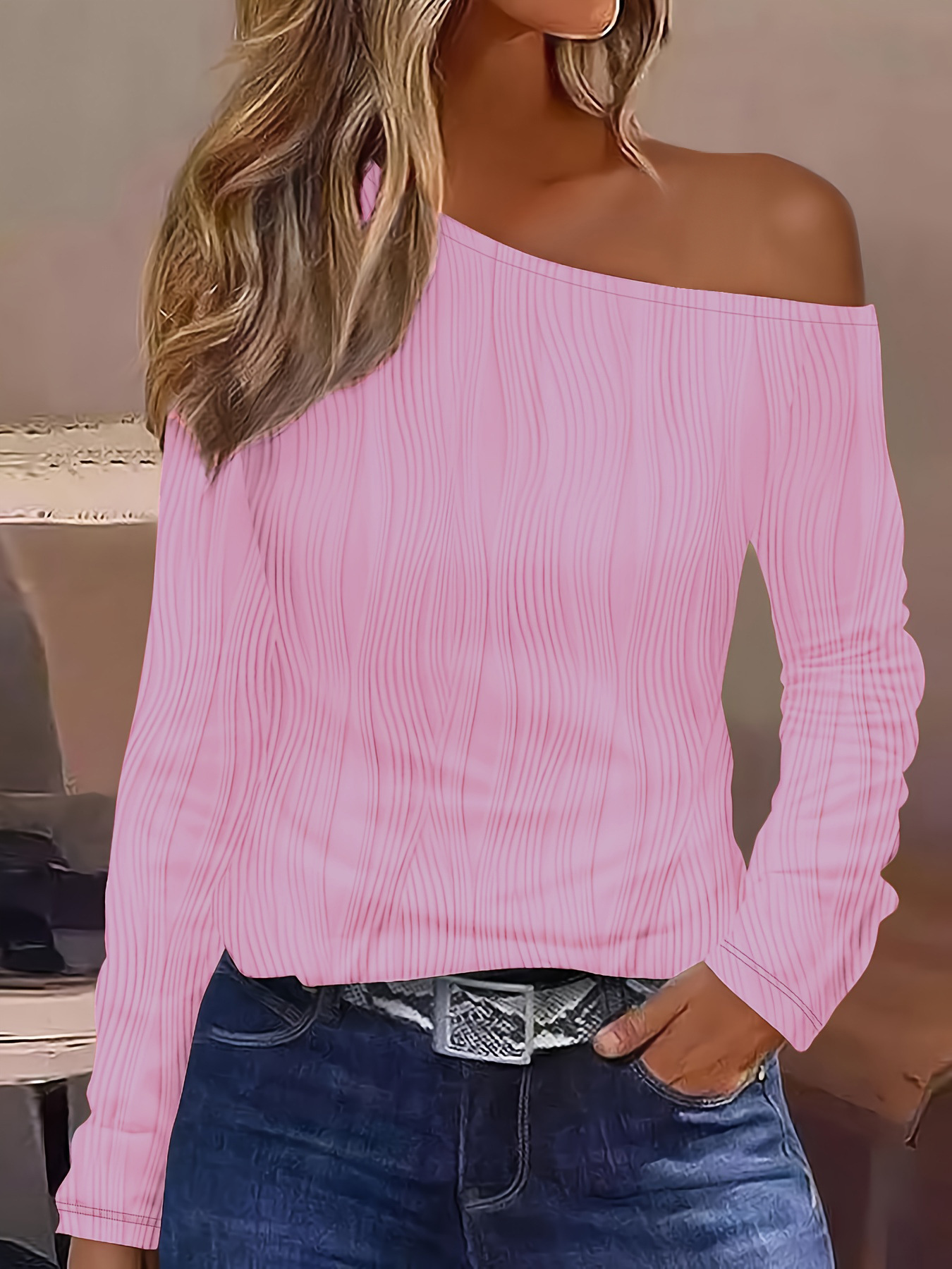 2023 년 가을과 겨울 아마존 국경 유럽 및 미국 여성을위한 새로운 피트 솔리드 컬러 크로스 숄더 자카드 롱 슬리브 탑