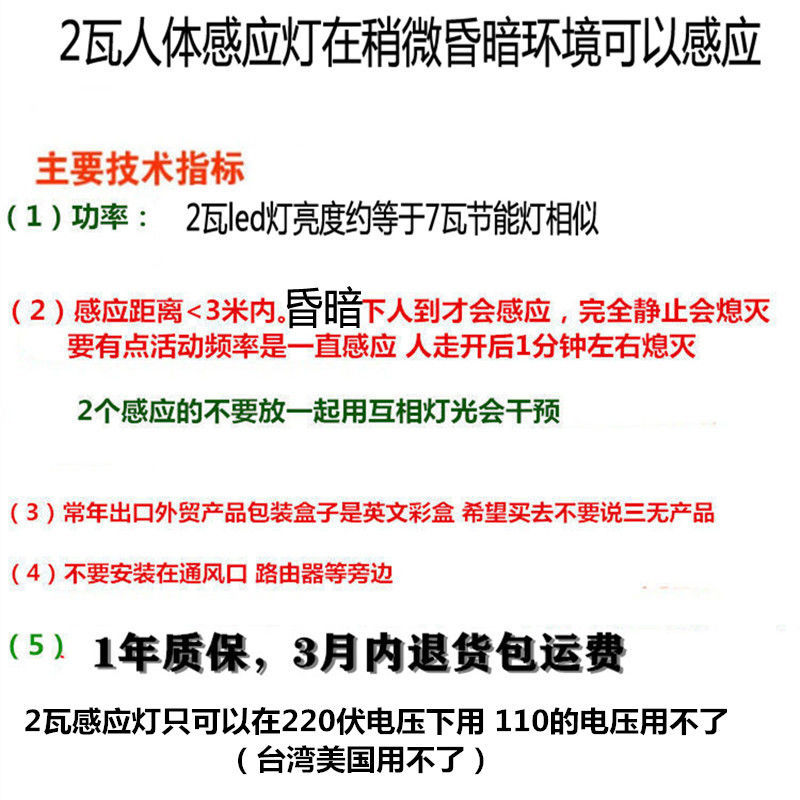 (1)此灯内置光敏元件,因此环境高于5Lux(白天和很亮的环境都不亮)灯不工作。