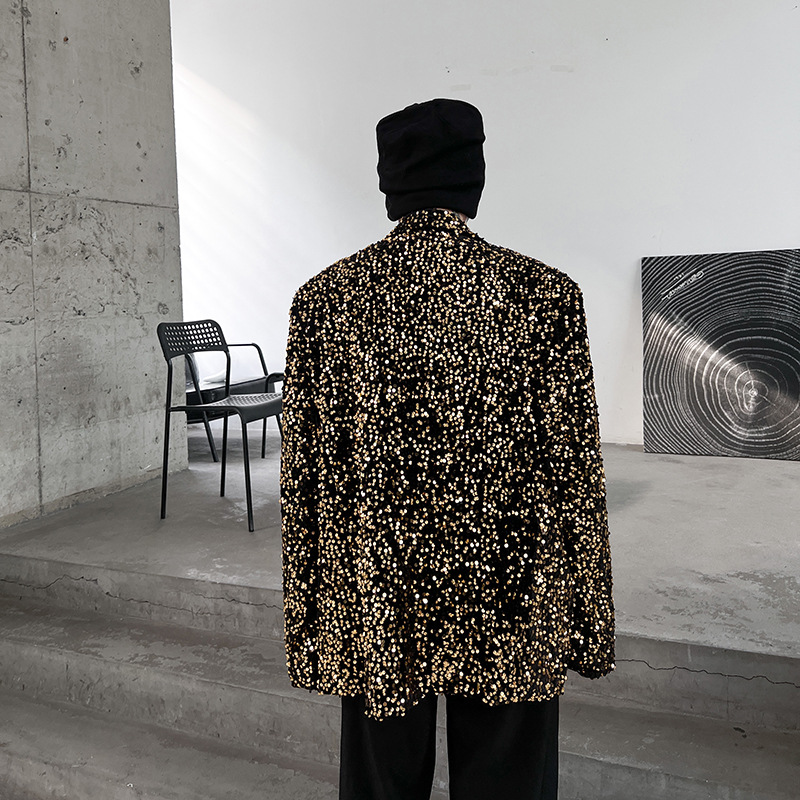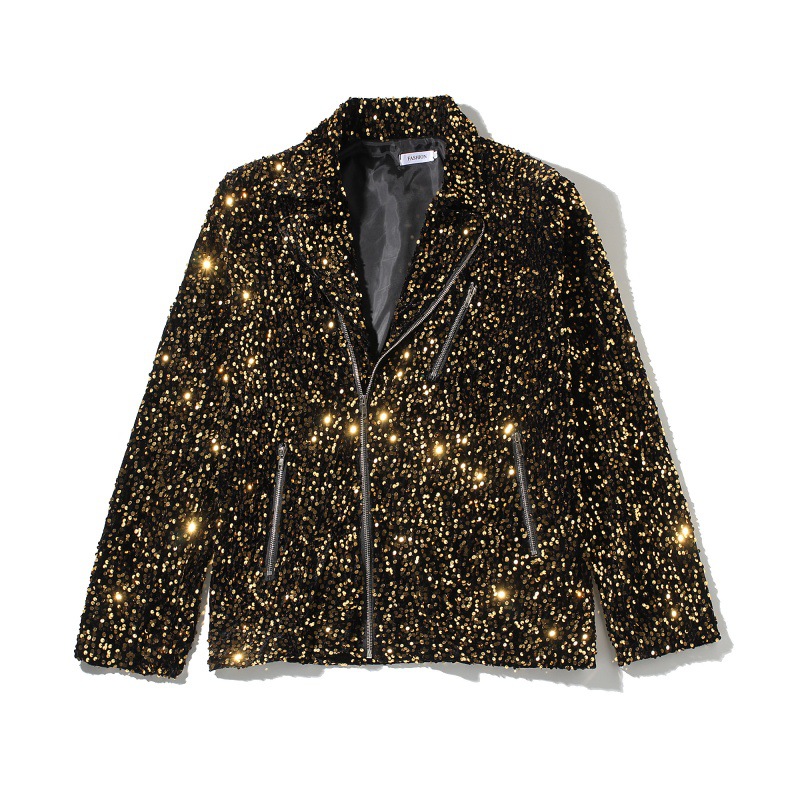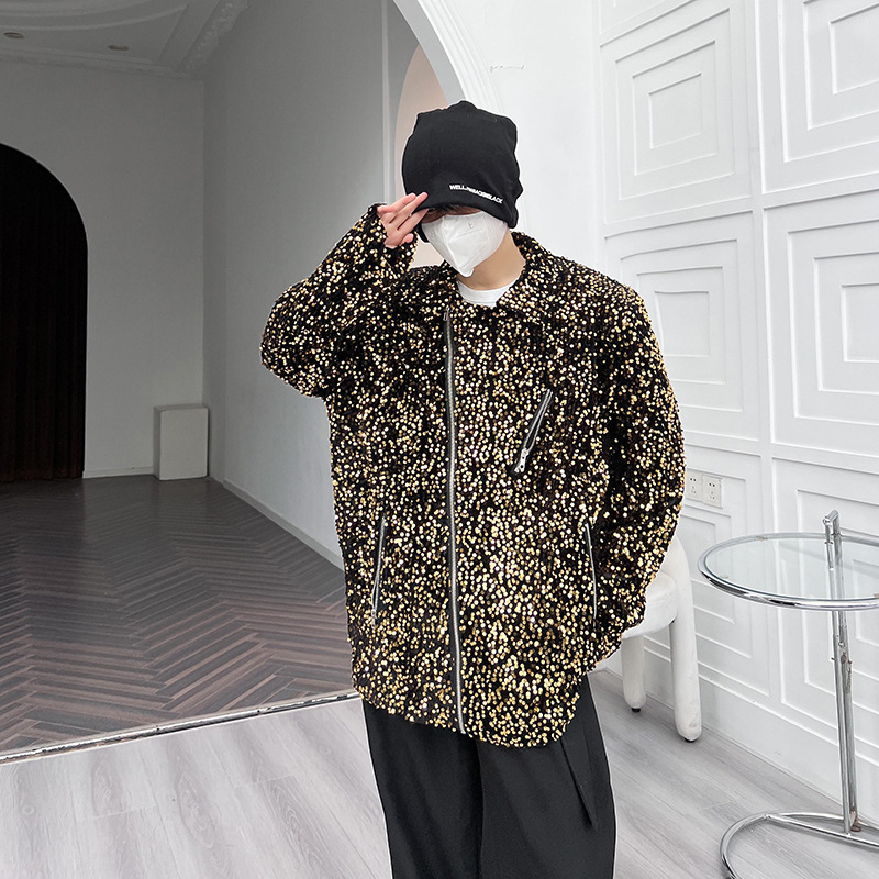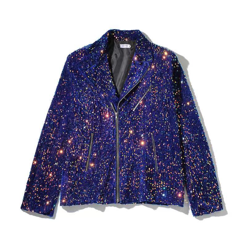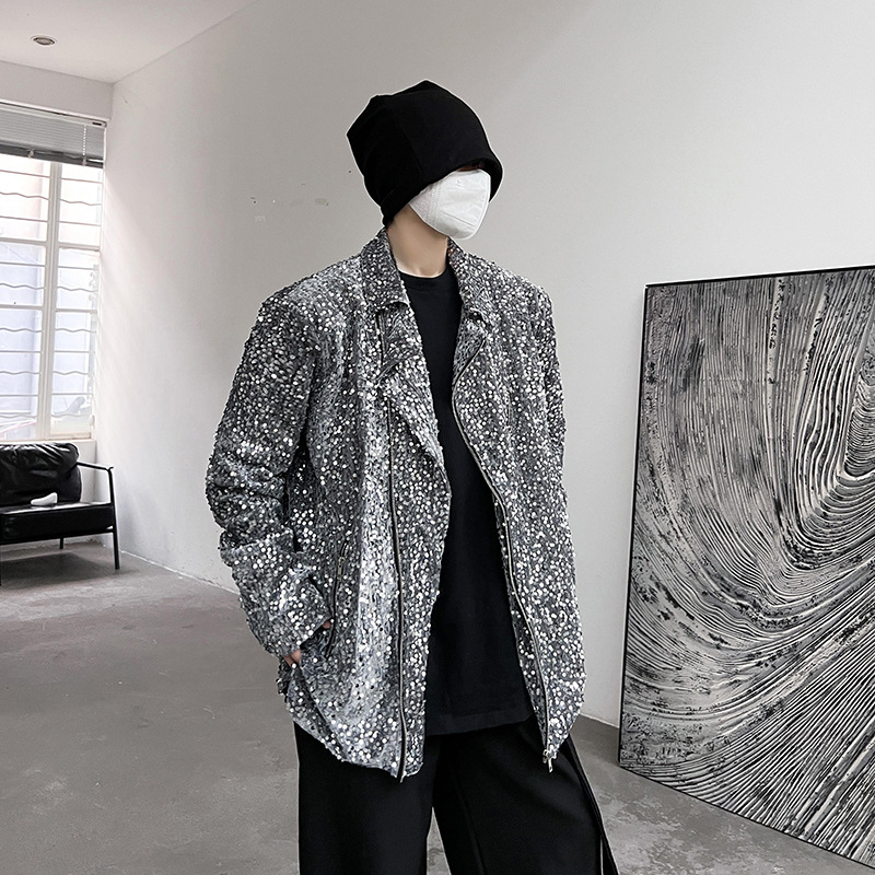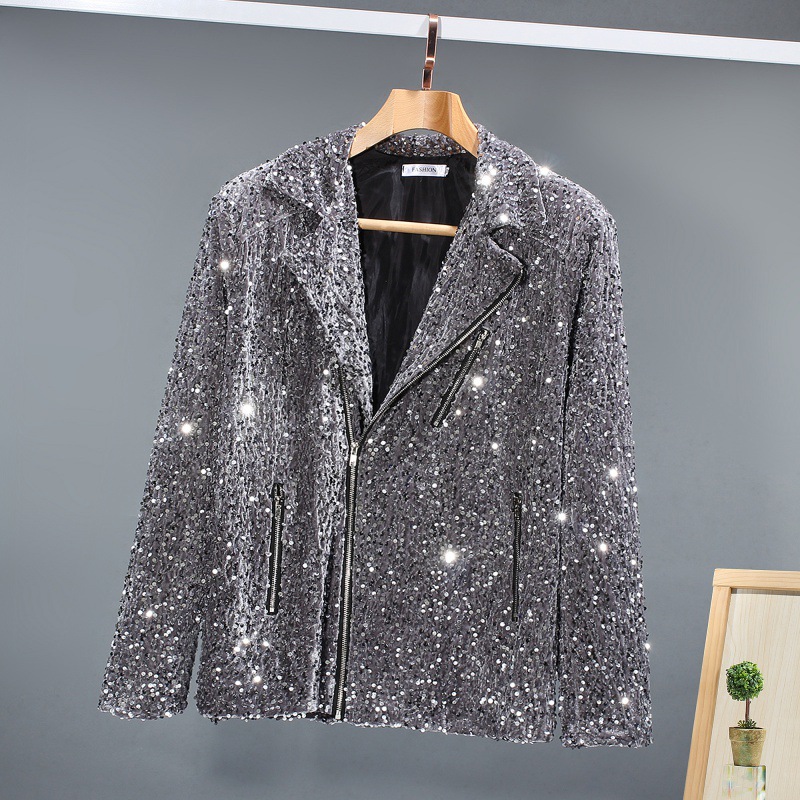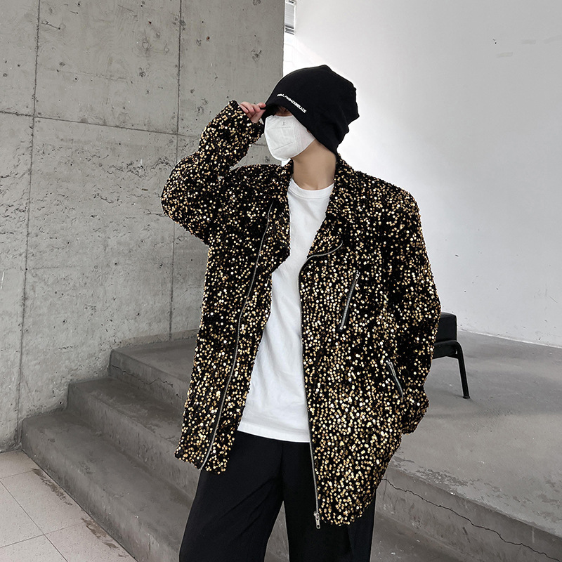 23 새로운 온라인 유명인 라이브 무대 스팽글 재킷 남성용 비스듬한 지퍼 성능 유니폼 플러스 사이즈 트렌디 한 스팽글 재킷
