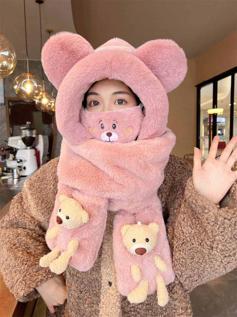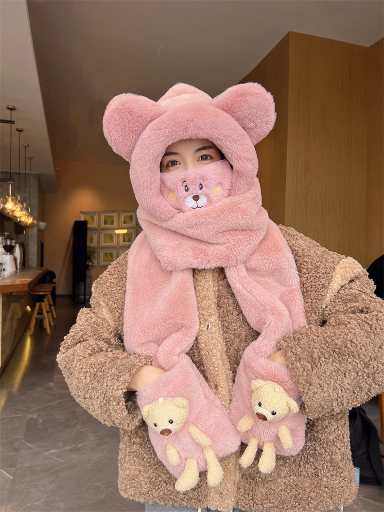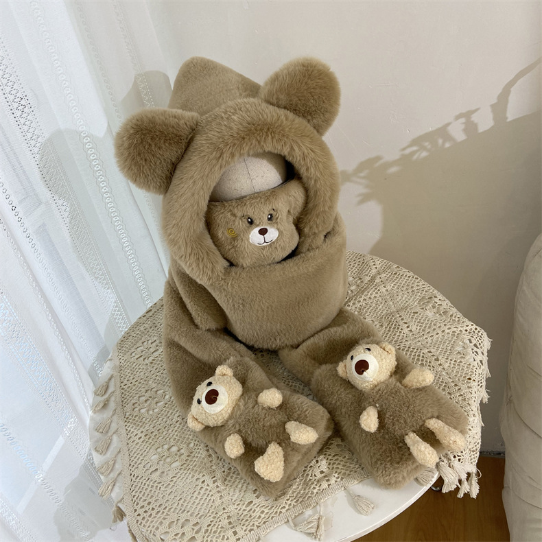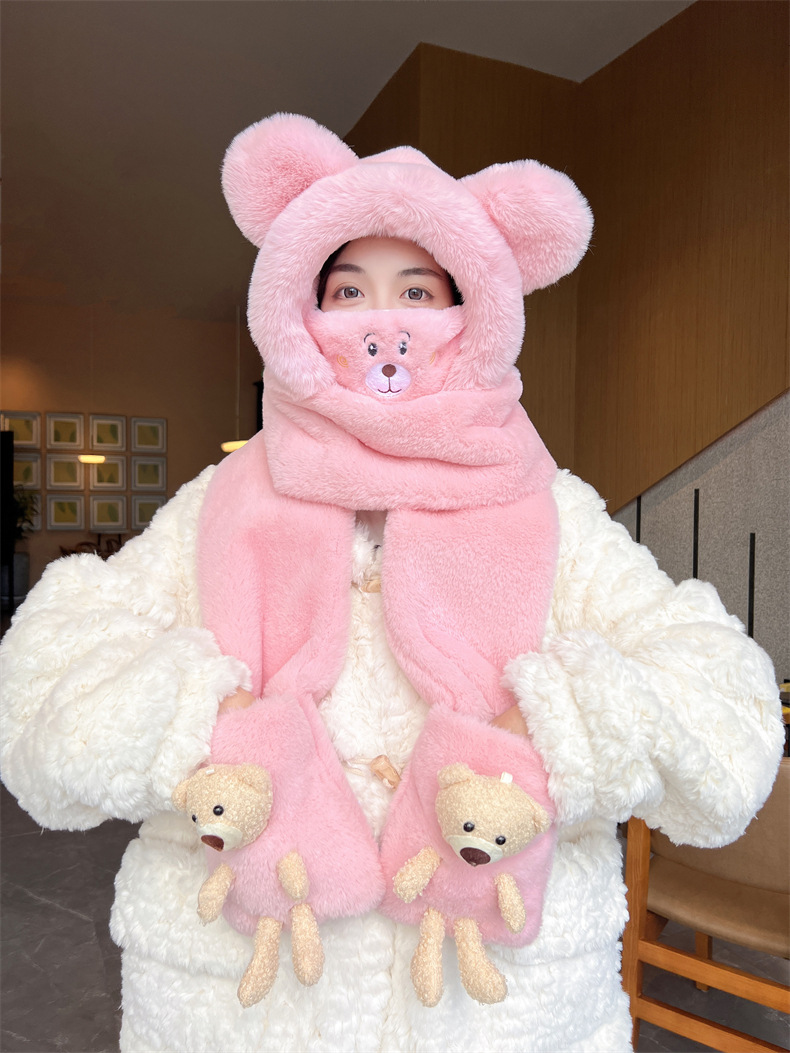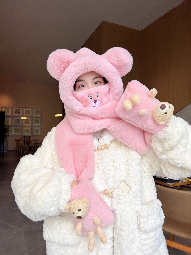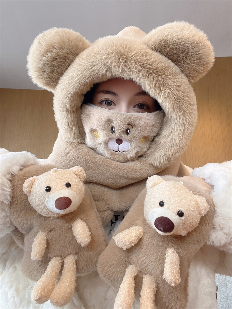 올 매치 베어 모자 스카프 여성의 2024 겨울 새 겨울 장갑 스카프 소녀 사이클링 3 피스 세트