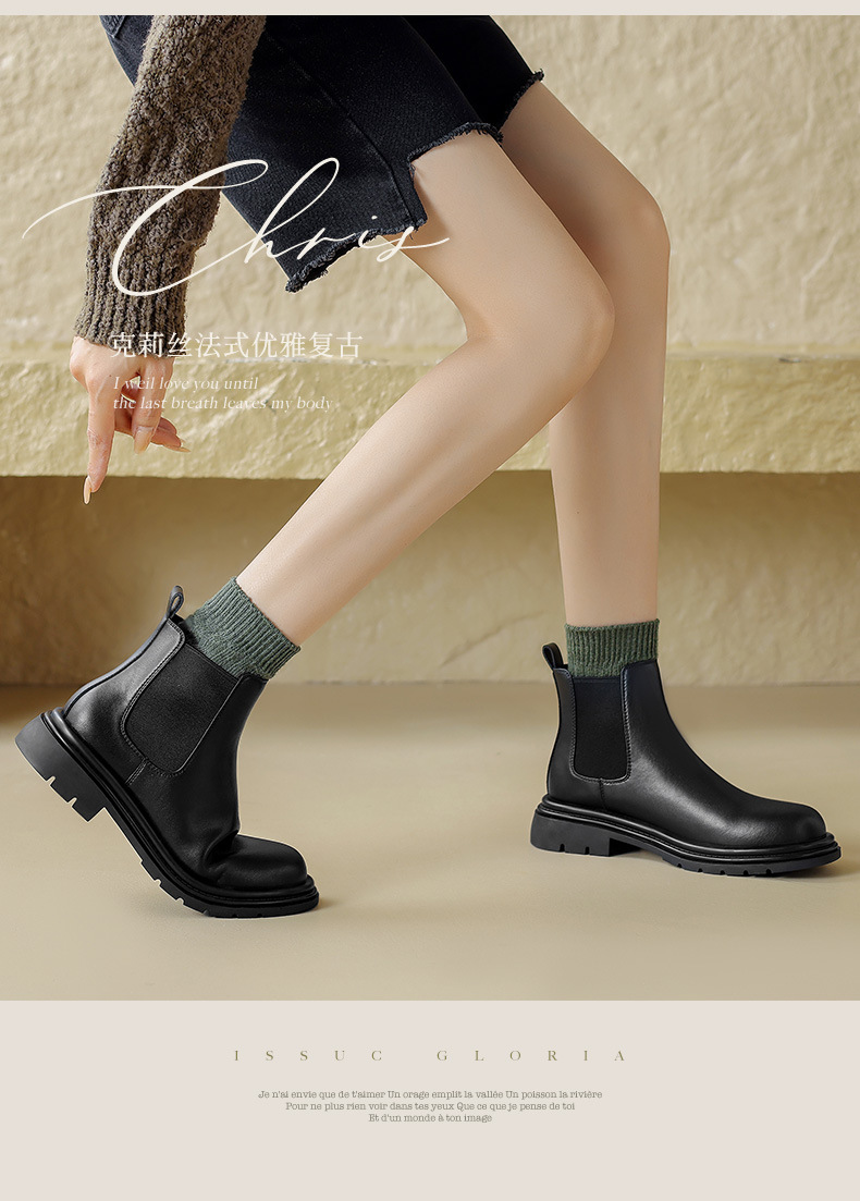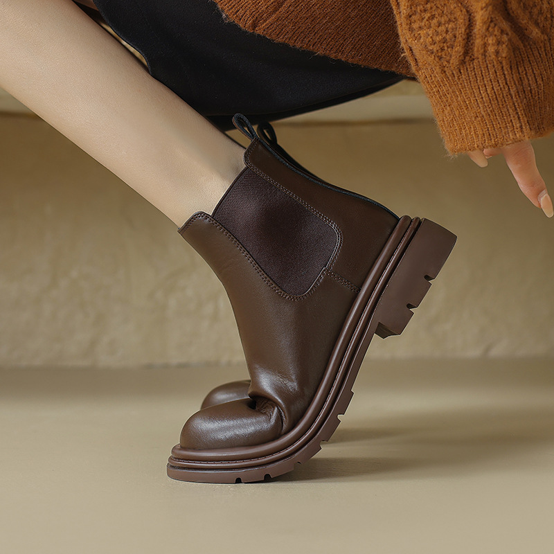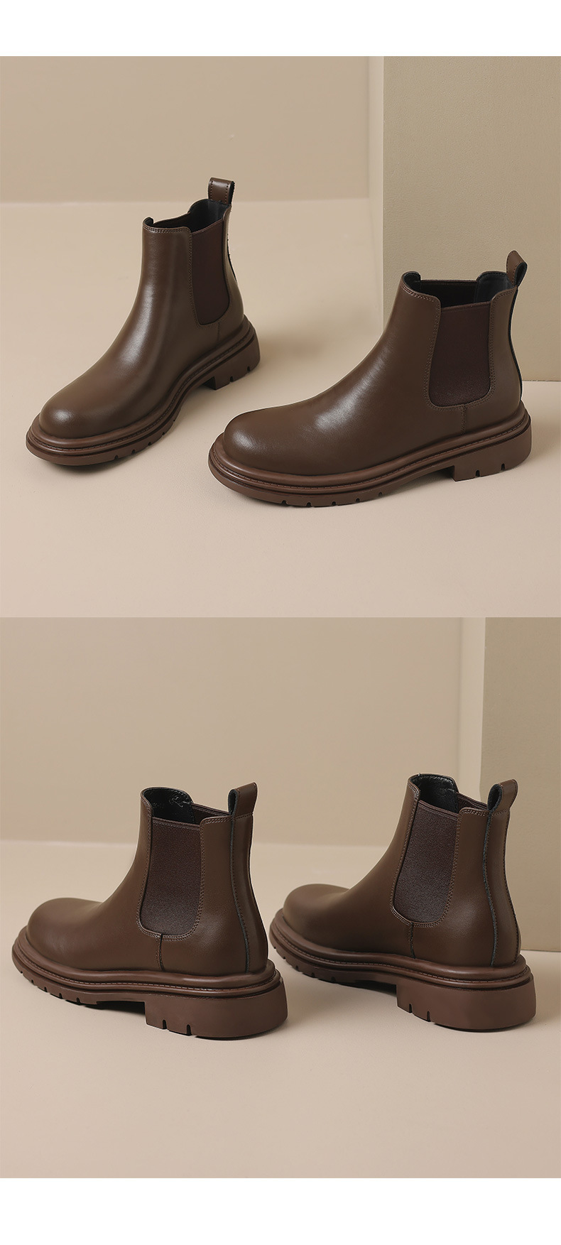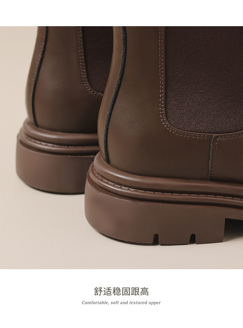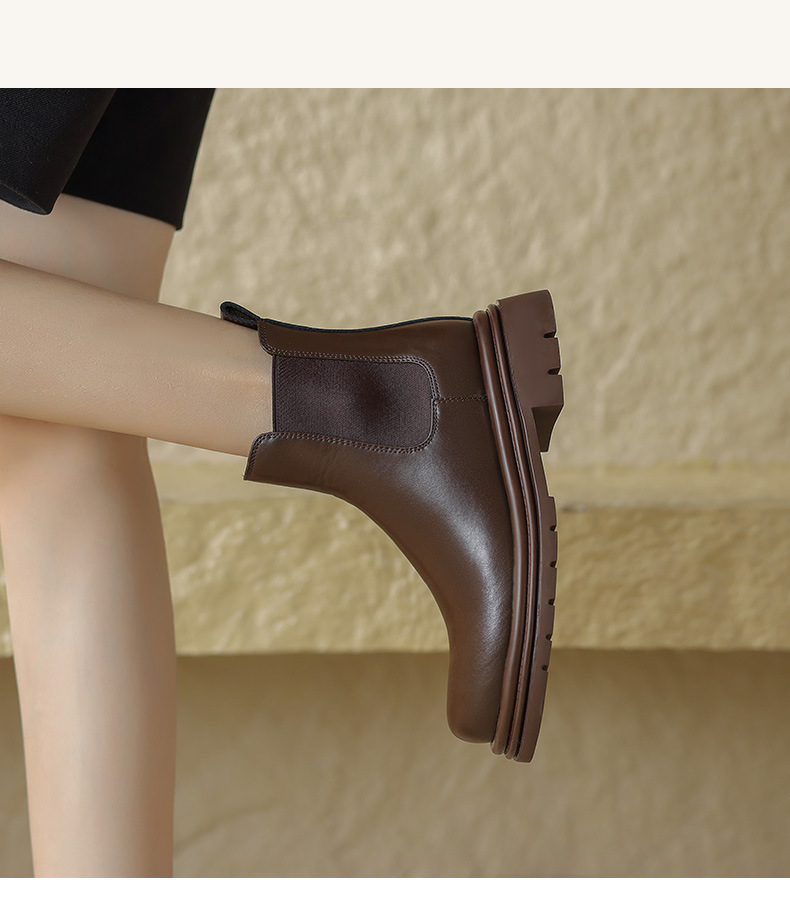 영국 소프트 가죽 다크 브라운 첼시 발목 부츠 여성의 두툼한 뒤꿈치 2023 가을과 겨울 뉴 소가죽 마틴 부츠 미드 힐 싱글 레이어 부츠