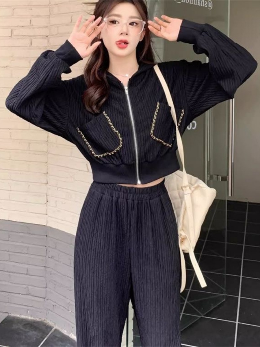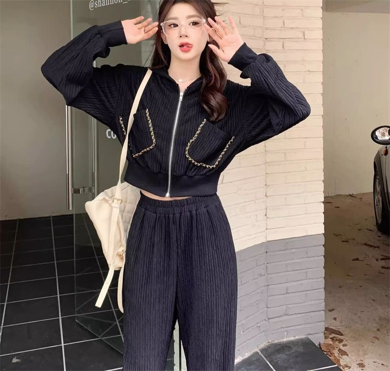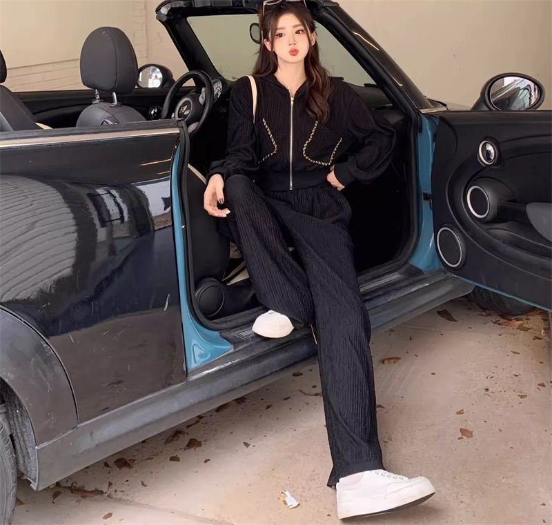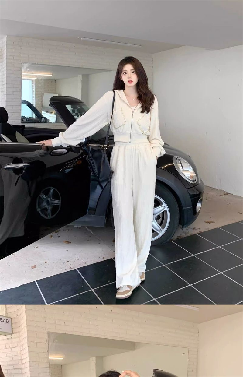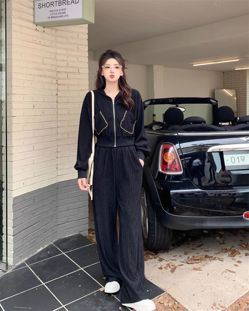가을과 겨울의 새로운 여성 의류 샤넬 스타일 캐주얼 스포츠 세트 고급 소금 후드 스웨터 와이드 레그 팬츠 투피스 세트