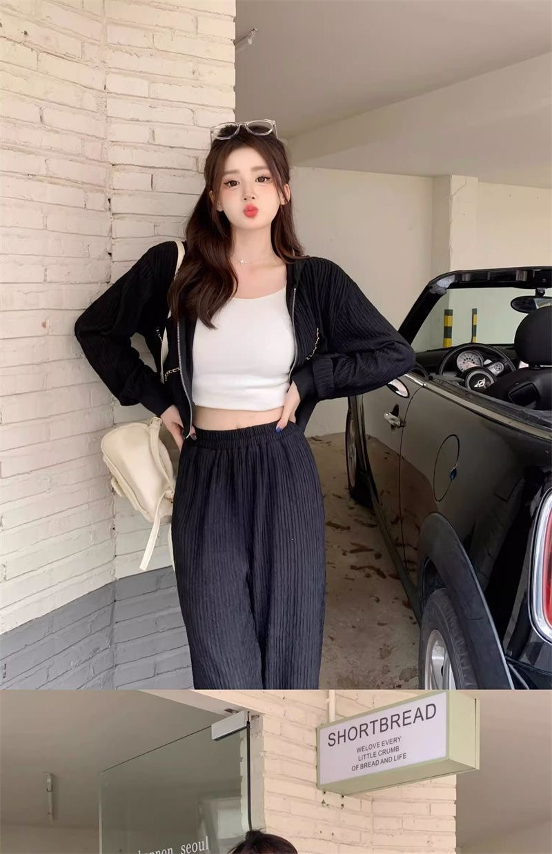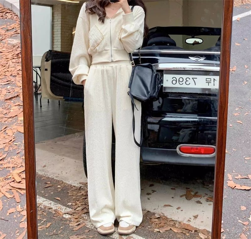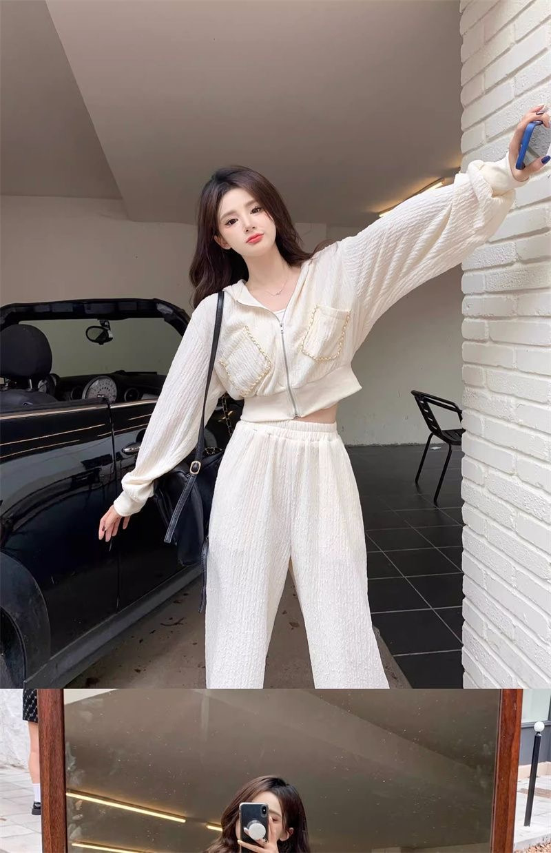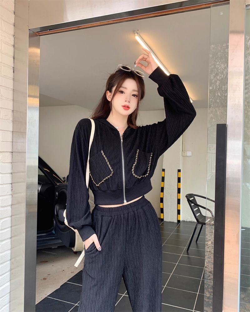 가을과 겨울의 새로운 여성 의류 샤넬 스타일 캐주얼 스포츠 세트 고급 소금 후드 스웨터 와이드 레그 팬츠 투피스 세트
