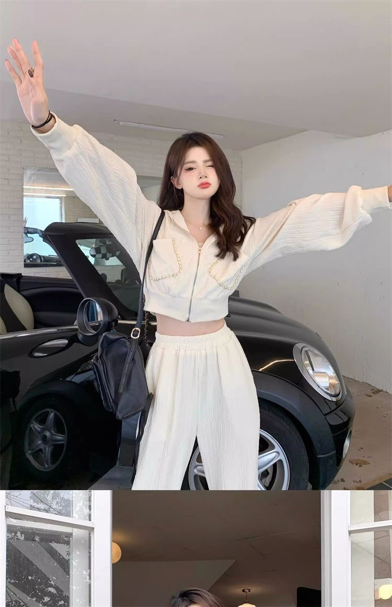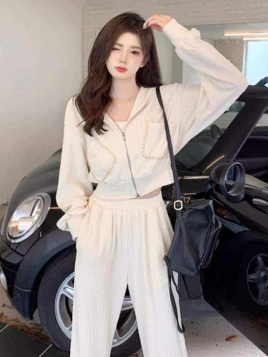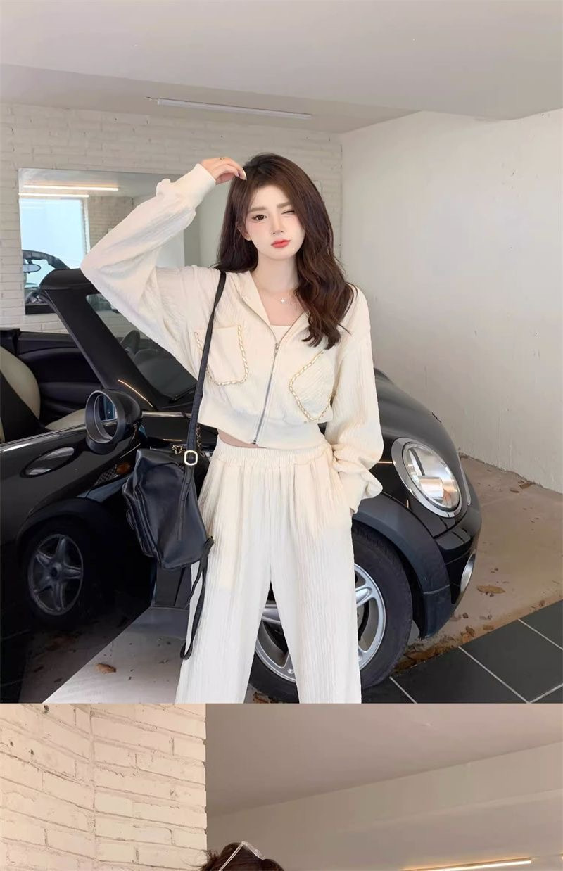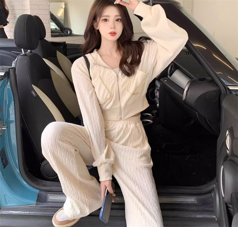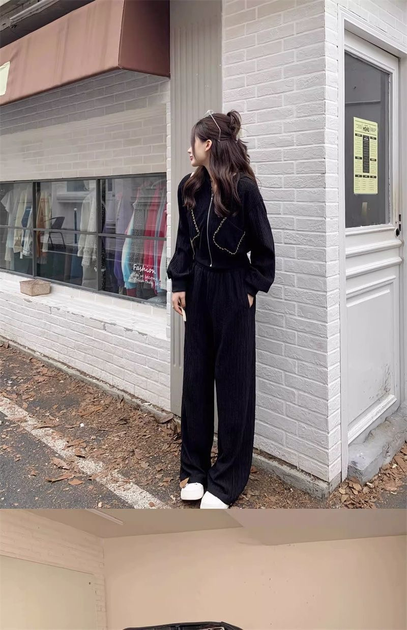 가을과 겨울의 새로운 여성 의류 샤넬 스타일 캐주얼 스포츠 세트 고급 소금 후드 스웨터 와이드 레그 팬츠 투피스 세트스토어 가기