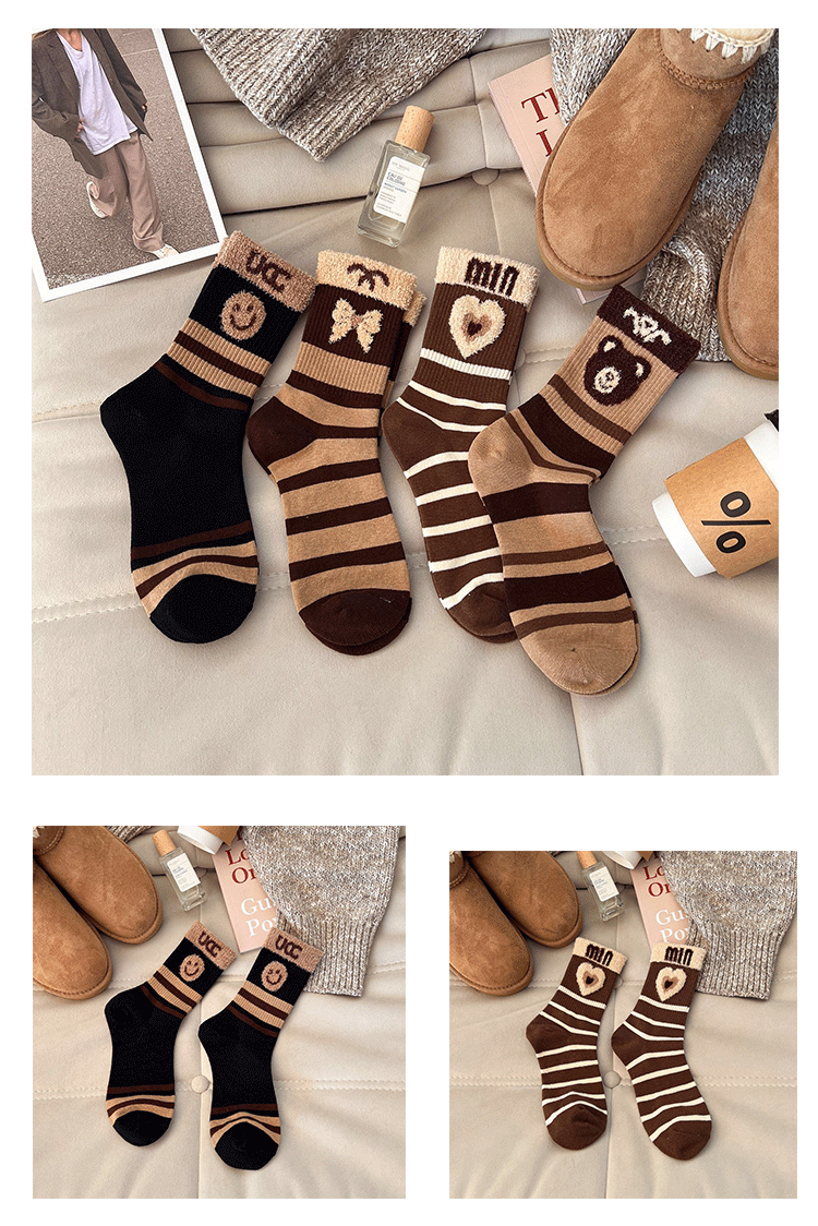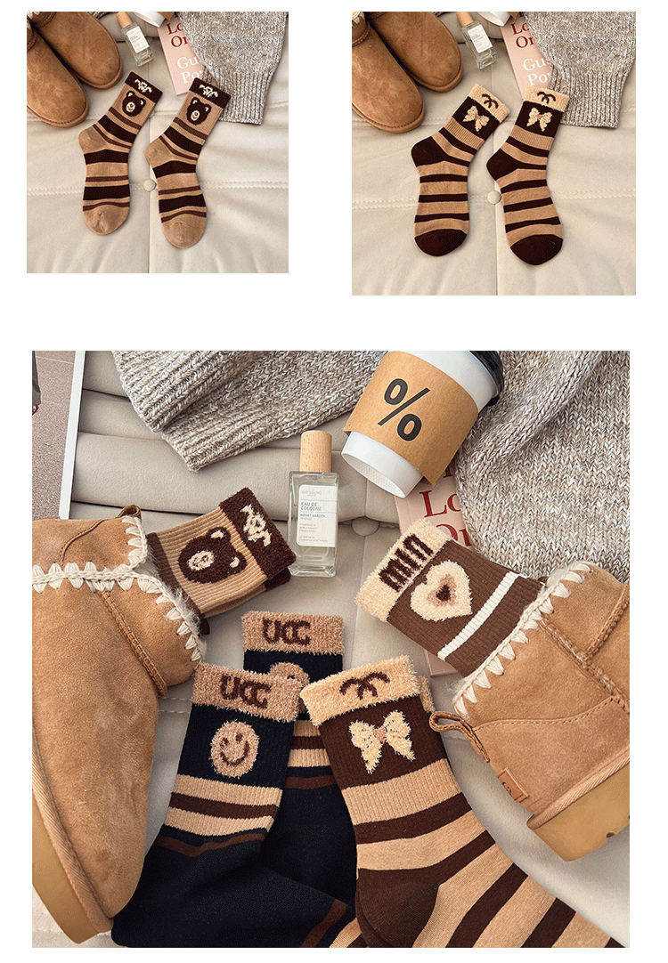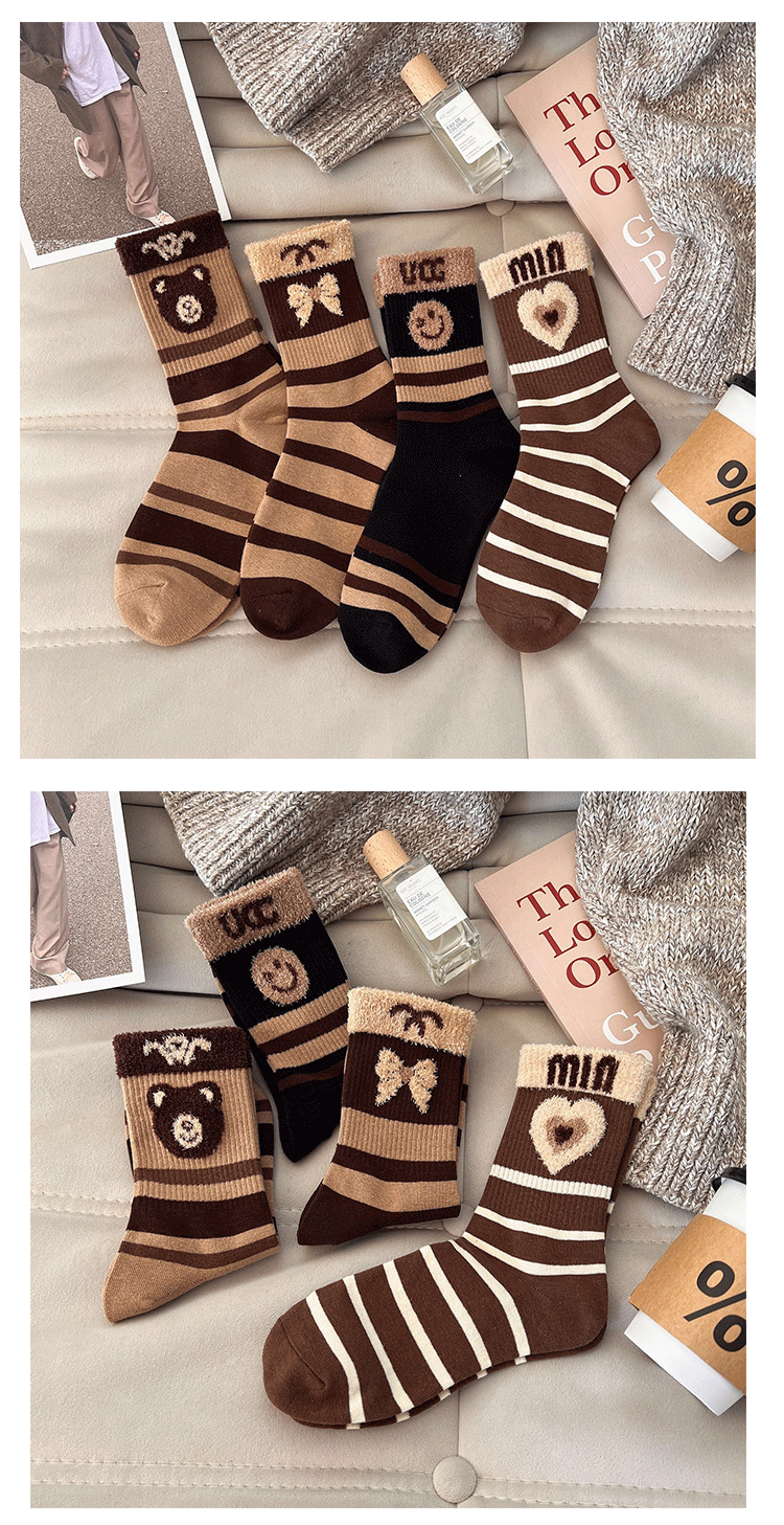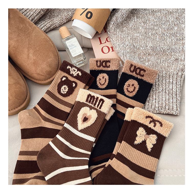 Jisixiang 양말 여성의 가을과 겨울 새로운 한국식 곰 중반 송아지 양말 빗질면 Maillard 여성 양말 그물 레드 패션 양말스토어 가기