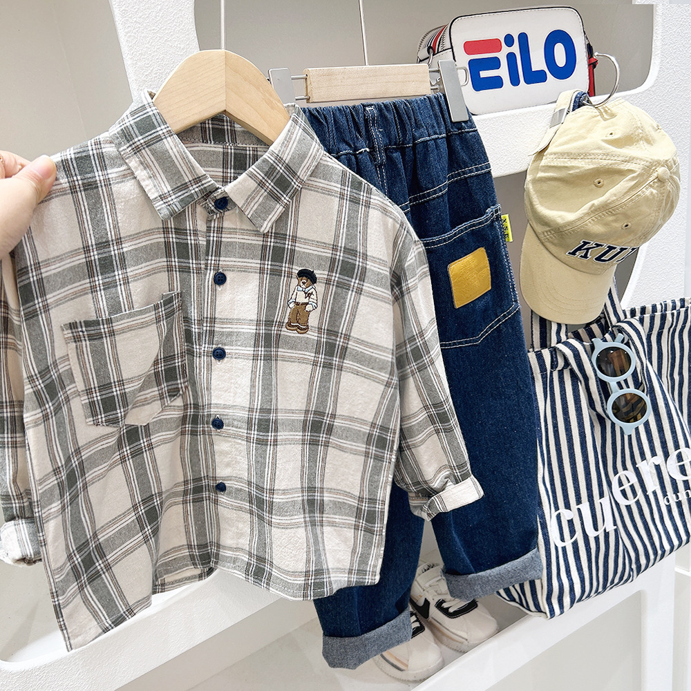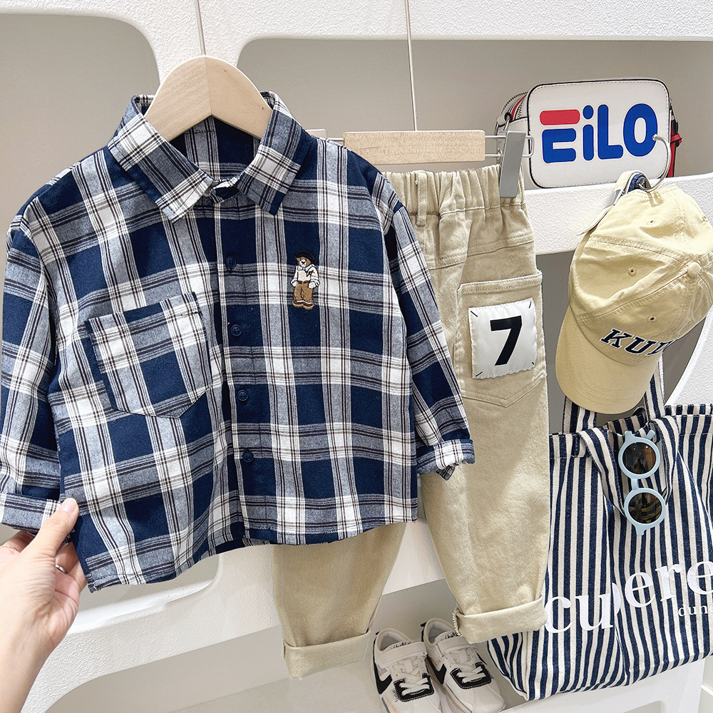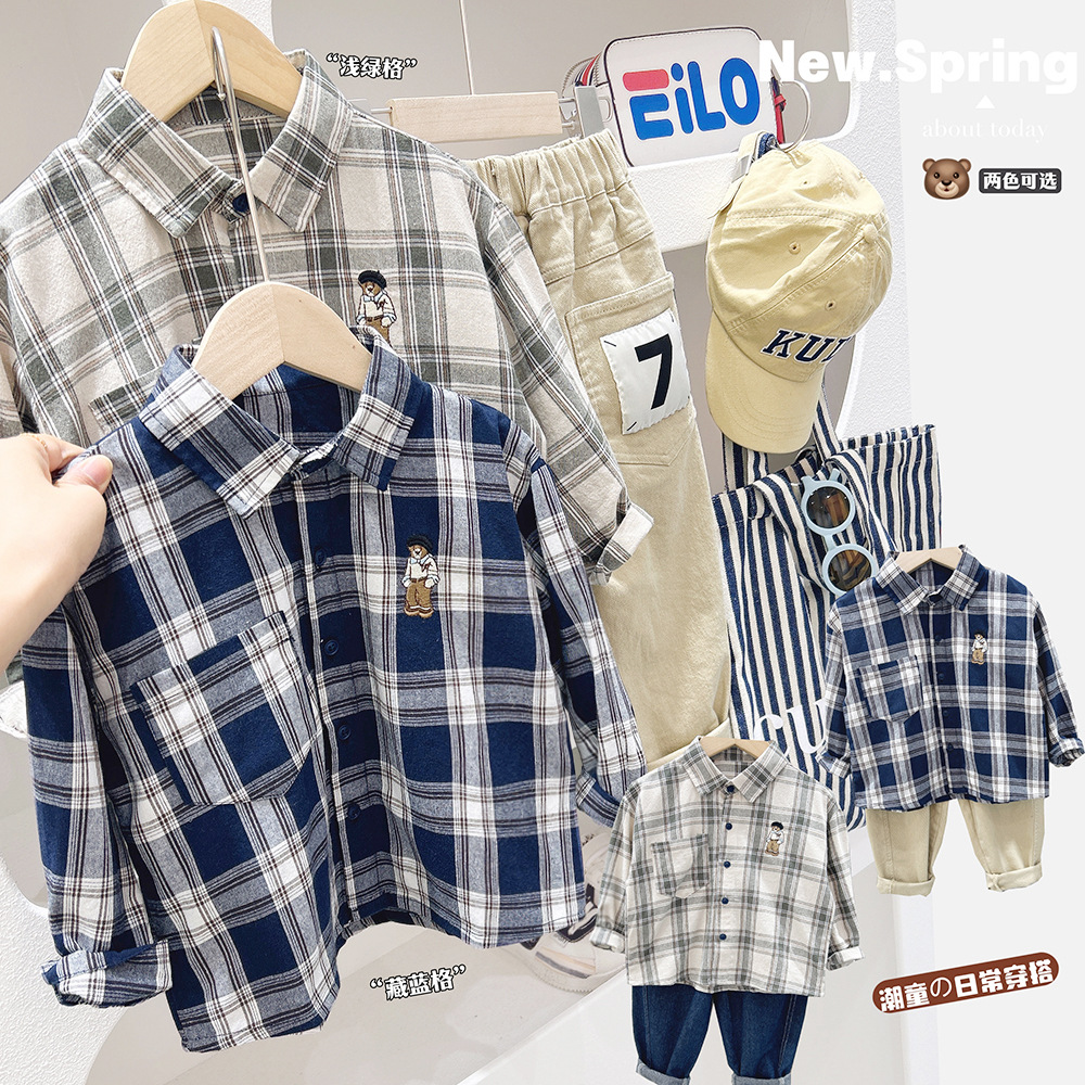 한국 스타일 격자 무늬 어린이 셔츠 서양식 아기 만화 옷깃 상단 유행 봄 가을 어린이 의류 소년의 긴 소매 셔츠스토어 가기