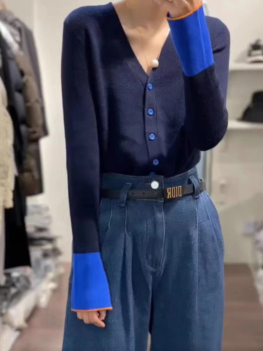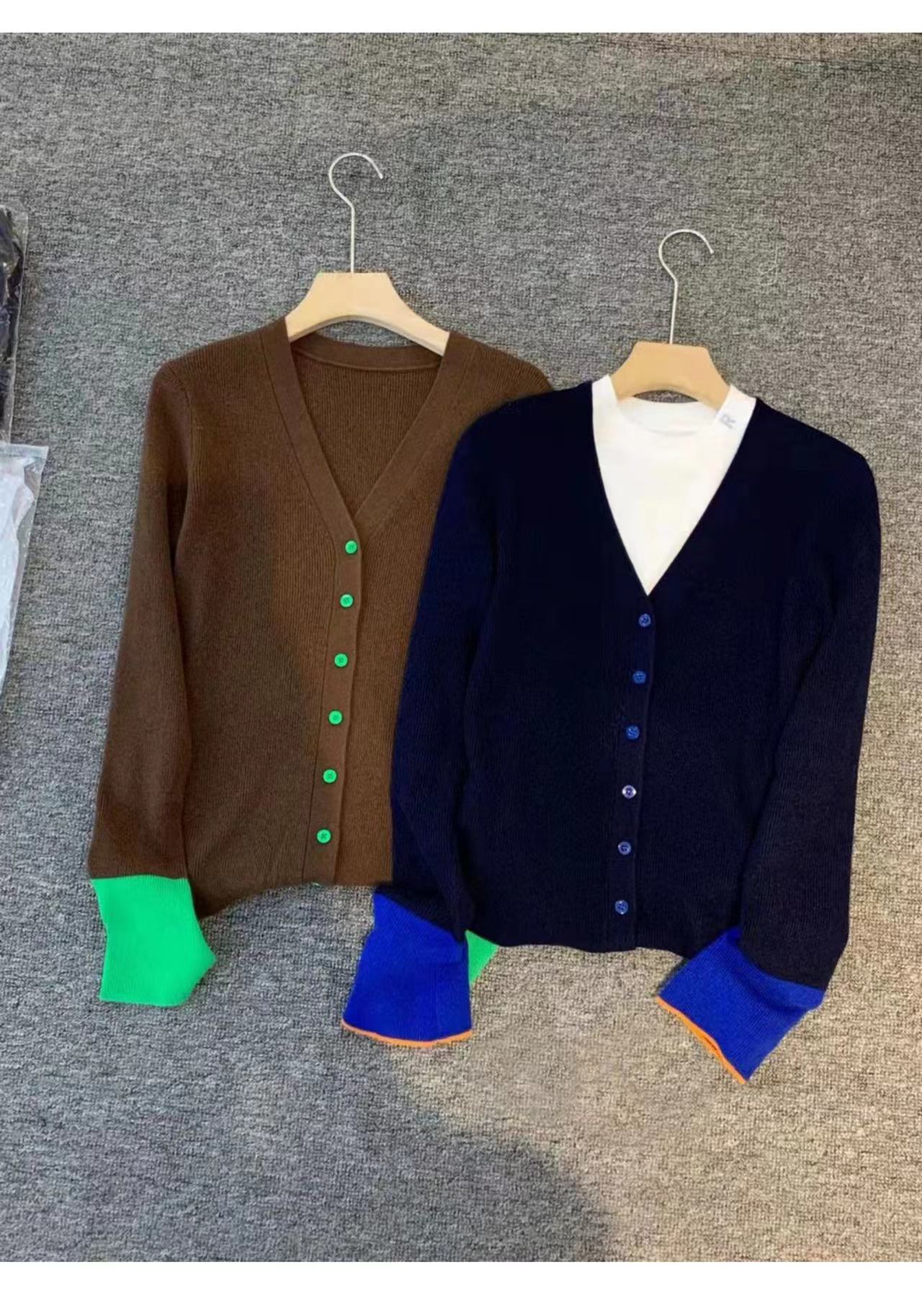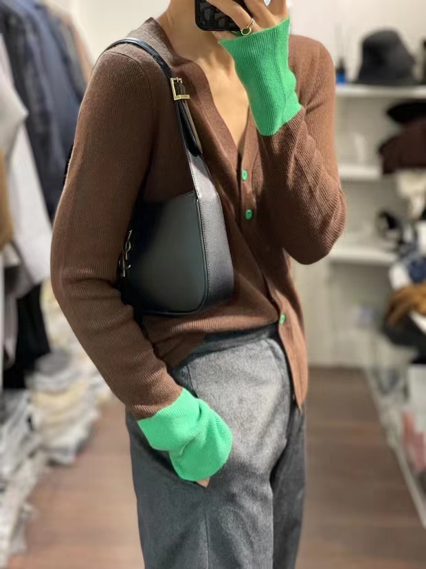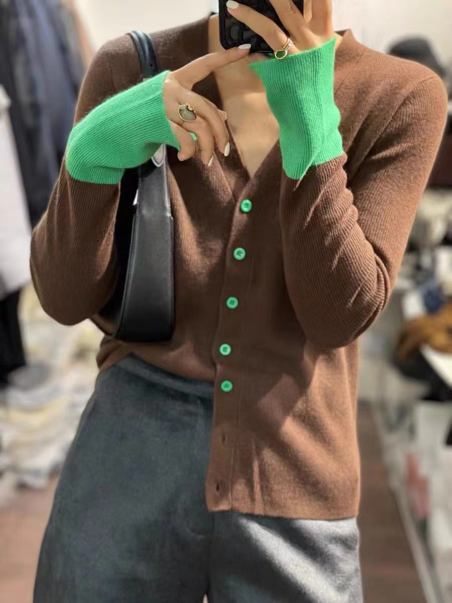 가을과 겨울 디자인 감각 틈새 시대 감소 대비 컬러 스티칭 니트 카디건 여성용 V-넥 울 스웨터 코트 겉옷스토어 가기