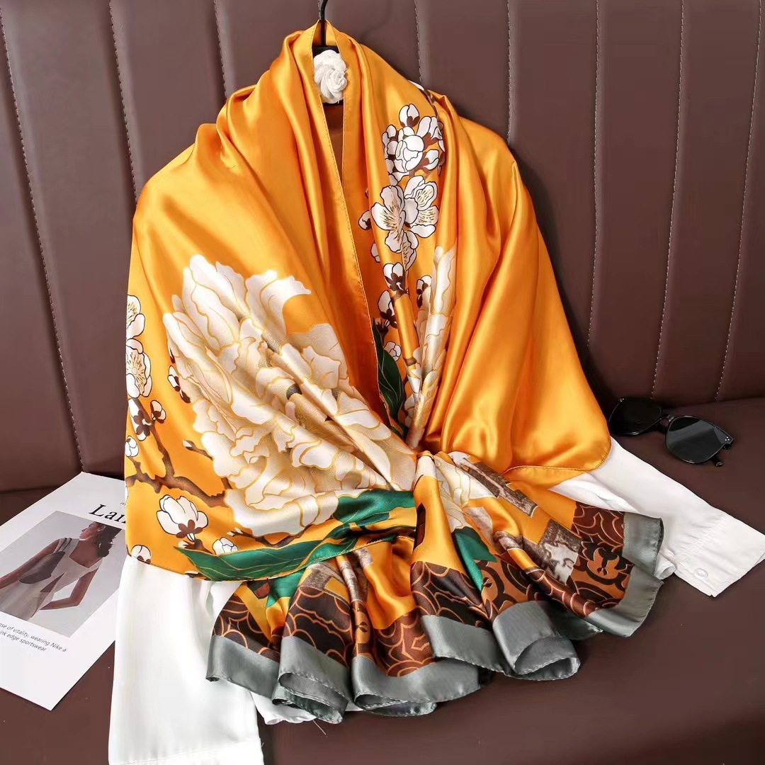 레트로 예술적 모란 꽃 인쇄 실크 스카프 브로케이드 새틴 긴 스카프 우아한 우아한 여성의 국가 스타일 목도리스토어 가기