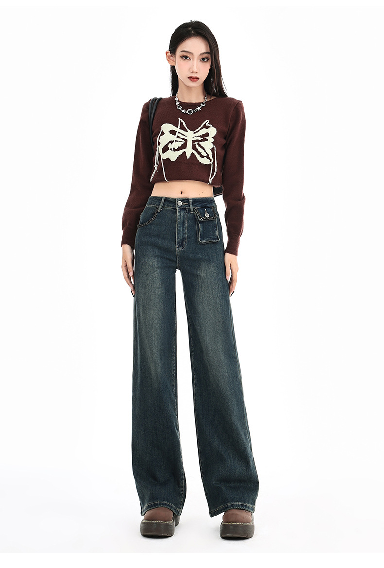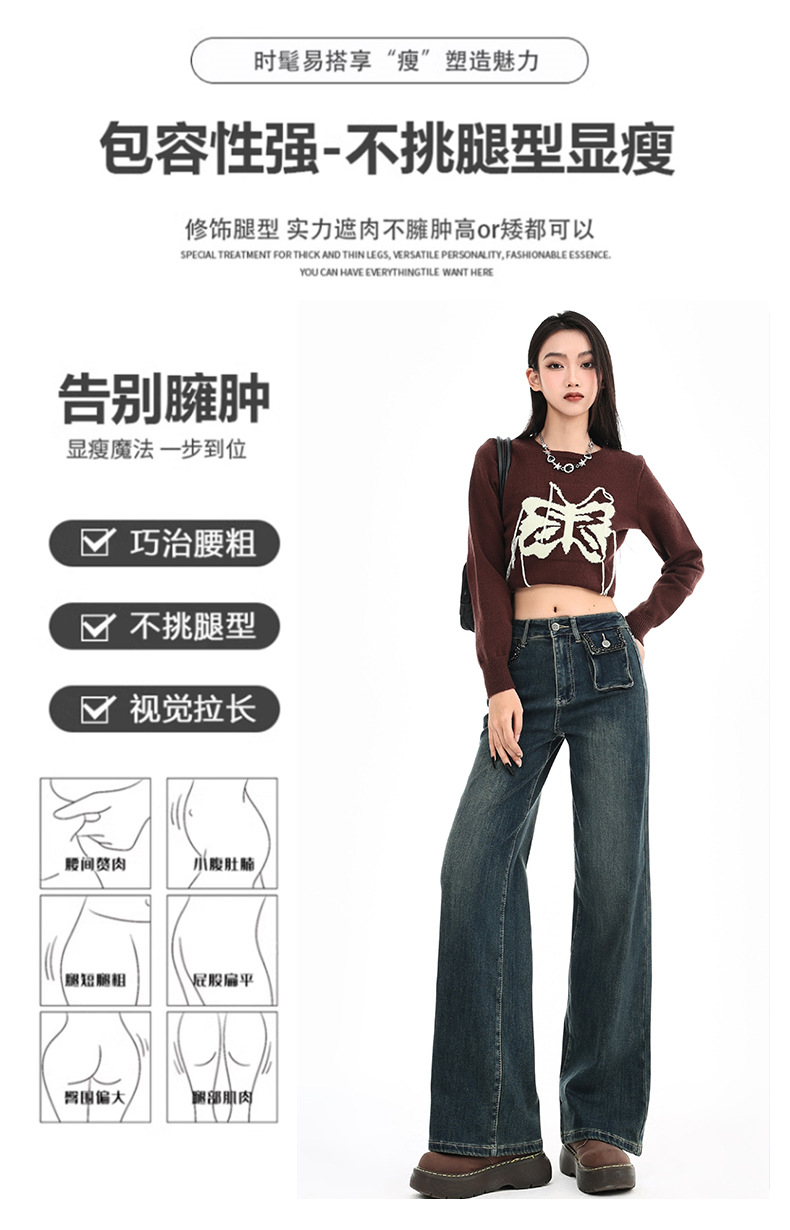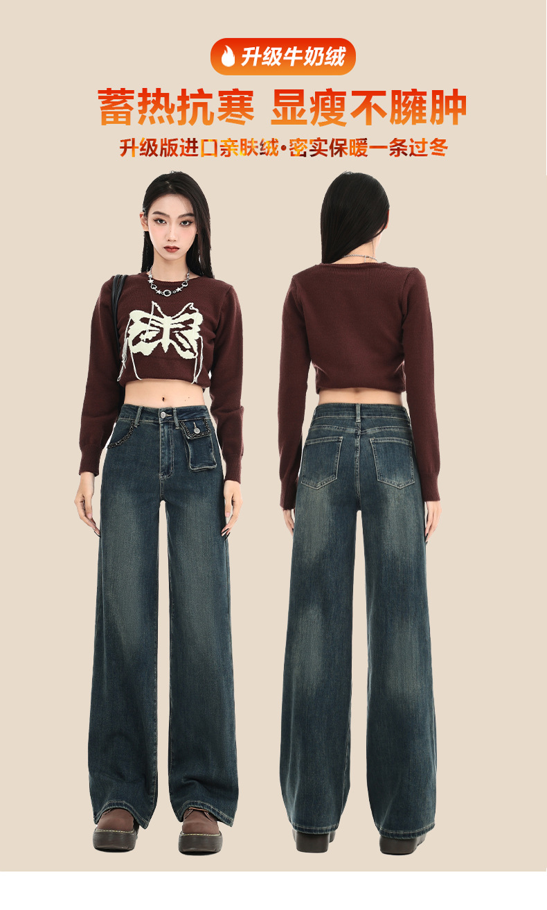 블루 그레이 기모 청바지 여성의 가을과 겨울 2024 새로운 중간 허리 슬리밍 작은 좁은 스트레이트 와이드 다리 바지스토어 가기