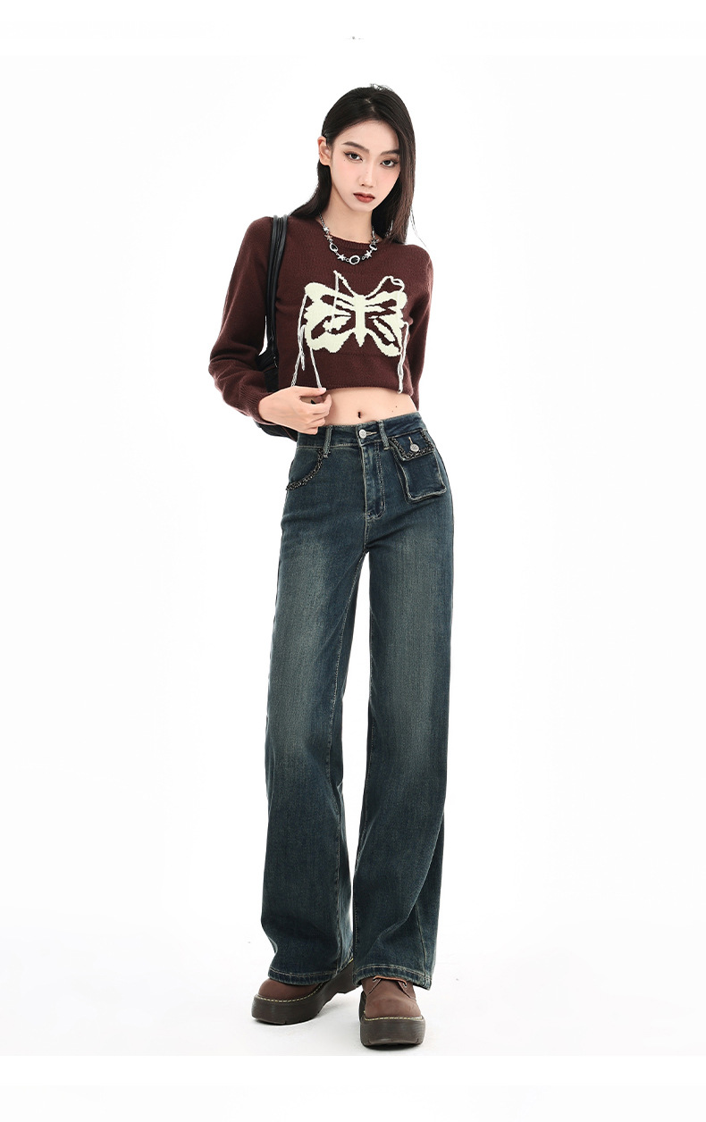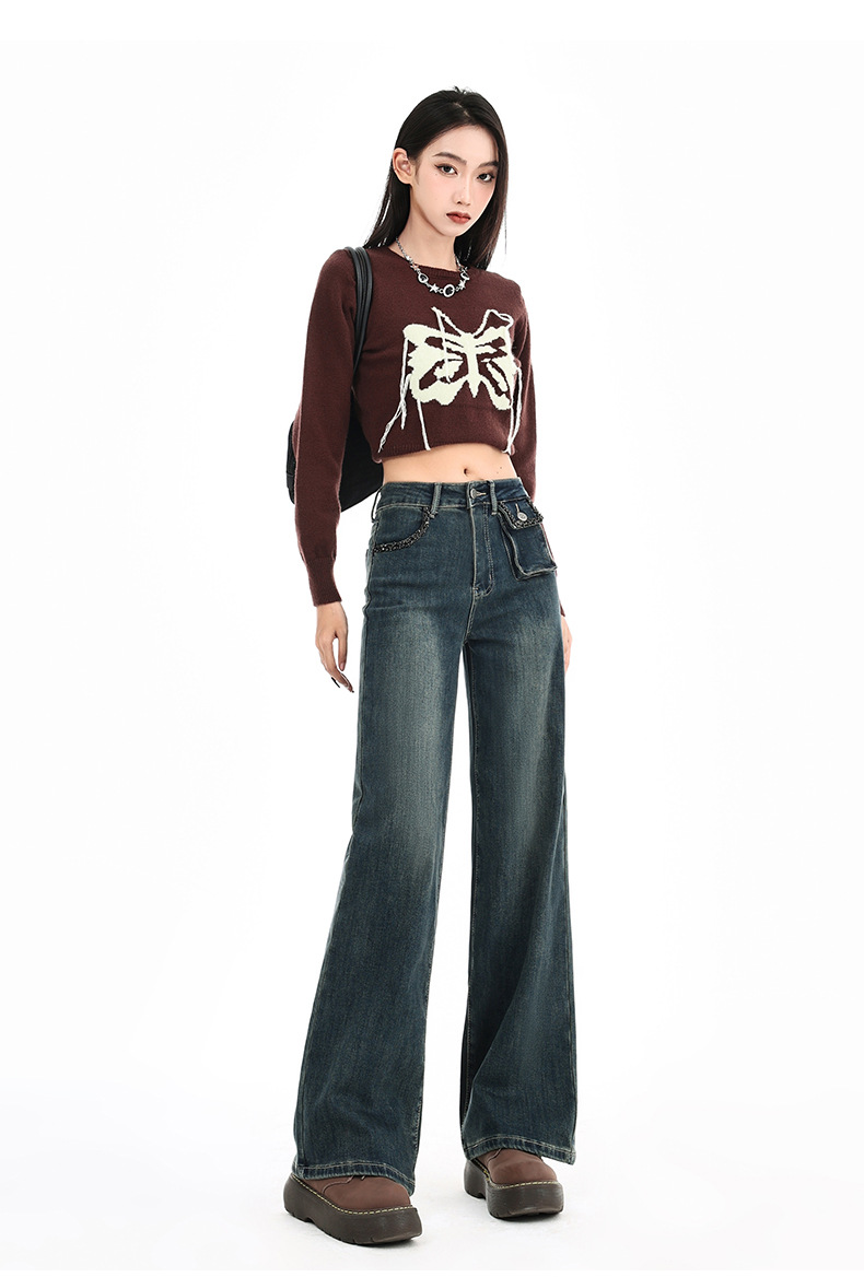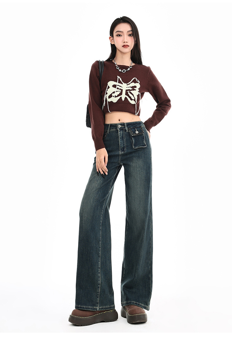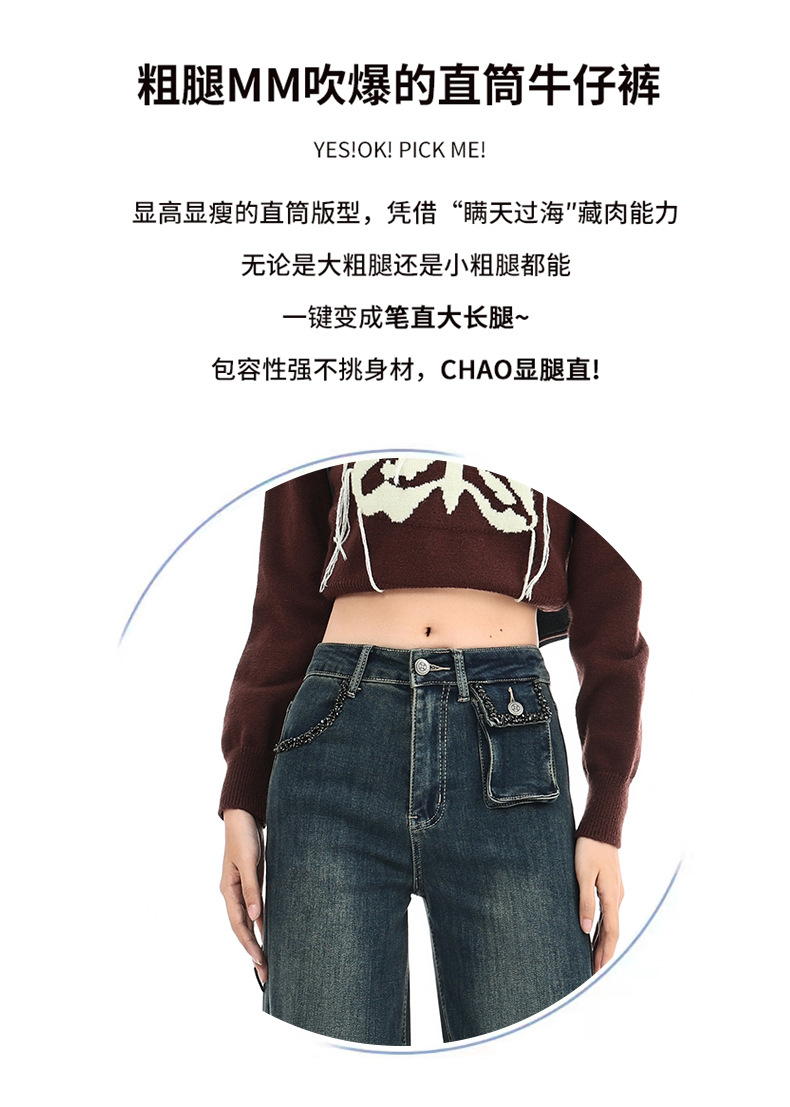 블루 그레이 기모 청바지 여성의 가을과 겨울 2024 새로운 중간 허리 슬리밍 작은 좁은 스트레이트 와이드 다리 바지스토어 가기