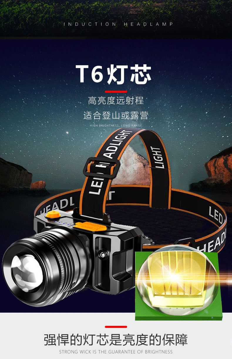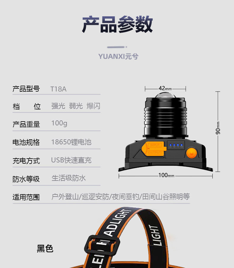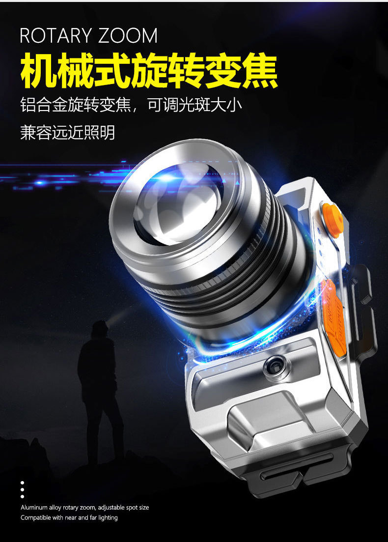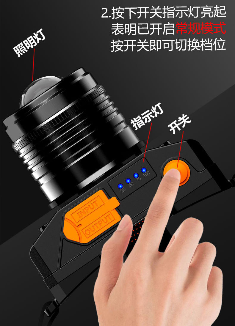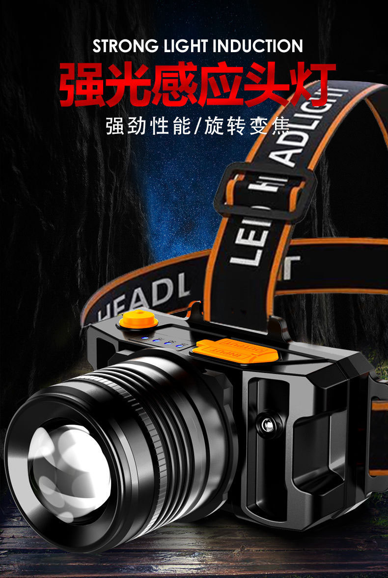 【工作档位】强光-弱光-爆闪-侧灯-侧灯主灯全亮(按感应开关主灯感应)