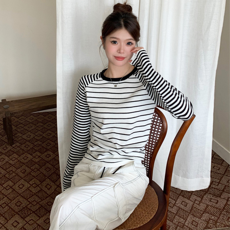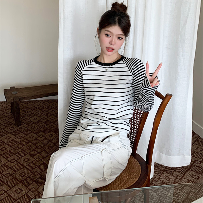 가을과 겨울 새로운 한국 스타일 게으른 스타일 둥근 목 복고풍 대비 색상 줄무늬 긴 소매 여성용 내부 탑 올 매칭스토어 가기