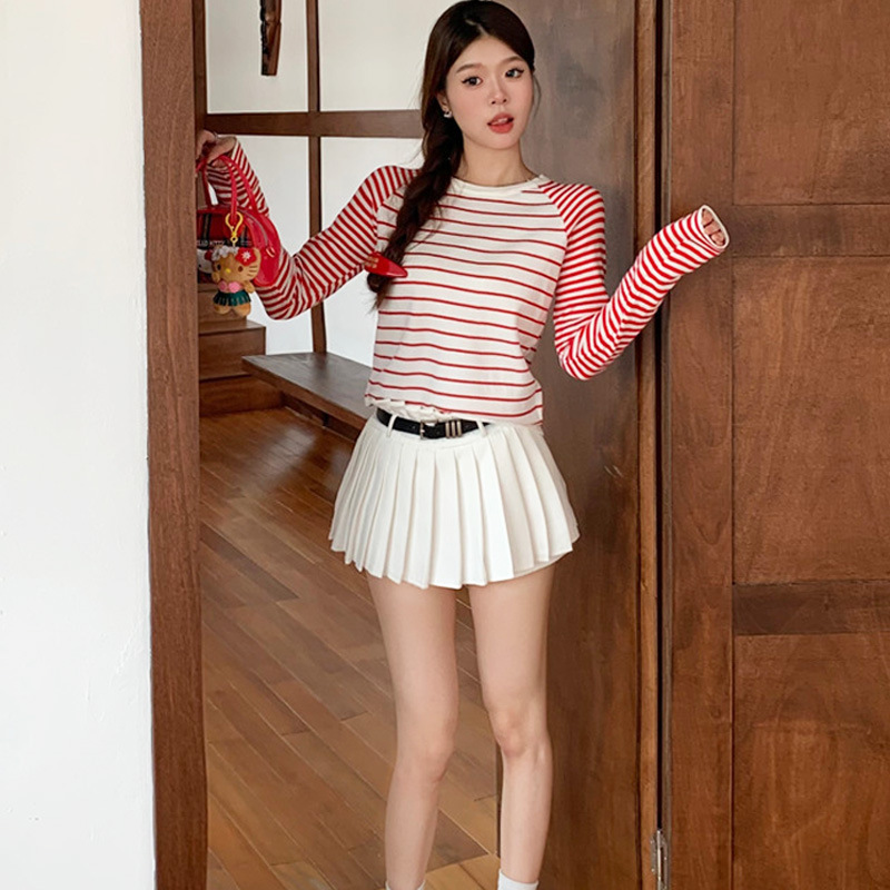 가을과 겨울 새로운 한국 스타일 게으른 스타일 둥근 목 복고풍 대비 색상 줄무늬 긴 소매 여성용 내부 탑 올 매칭