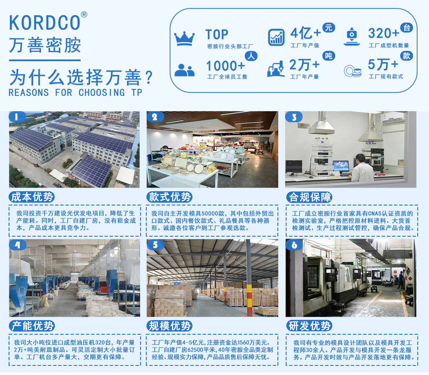 万善工厂配备320台多种吨位成型机、220台研磨设备(含15台自动化研磨设备),并拥有15人的专业设计团队及40人的专职质检团队。依托20台CNC模具加工中心,我们实现了自主绘图建模与模具开发一体化,模具库储备成熟器型超五万款。基于强大的生产与研发能力,我司定制灵活,可高效承接各类规模订单,品质可靠,欢迎垂询合作!