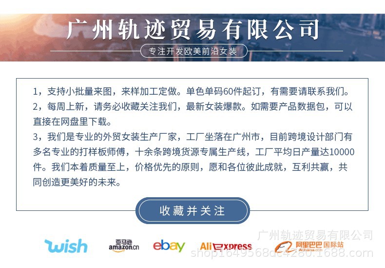 我们专业生产跨境女装,包含亚马逊爆款女装,ebay热卖女装,Wish、速卖通爆款等适合国外消费者的女装,线上适合亚马逊、速卖通、WISH、敦煌网、独立站等平台。由于产品尺码为欧码或者美码,国内淘宝等平台不建议销售。