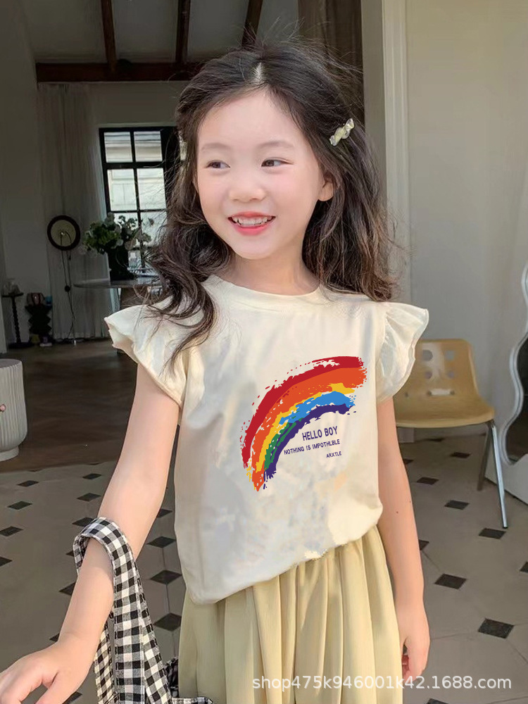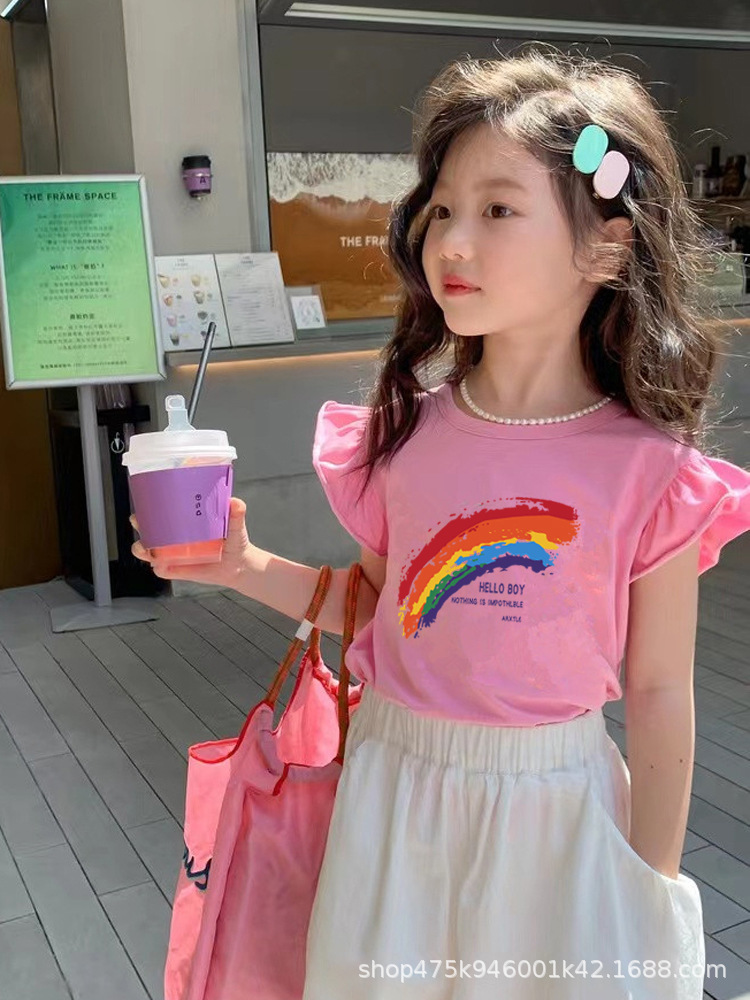 도매 국경 소녀들의 작은 비행 소매면 탑 어린이 서양식 얇은 티셔츠 소녀 아기 둥근 목 티셔츠 여름