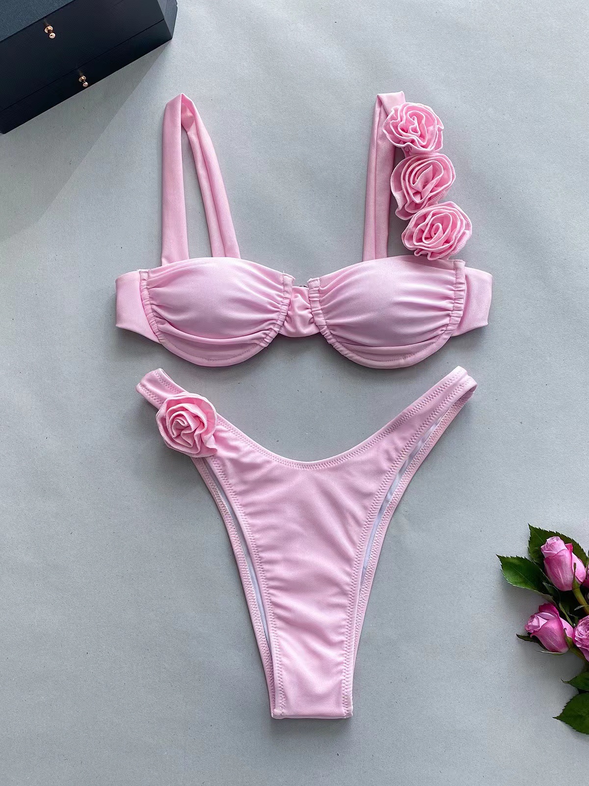 2024 패션 새로운 비키니 유럽과 미국의 비키니 단색 크로스 보더 스틸 브래킷 입체 꽃 스플릿 여성용 수영복스토어 가기