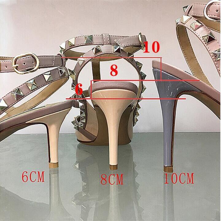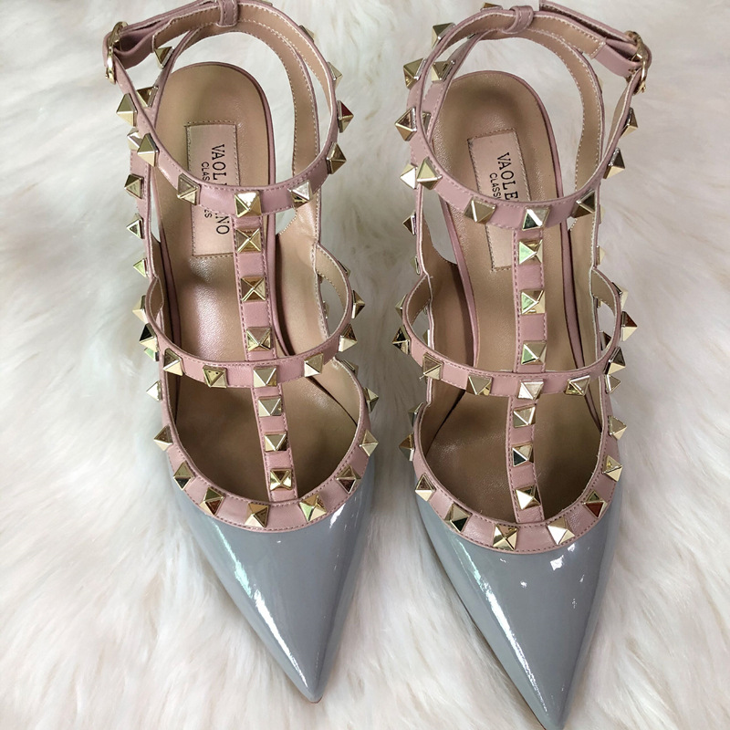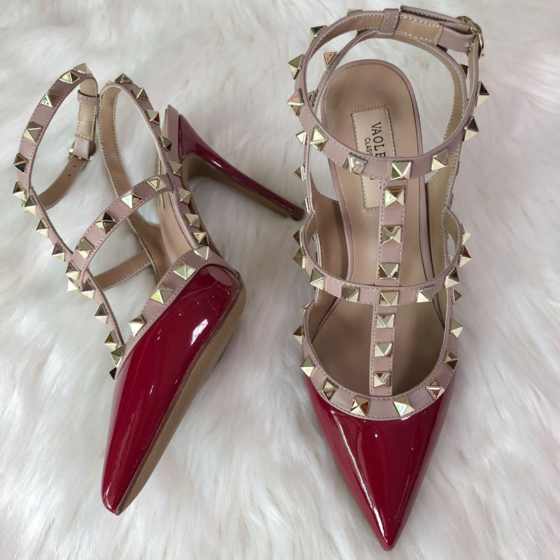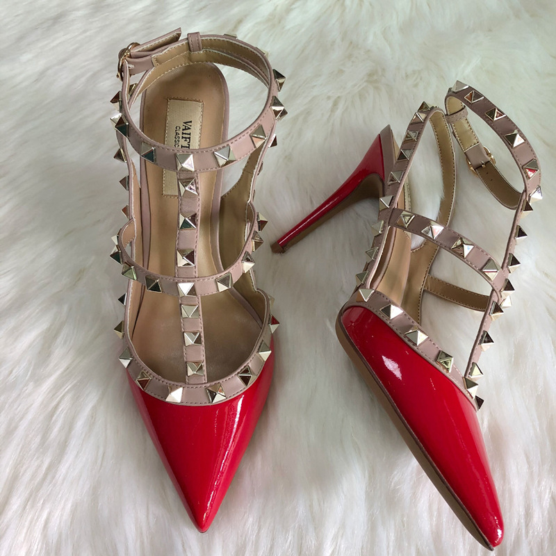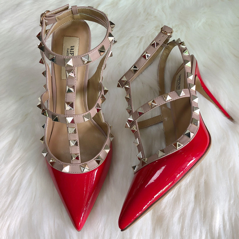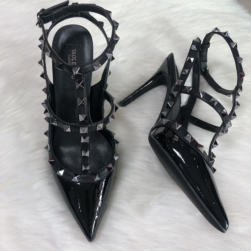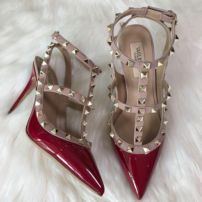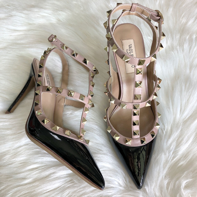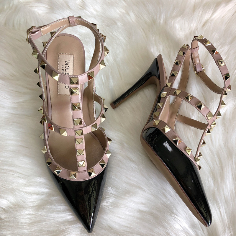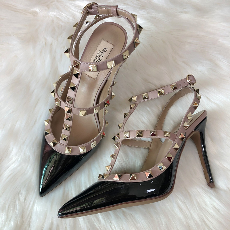 발렌티노 하이힐 여성 리벳, 2 스트랩 3 스트랩 가죽 특허 가죽 스틸레토 힐 버들 여름 샌들 여성스토어 가기