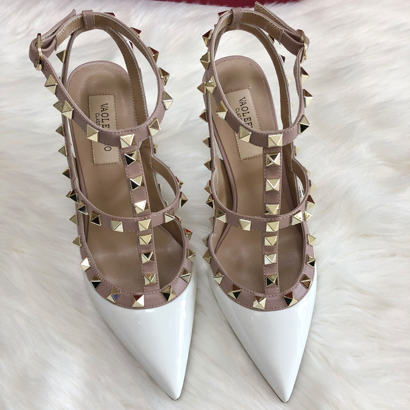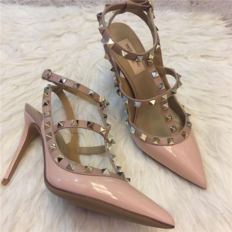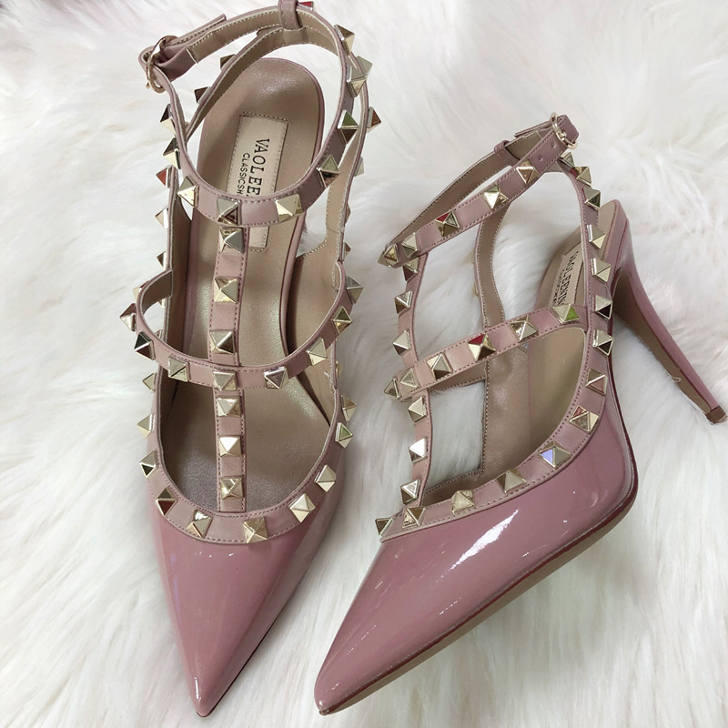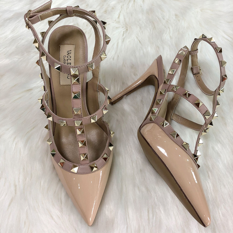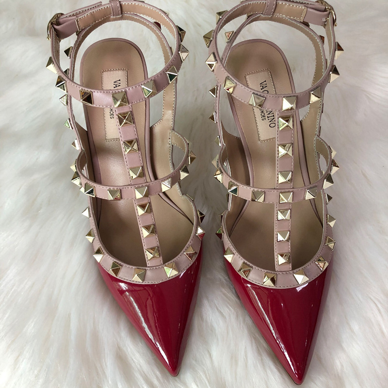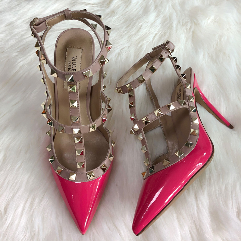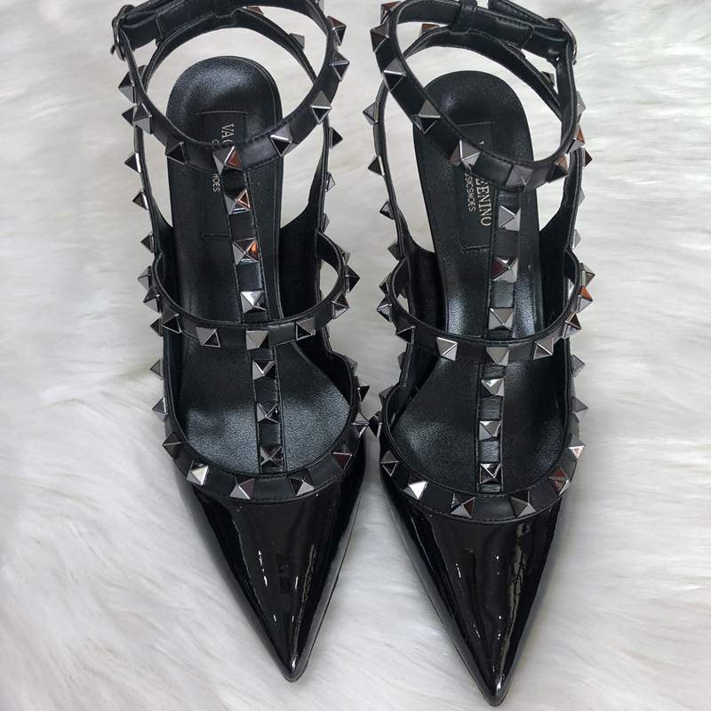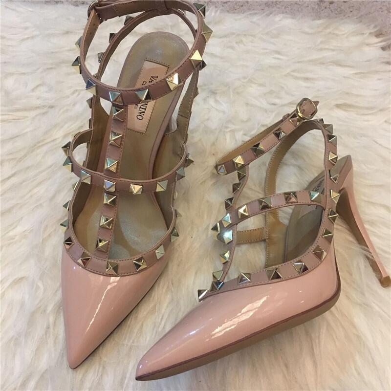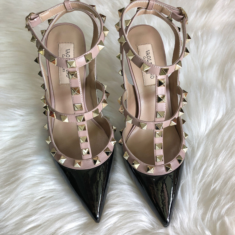 발렌티노 하이힐 여성 리벳, 2 스트랩 3 스트랩 가죽 특허 가죽 스틸레토 힐 버들 여름 샌들 여성스토어 가기