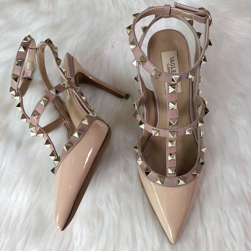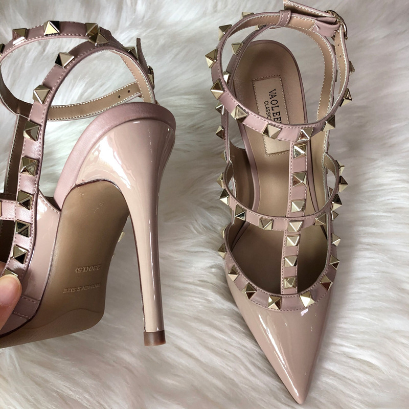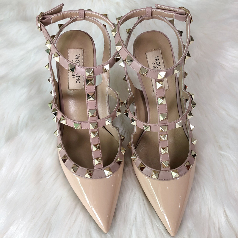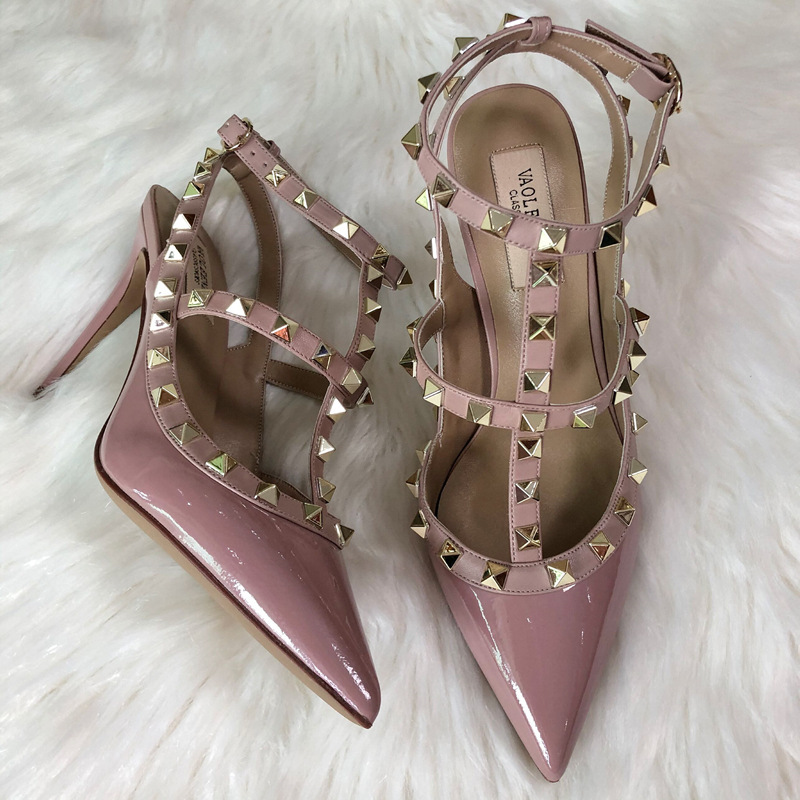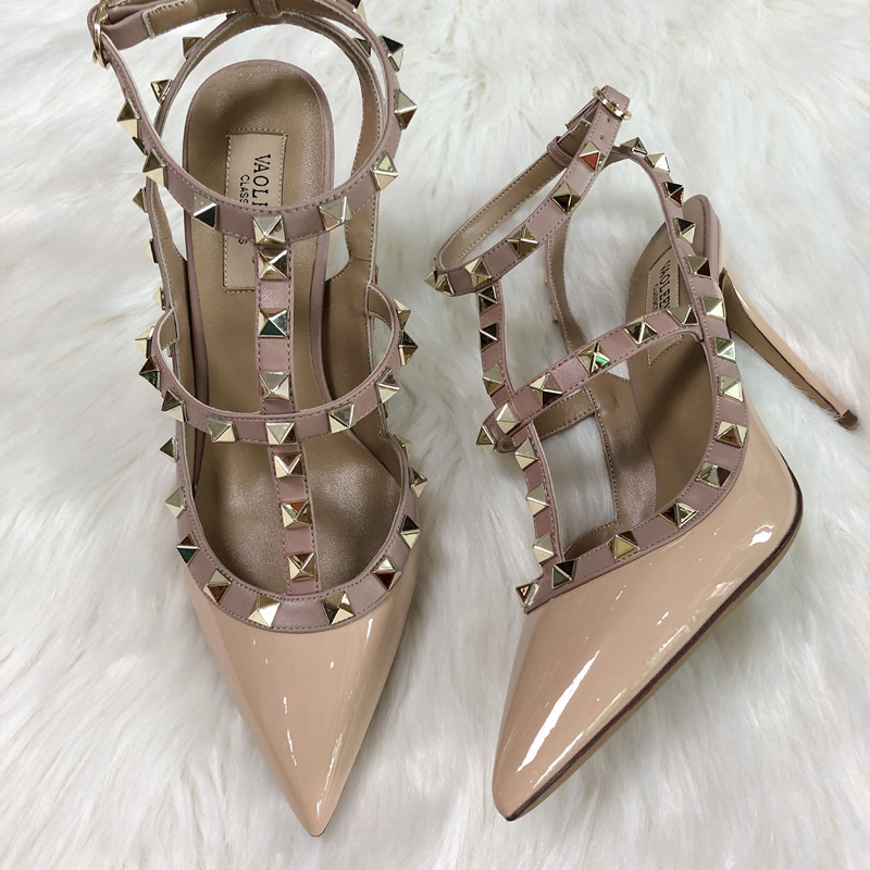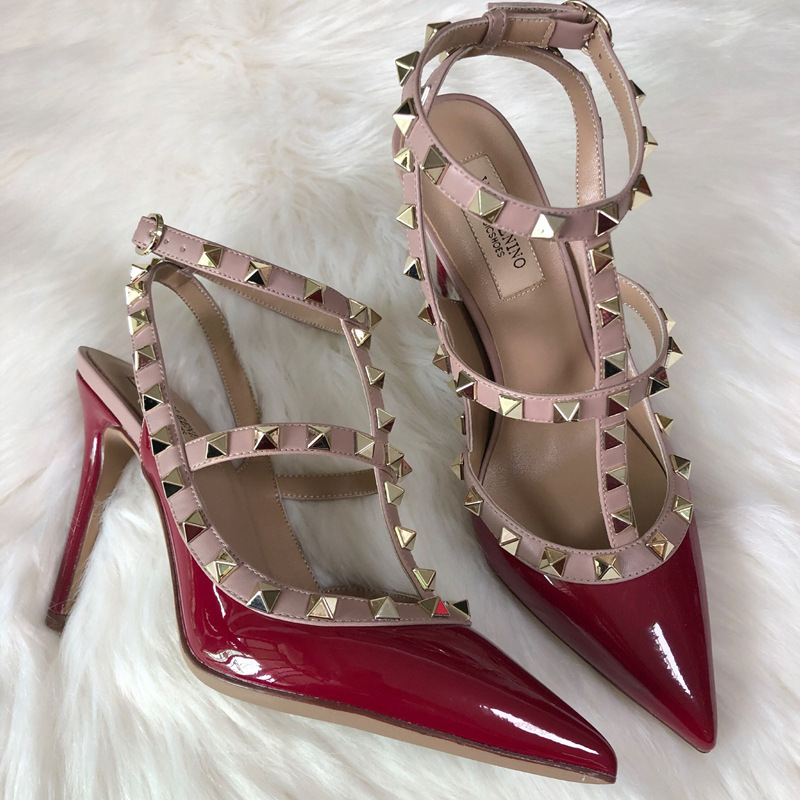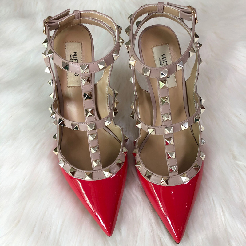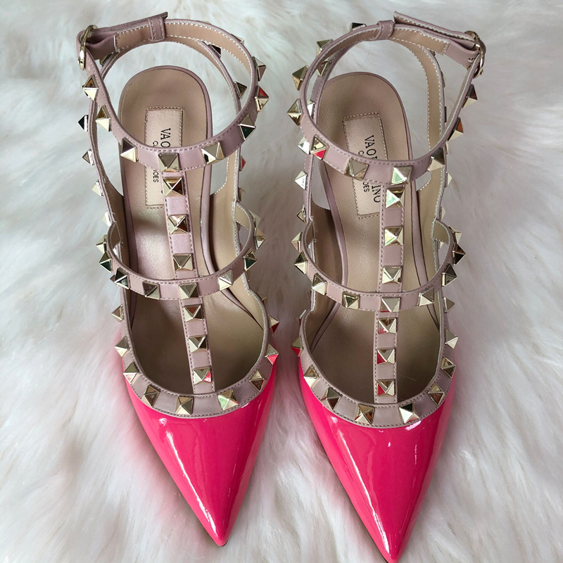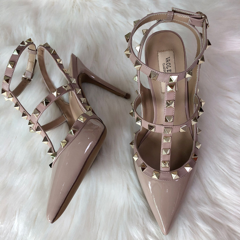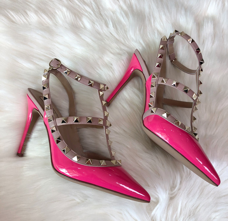발렌티노 하이힐 여성 리벳, 2 스트랩 3 스트랩 가죽 특허 가죽 스틸레토 힐 버들 여름 샌들 여성스토어 가기