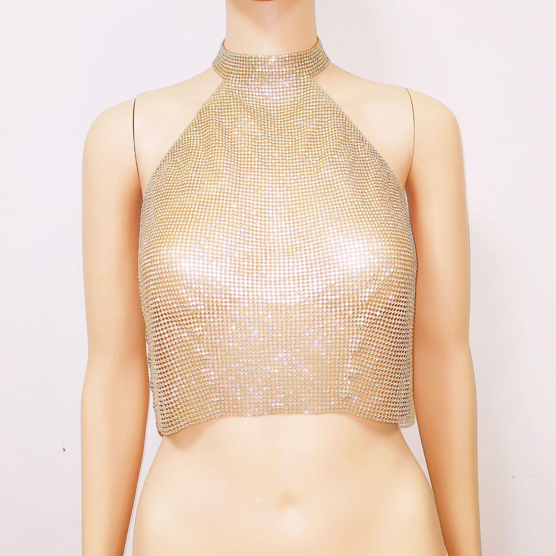 아마존 레트로 메탈 다이아몬드 섹시한 핫 걸 스카프 오프 숄더 민소매 허리 트리밍 여성 최고의 나이트 클럽 고삐 조끼