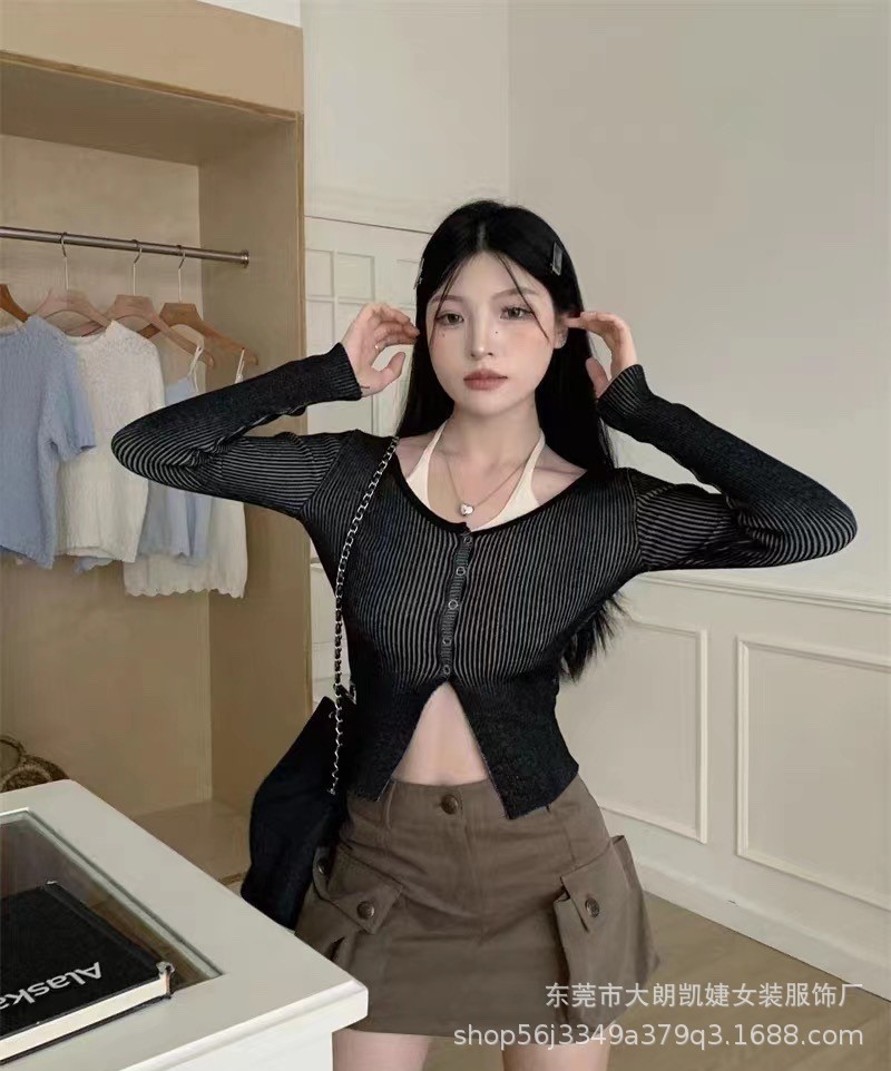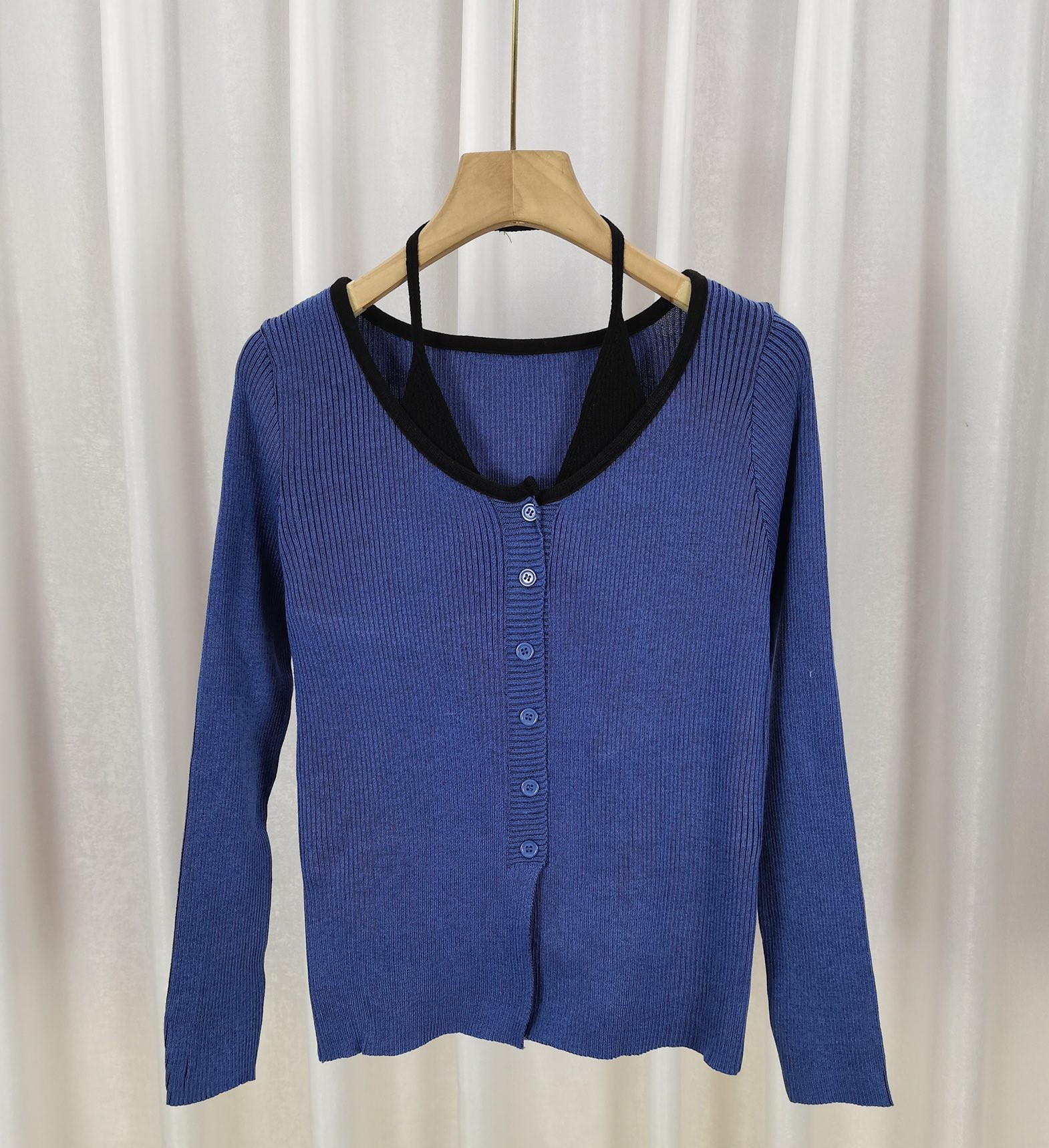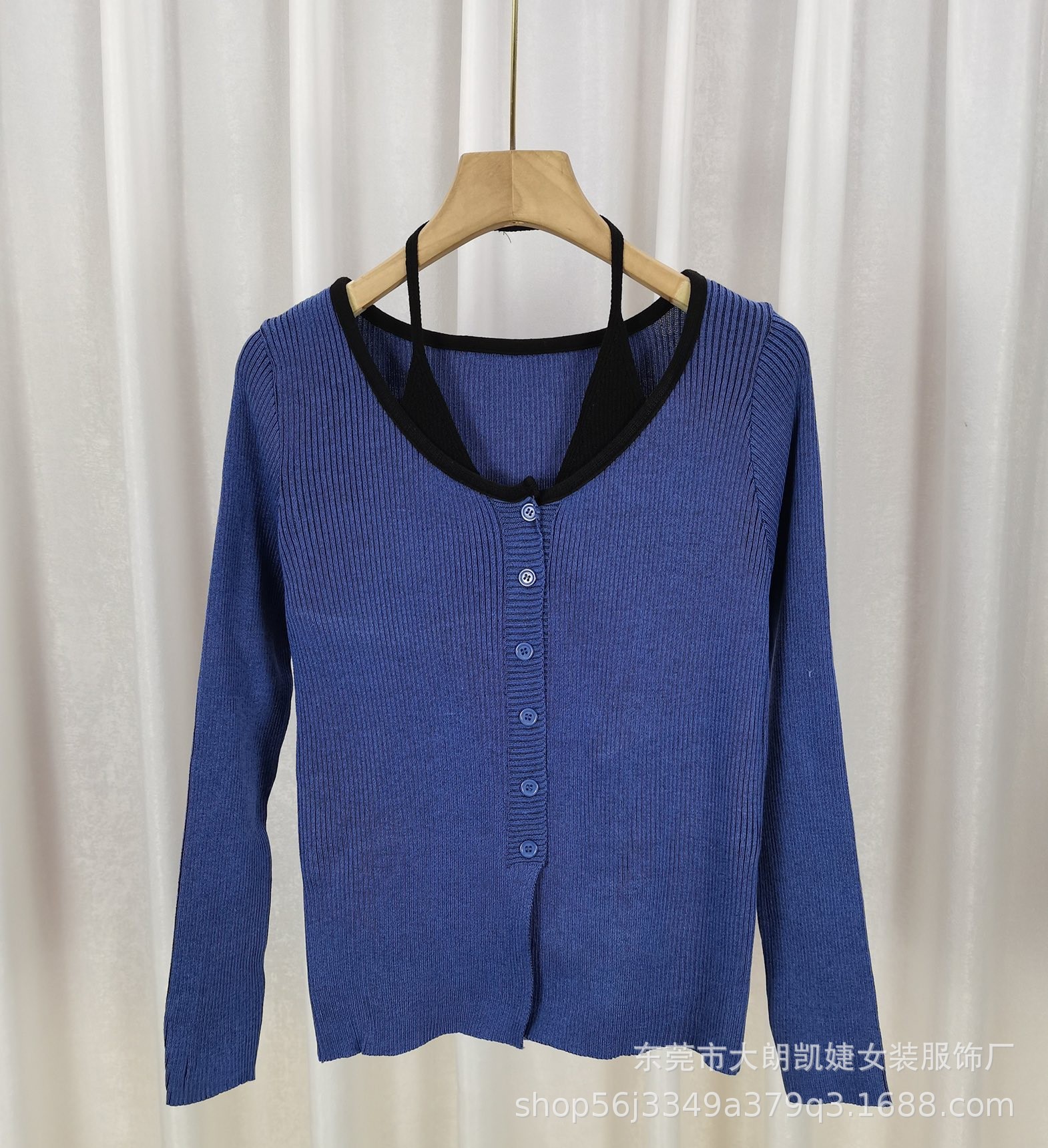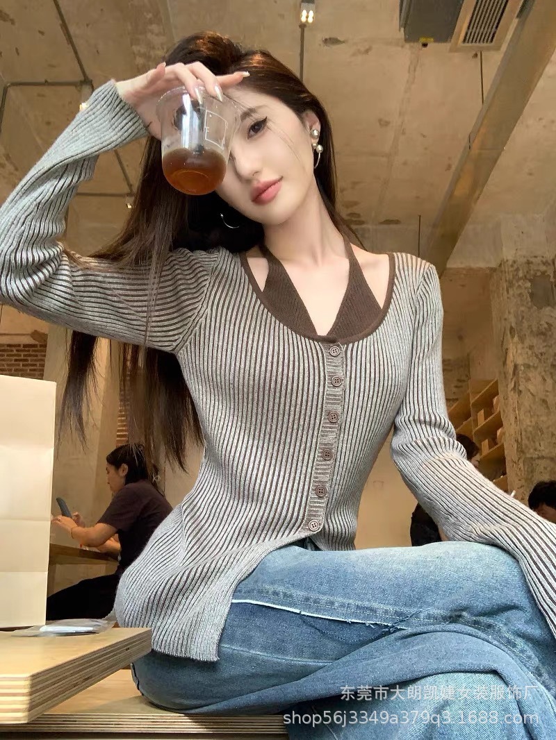2023 가을과 겨울 디자인 슬림 핏 슬리밍 탑 프랑스 가짜 투피스 스트라이프 홀터 긴 소매 스웨터 여성용스토어 가기